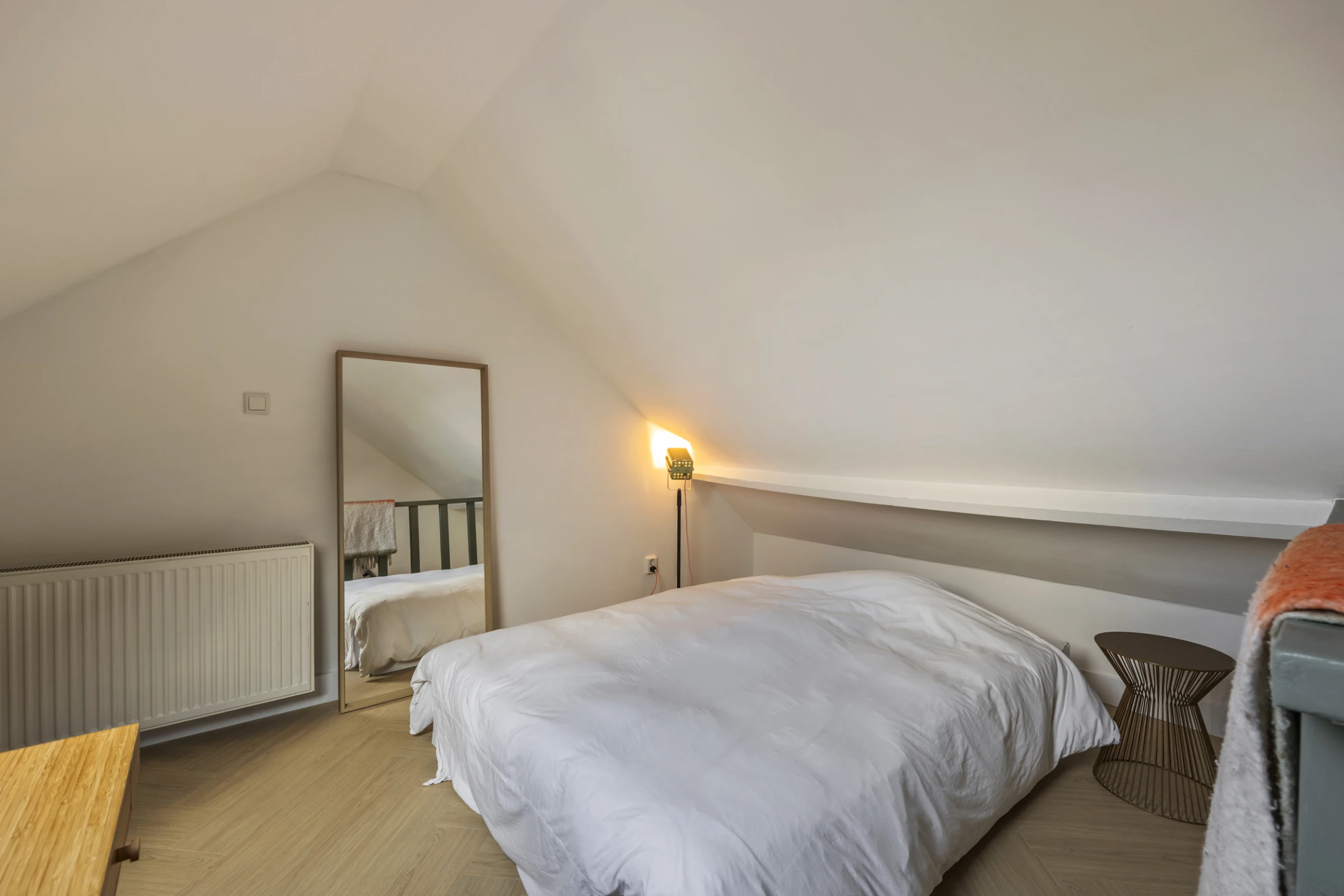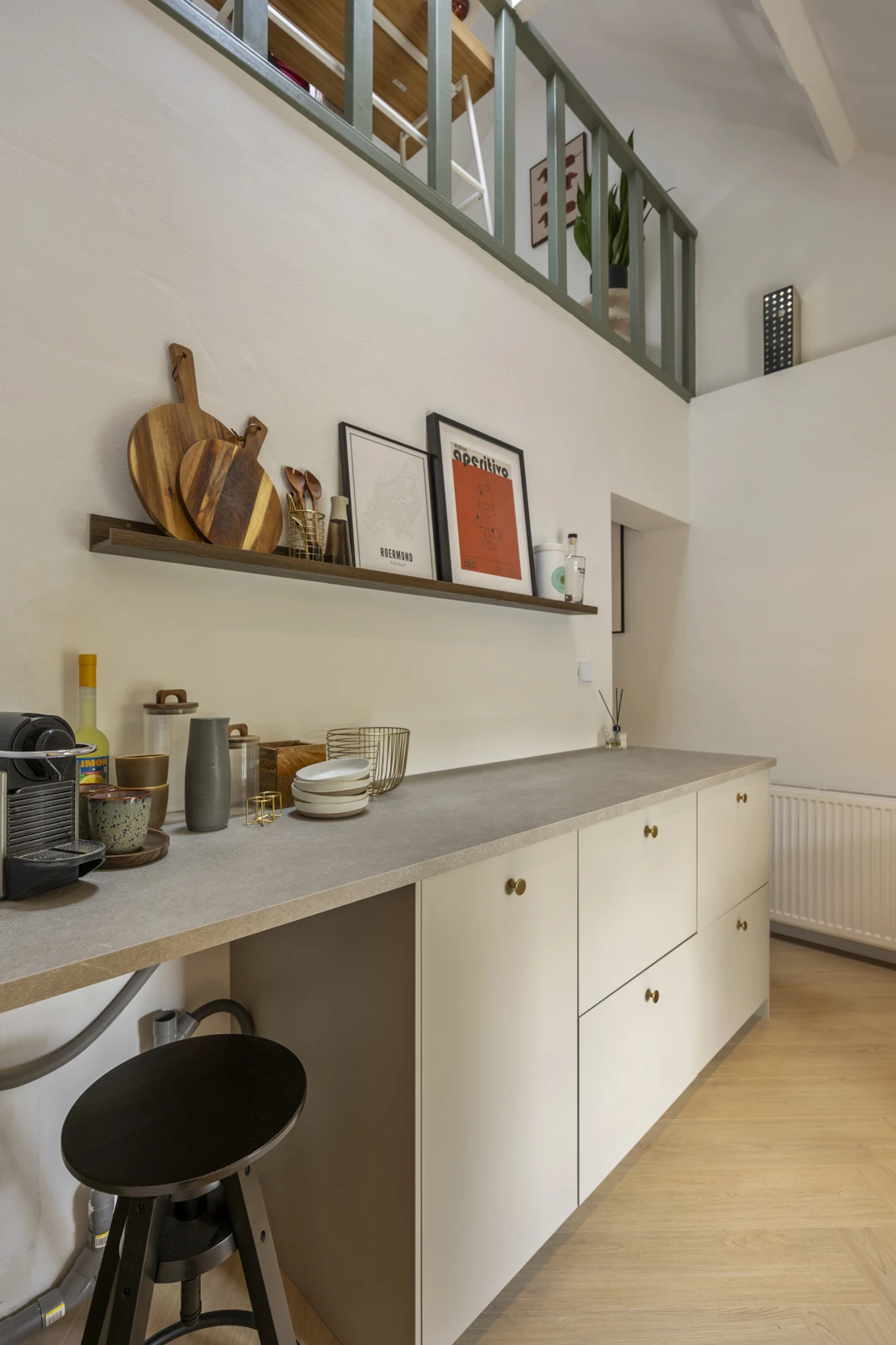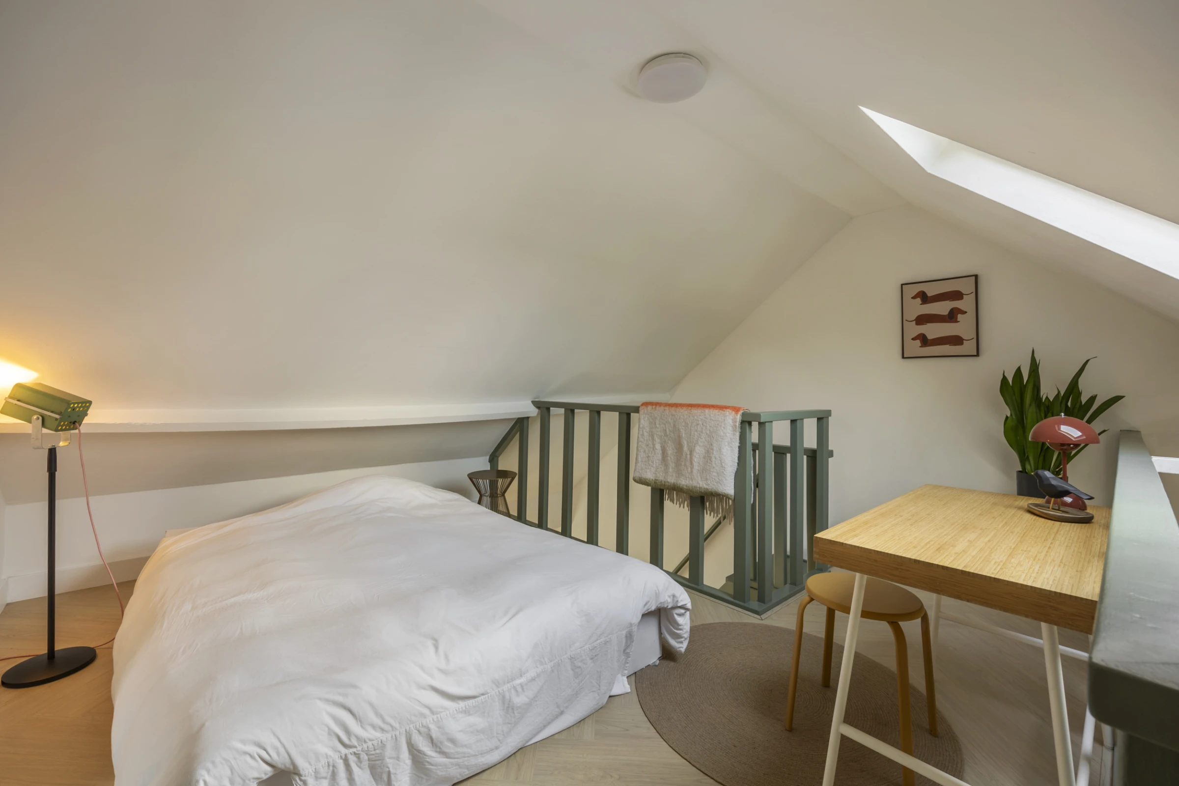 Via een trap vanuit de woonkamer is de entresol te bereiken, waar het slaapgedeelte is gelegen. Hier heb je genoeg plek voor een 2-persoonsbed en door het grote dakraam, heb je ook hier een mooie lichtinval.