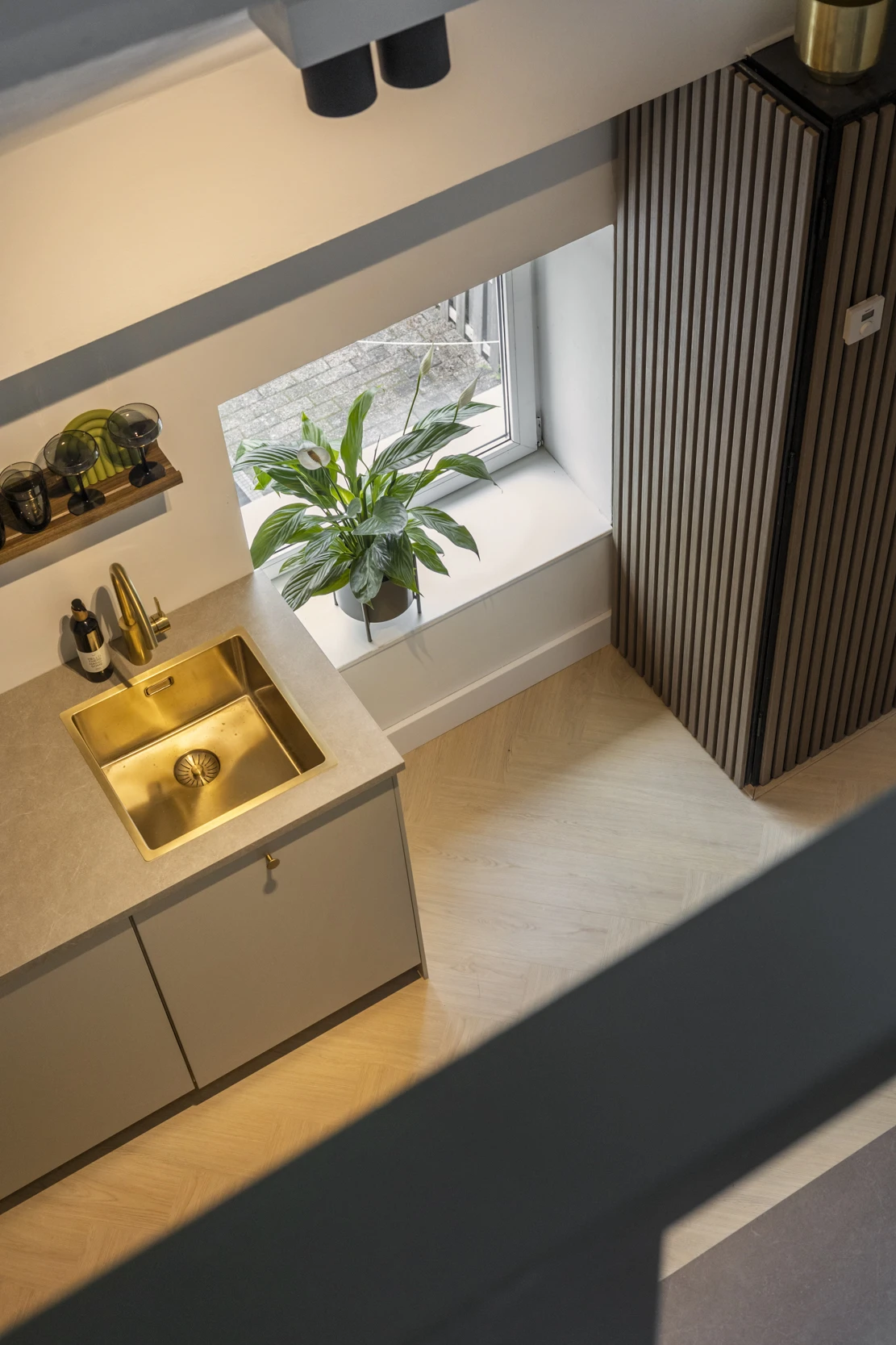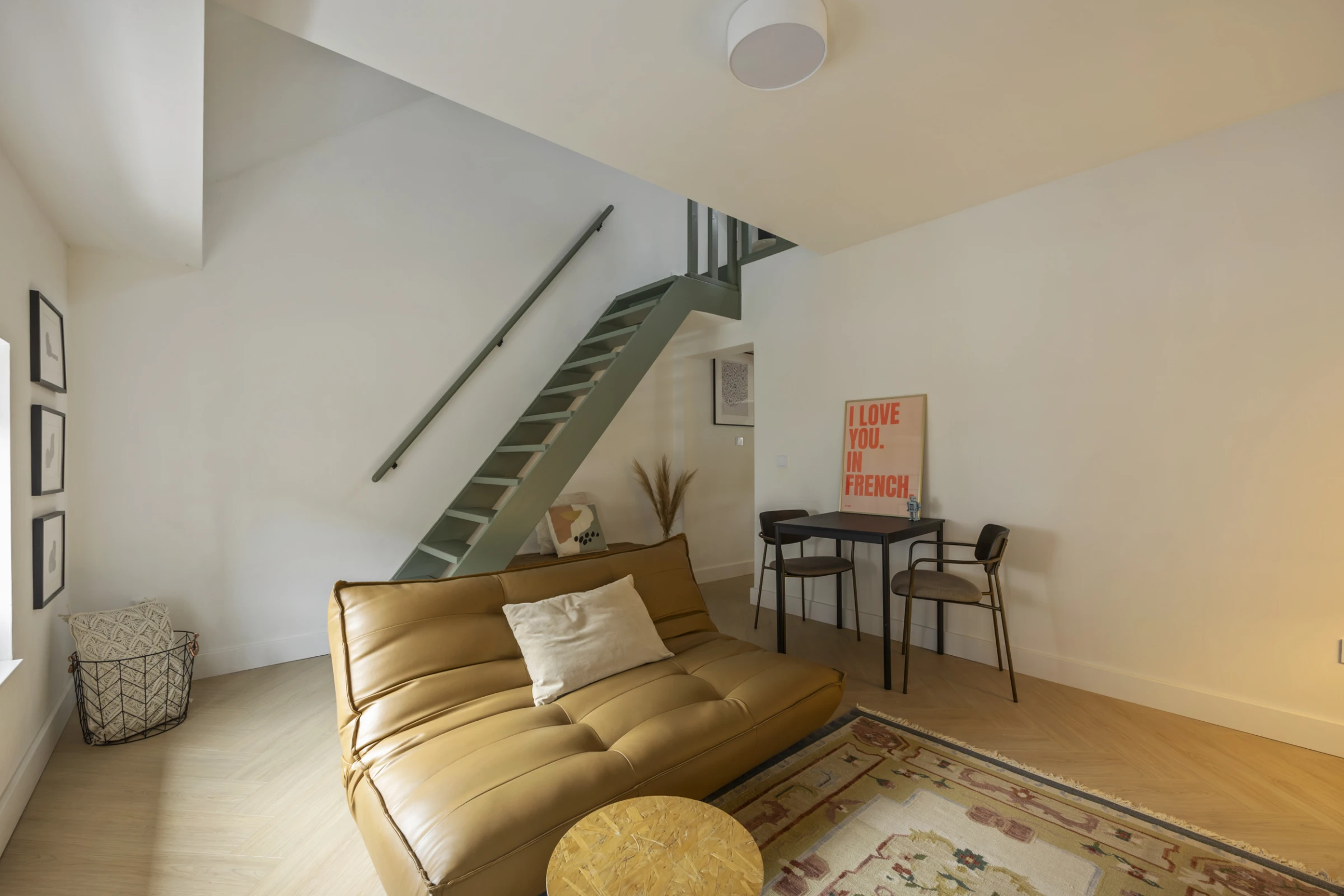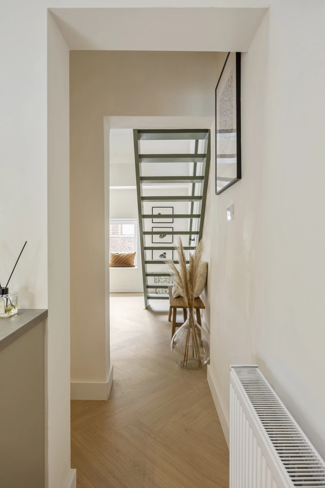 Via een trap vanuit de woonkamer is de entresol te bereiken, waar het slaapgedeelte is gelegen. Hier heb je genoeg plek voor een 2-persoonsbed en door het grote dakraam, heb je ook hier een mooie lichtinval.
