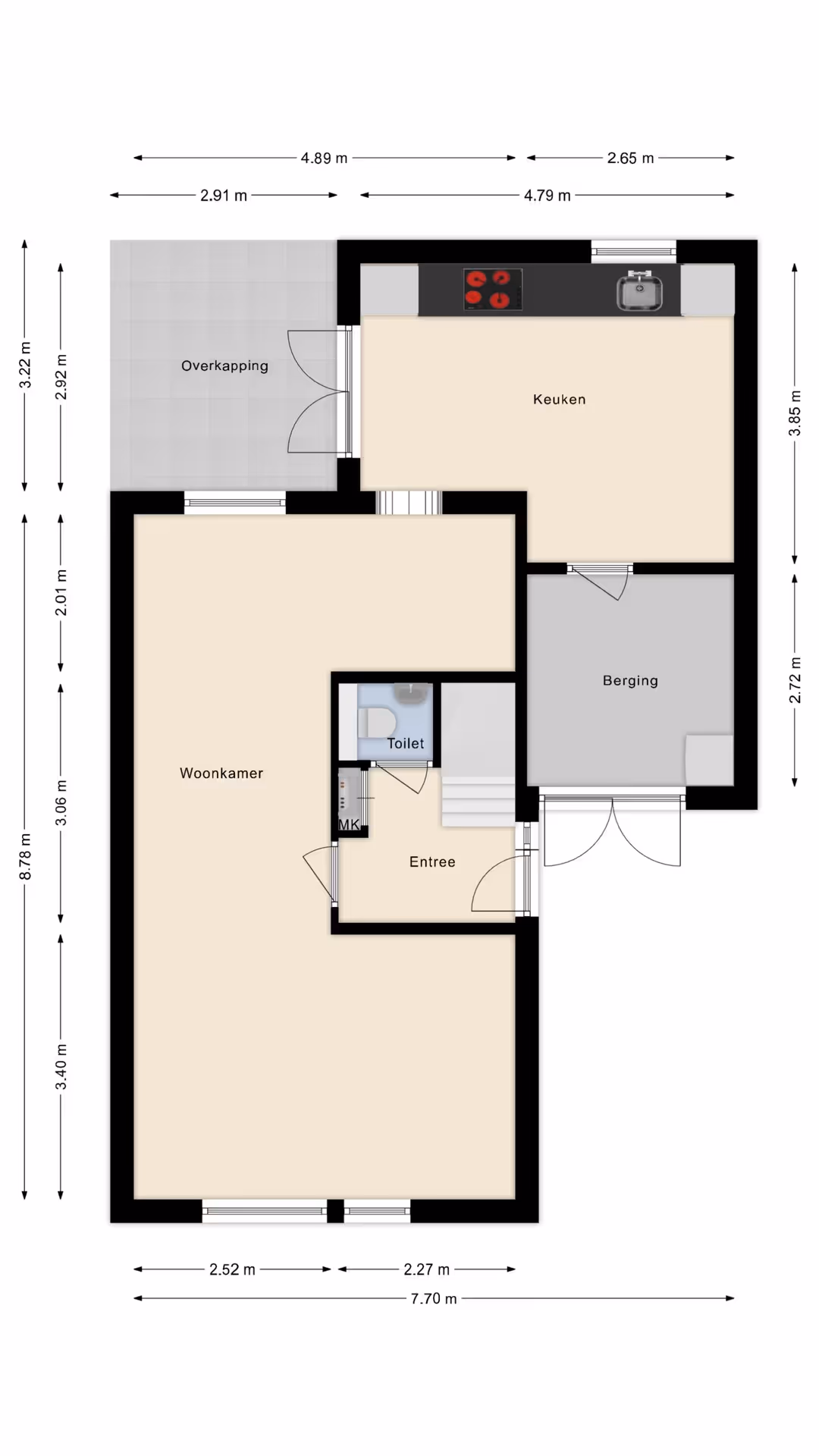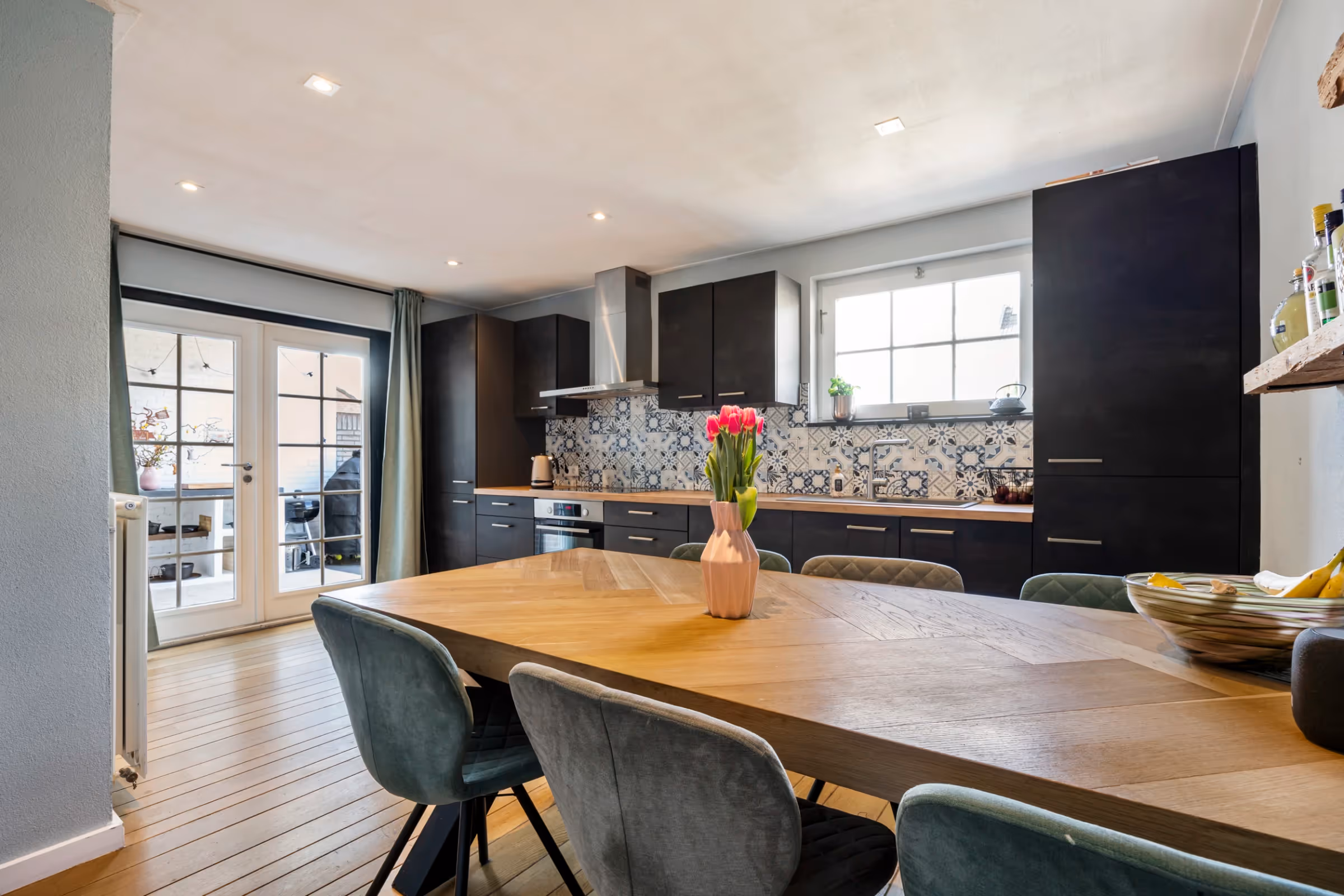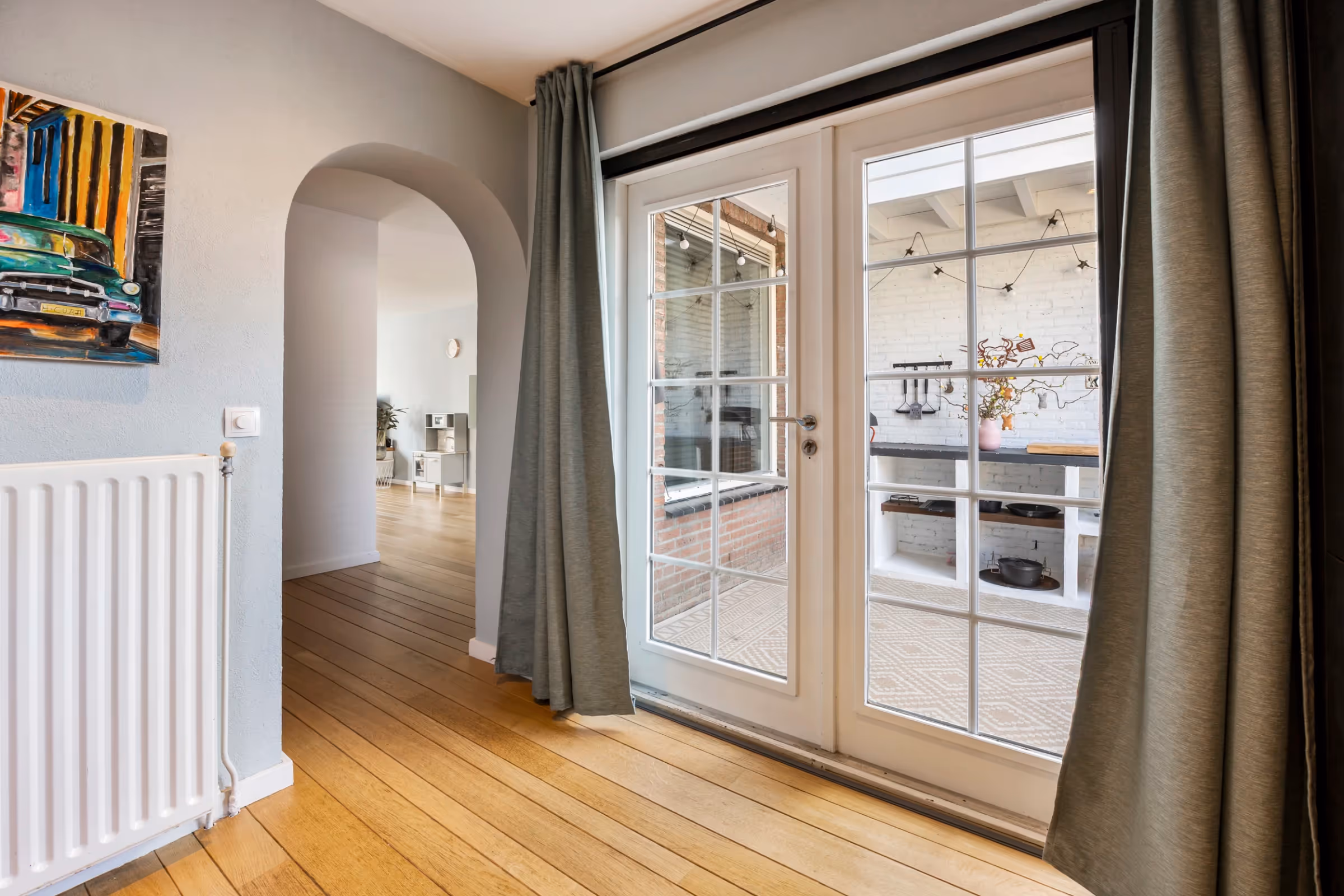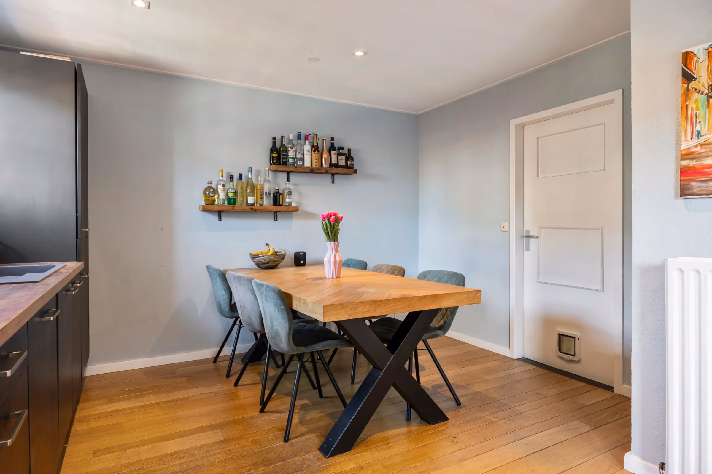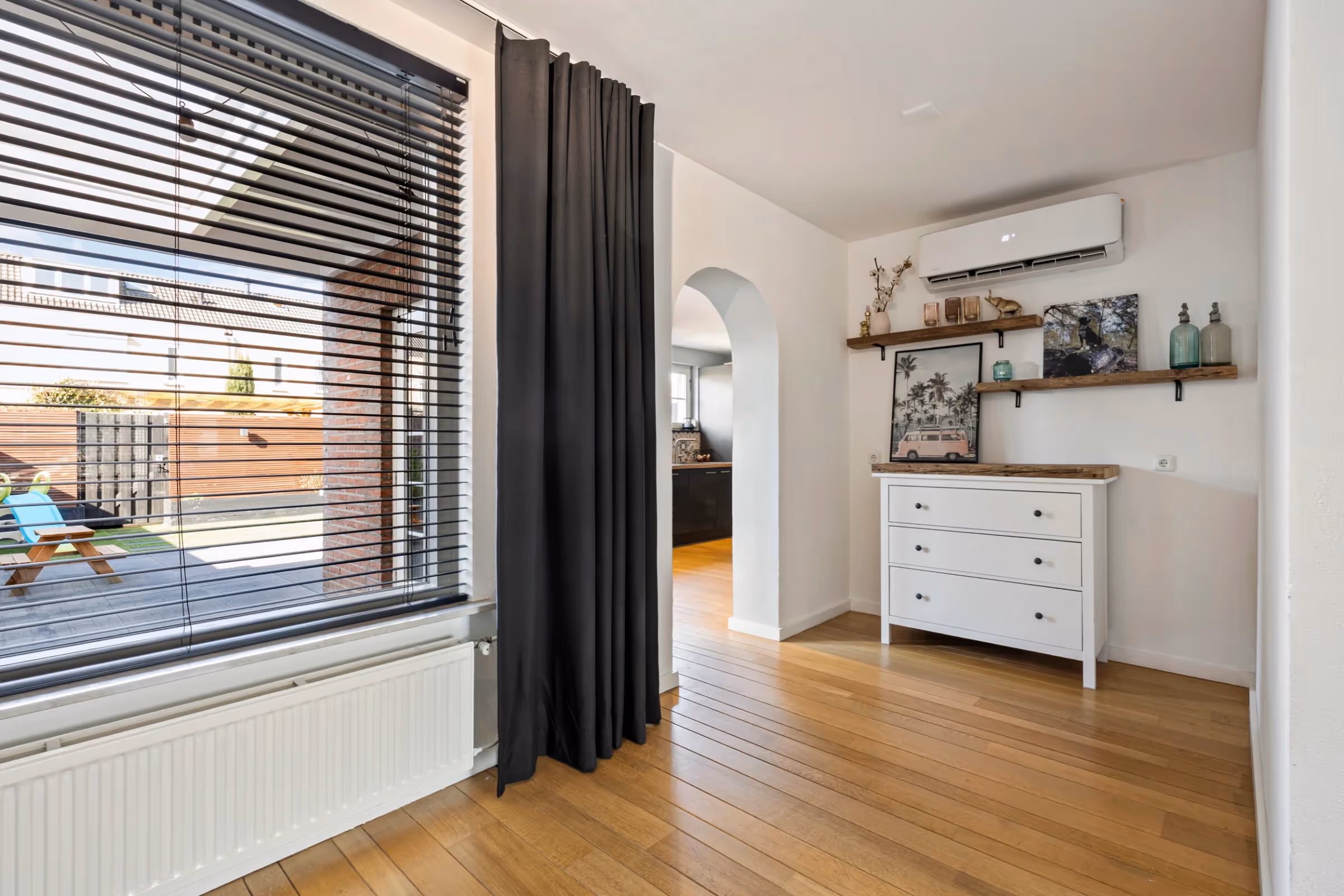 Entree in de ontvangsthal, met toegang naar de woonkamer, modern toilet met fonteintje en meterkast. Deze sfeervolle woonkamer heeft een keurig niveau van afwerking met o.a. een massieve houten parketvloer. Tevens hangt in de woonkamer een jonge airco die kan koelen en verwarmen. Aan de achterzijde is de woning uitgebreid met een aanbouw, waarin de keuken is gelegen. Deze fijne ruimte heeft genoeg plek voor een grote eettafel en beschikt over een modern keukenblok, met de volgende inbouwapparatuur: inductiekookplaat met afzuigkap, koelkast, vriezer, oven en vaatwasser (Bosch). Vanuit deze aanbouw/leefkeuken zijn zowel de tuin, als de inpandige berging te bereiken.