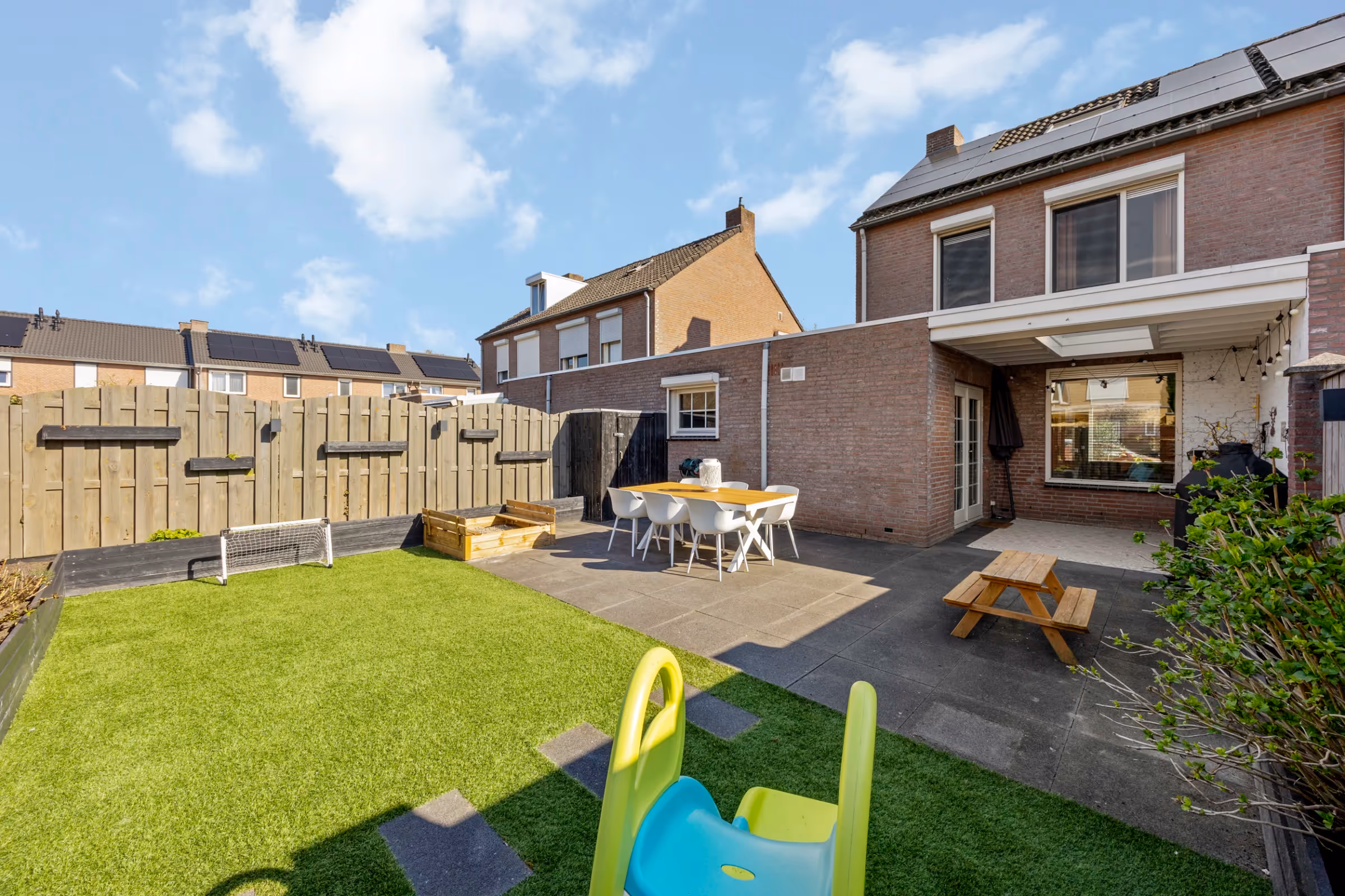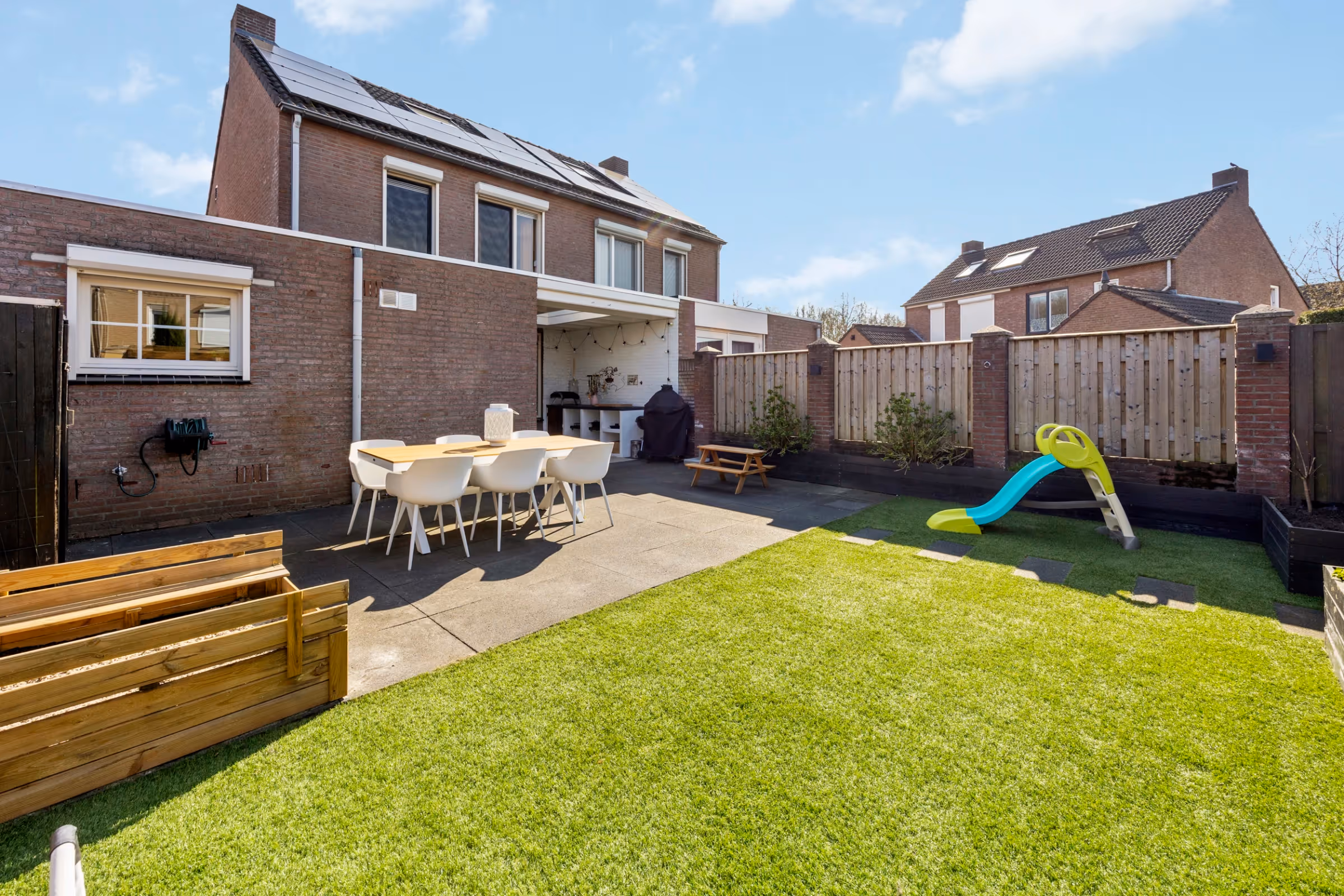 Deze fijne 2-onder-1-kap woning heeft ook een heerlijke tuin, welke mooi is aangelegd. Zo heeft de tuin een groot terras, een terrasoverkapping en een gazon van kunstgras. De tuin is helemaal omheind en heeft enkele bordessen voor beplanting. Voorts heeft de tuin een achterom, via een paadje aan de achterzijde. Tenslotte ligt aan de voorzijde een ruime oprit, geschikt voor meerdere auto’s.