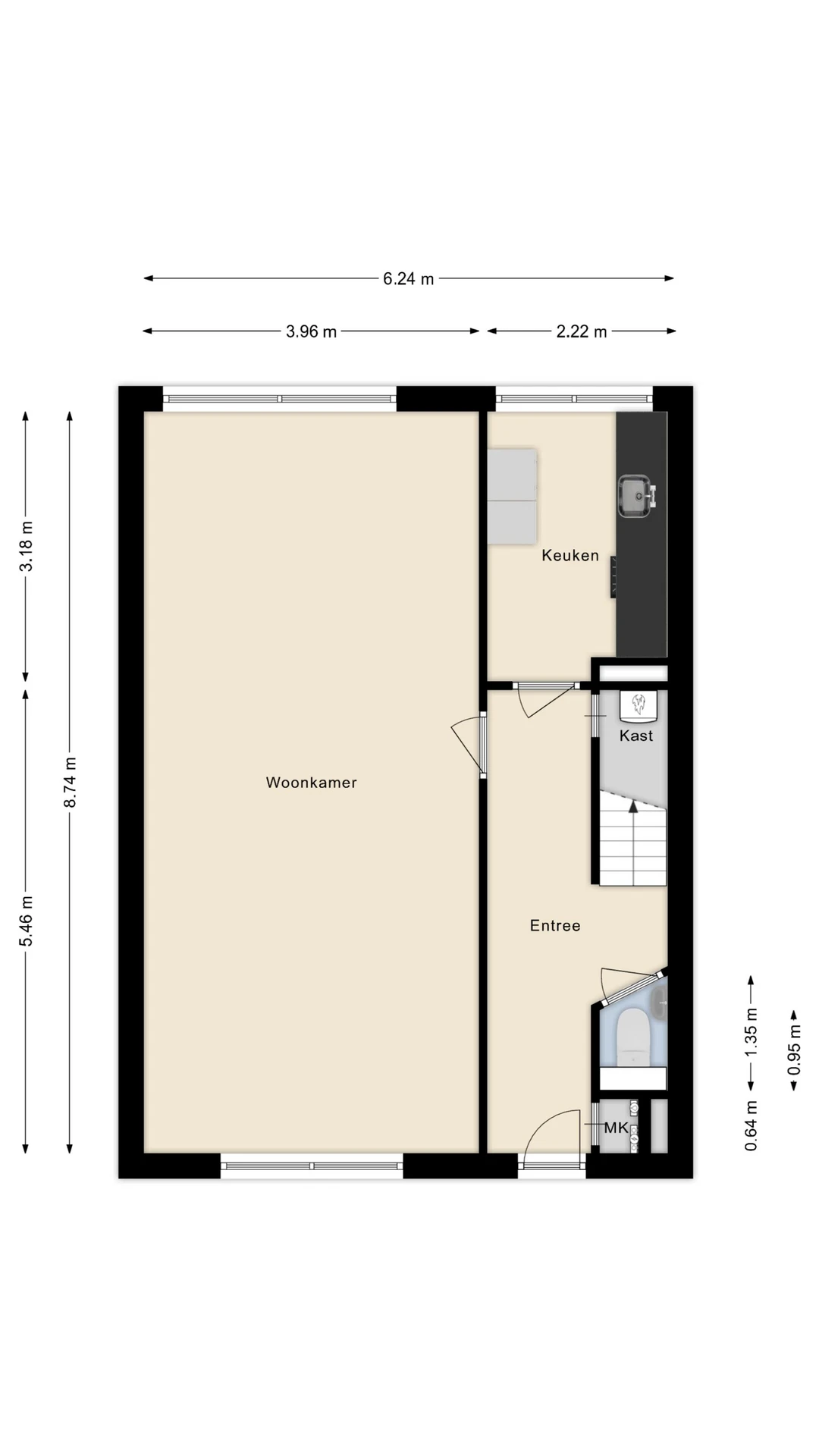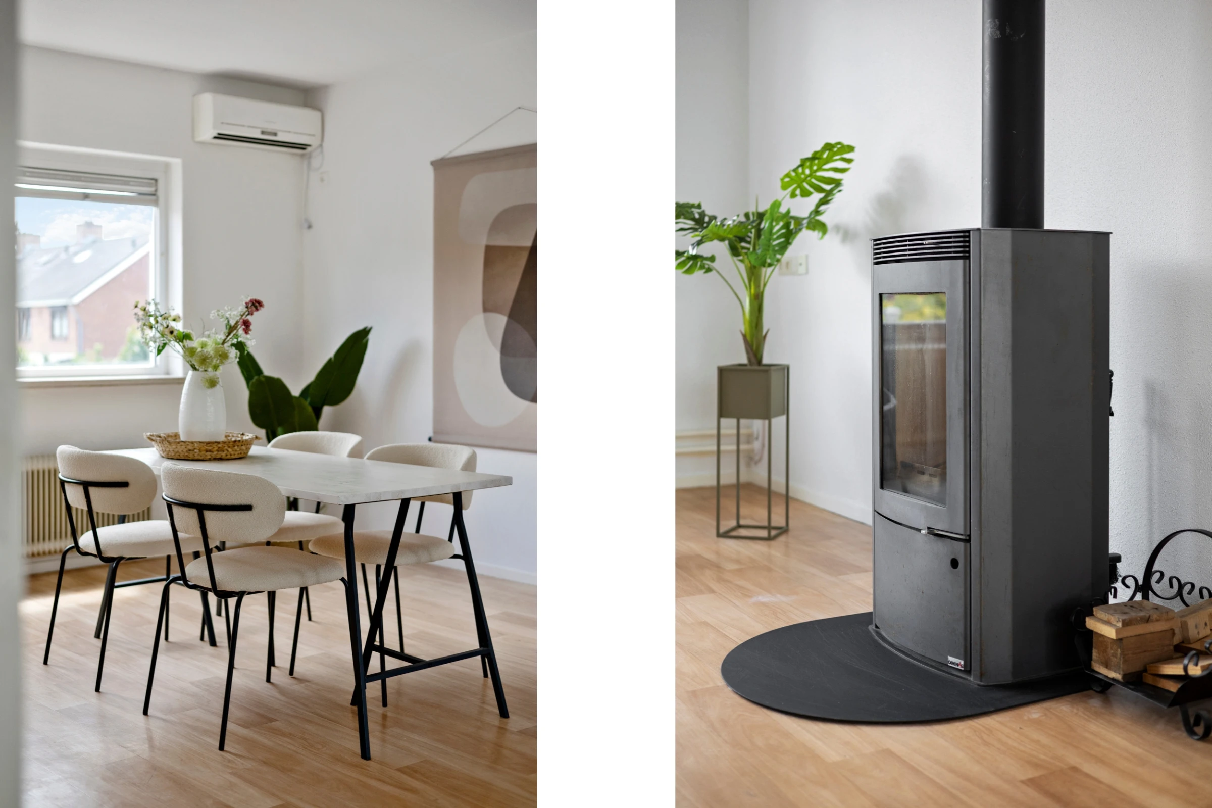 Het appartement zelf ligt op de 1e en 2e verdieping. Je komt binnen in de hal met meterkast, trapkast en toilet. Vanuit de hal zijn de woonkamer en de moderne keuken toegankelijk. Deze ruime woonkamer van maar liefst 35 m² is door de grote raampartijen ontzettend licht. Verder staat in de woonkamer een sfeervolle houtkachel. De moderne keuken is hagelnieuw en ongebruikt. Verder beschikt deze over de volgende inbouwapparatuur: 4-pits gasfornuis, oven, koelkast met vriesvak en vaatwasser.