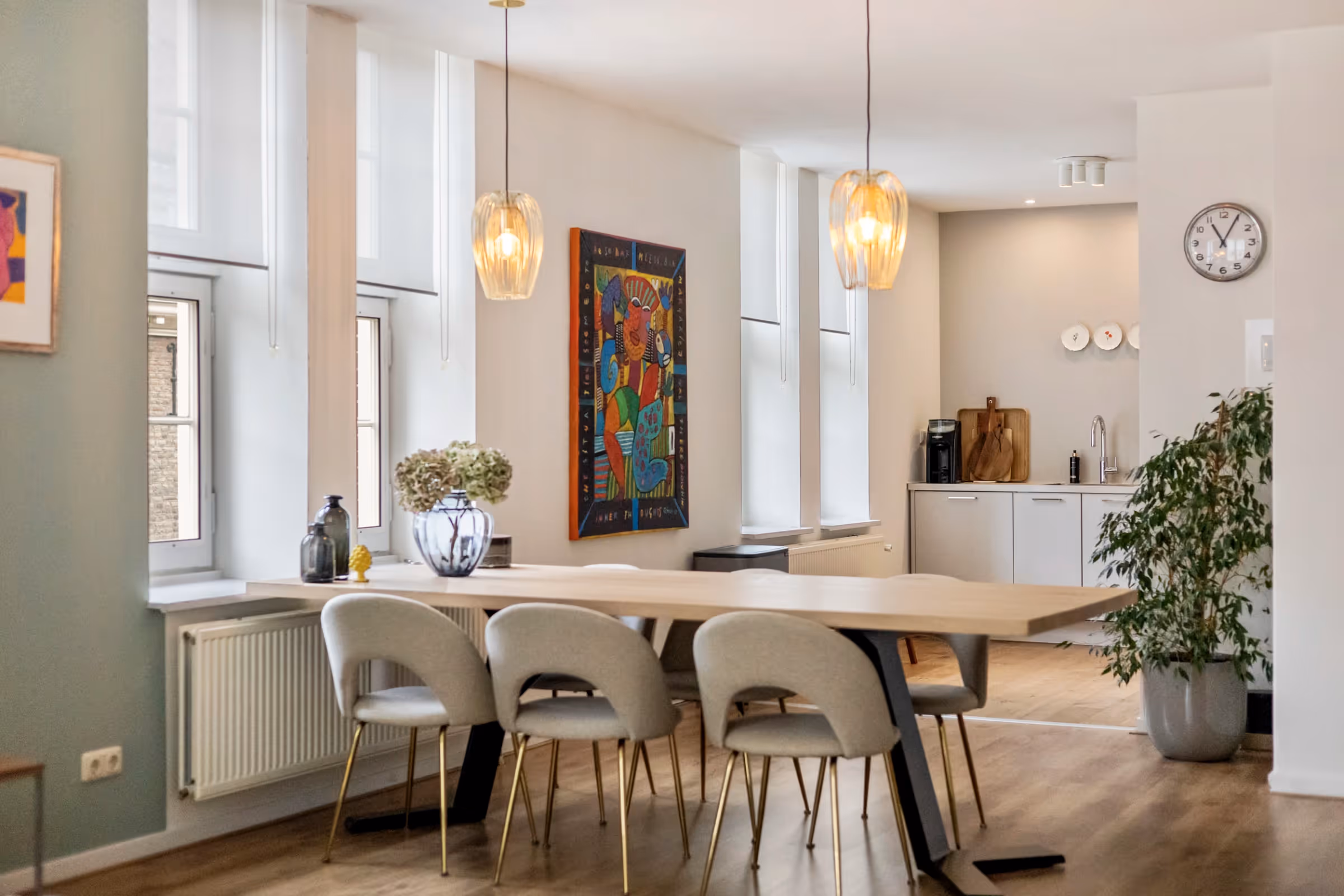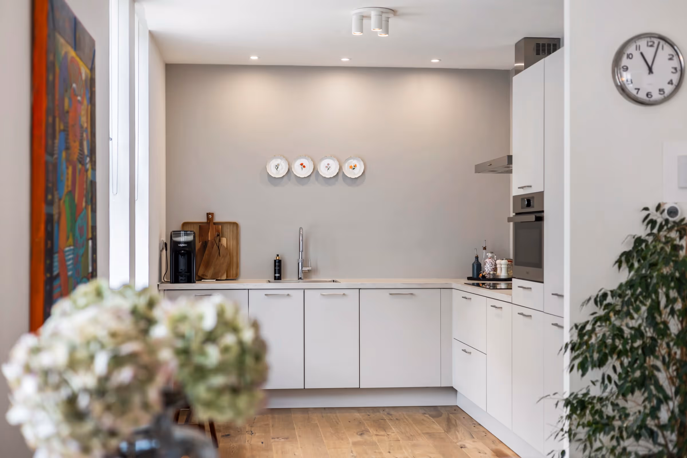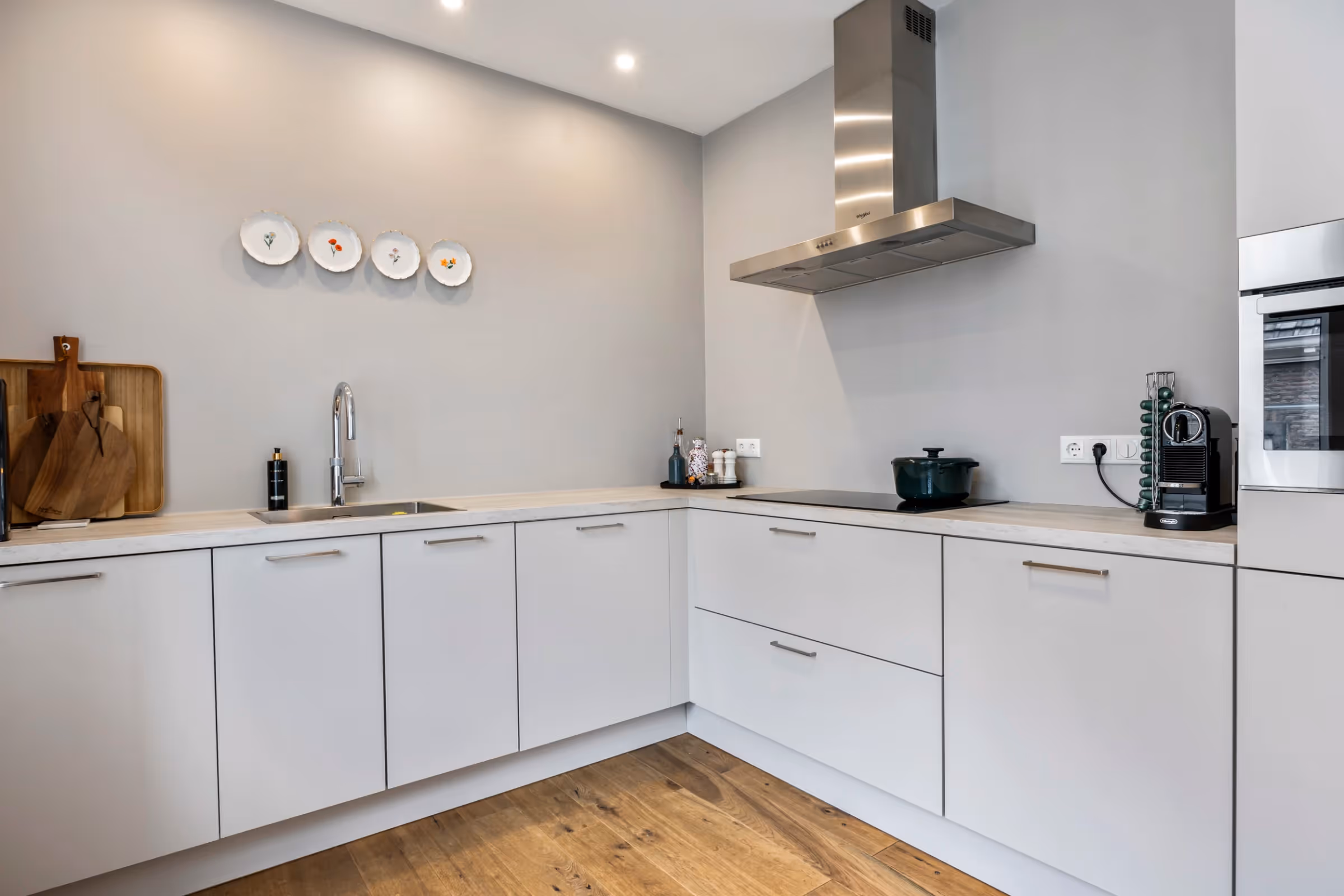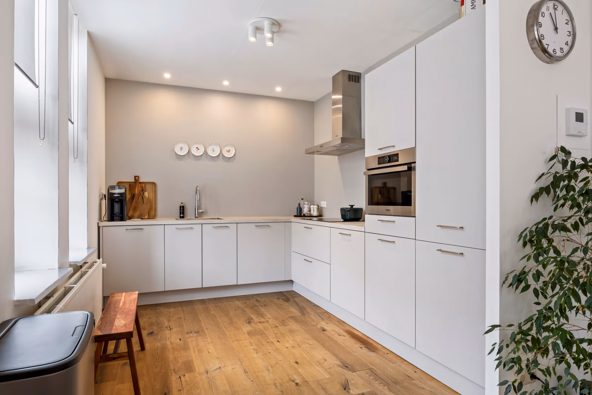 Het appartement ligt op de 2e en bovenste verdieping. Via de hal zijn alle kamers bereikbaar en de woonkamer ligt aan het eind van deze hal. Deze ruime en lichte woonkamer heeft een uitstekend niveau van afwerking. Door de ligging op de hoek van het gebouw is de lichtinval optimaal. Aan de woonkamer grenst tevens de keuken. Deze keuken, met hoekopstelling, is vernieuwd in 2023 en beschikt over de volgende inbouwapparatuur: 5-pits inductiekookplaat met afzuigkap, koelkast, vriezer, combi-oven en vaatwasser.