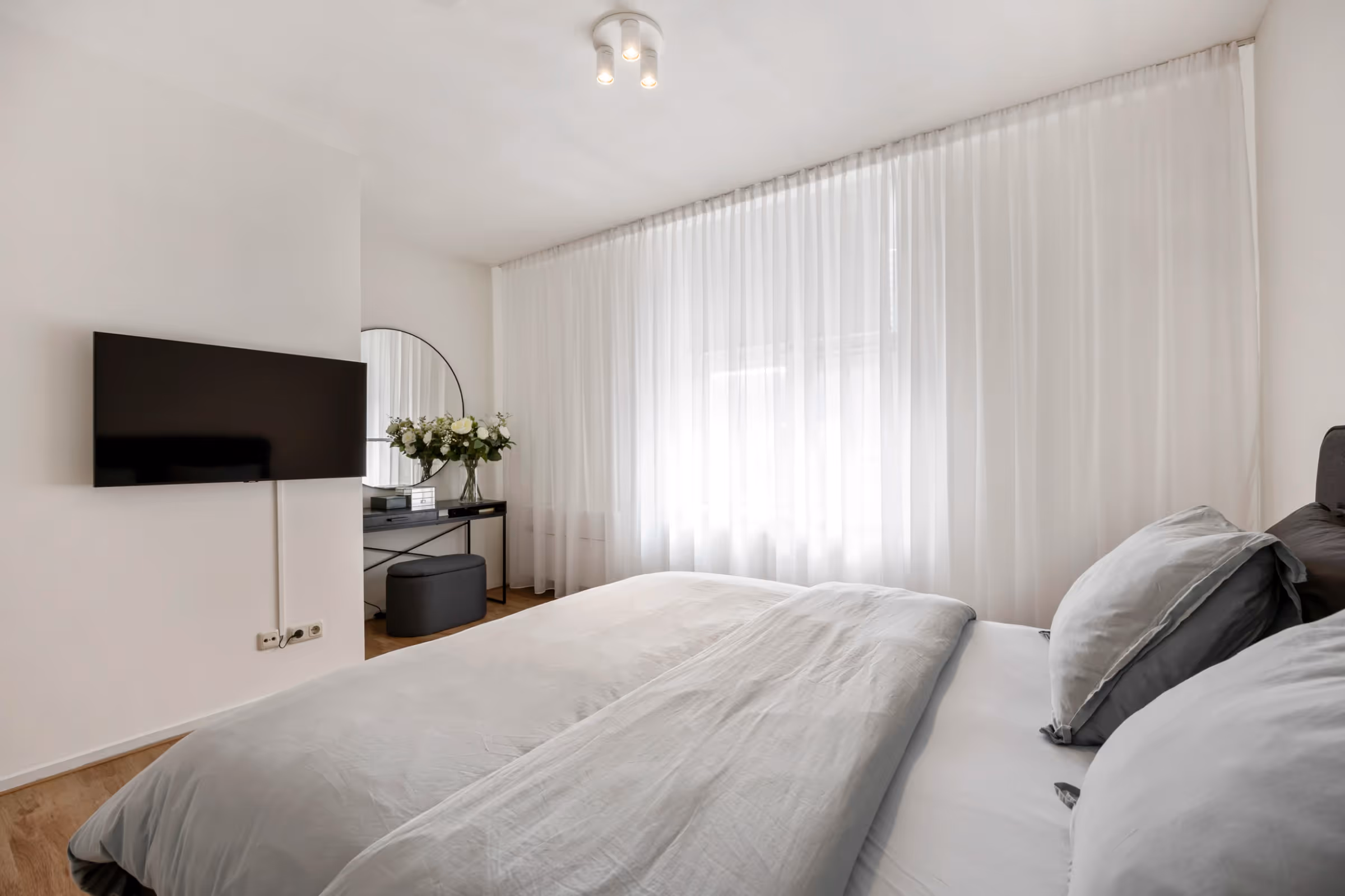 Voorst heeft het appartement 3 slaapkamers, waarvan 2 aan de straatzijde en 1 aan de achterzijde van het gebouw zijn gelegen. Deze slaapkamers zijn allen voldoende ruim en de hoofdslaapkamer (met airco) ligt aan de achterzijde. Eén van de 3 slaapkamers is momenteel als grote inloopkast in gebruik. De badkamer van het appartement is eveneens netjes en geheel betegeld. Verder beschikt deze over een ligbad, douche en wastafel.