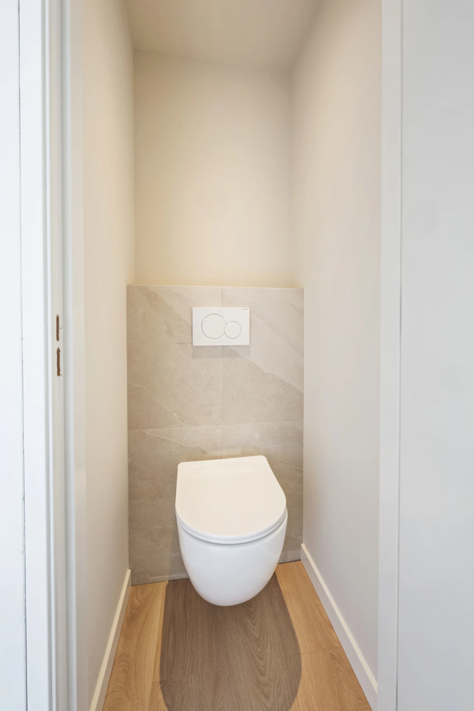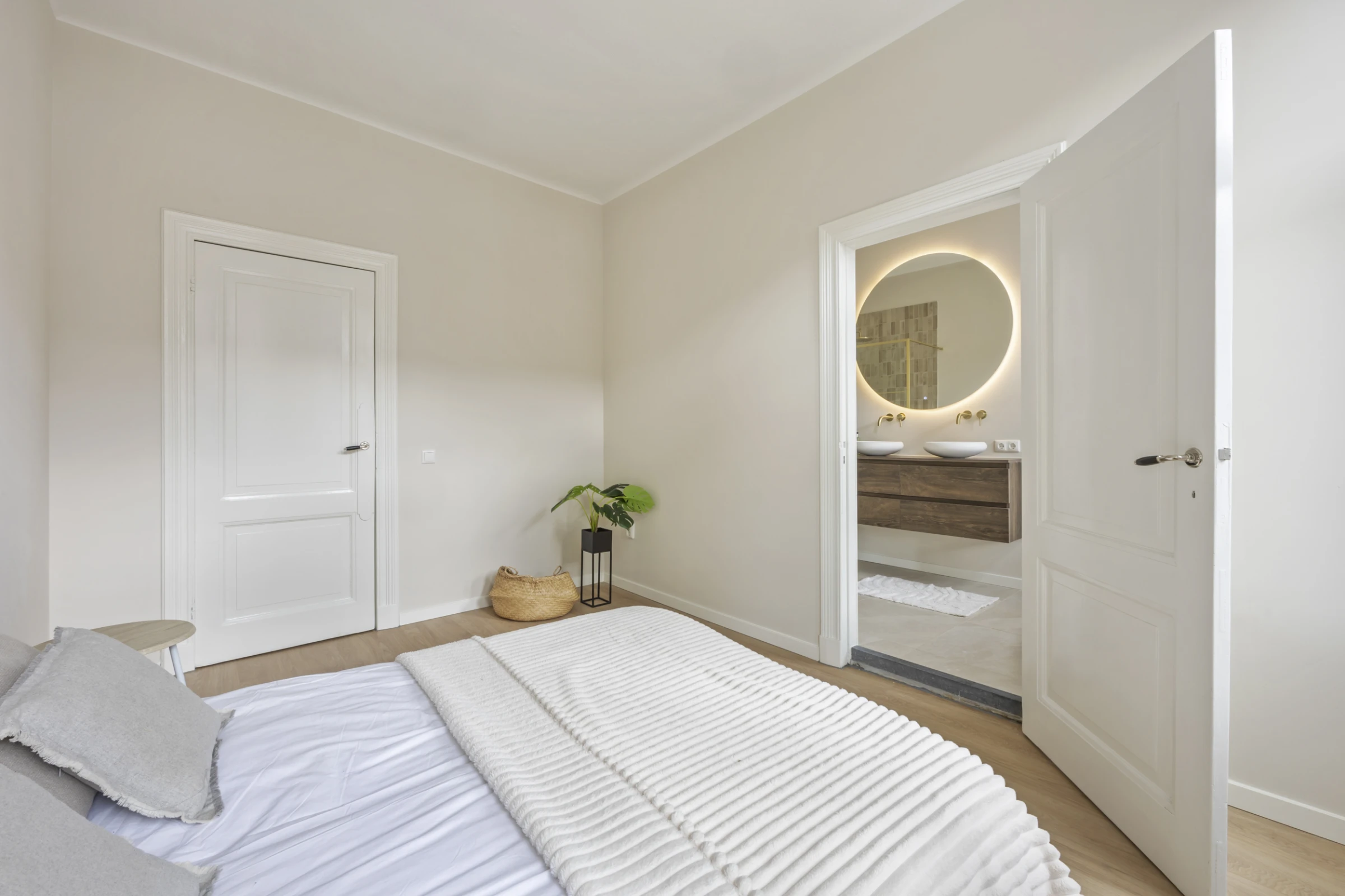Via de overloop op de 1e verdieping zijn 2 ruime slaapkamers en de 1e badkamer toegankelijk. Deze luxe badkamer herbergt een riante inloopdouche, een 2e toilet en een wastafelmeubel met 2 kranen. Tenslotte beschikt de badkamer over een luxe, vrijstaande ligbad, heerlijk toch? De 1e slaapkamer ligt aan de voorzijde, met genoeg ruimte voor een groot tweepersoonsbed en een kledingkast. De 2e slaapkamer heeft ook lekker veel ruimte en is net zo strak en netjes als de 1e.