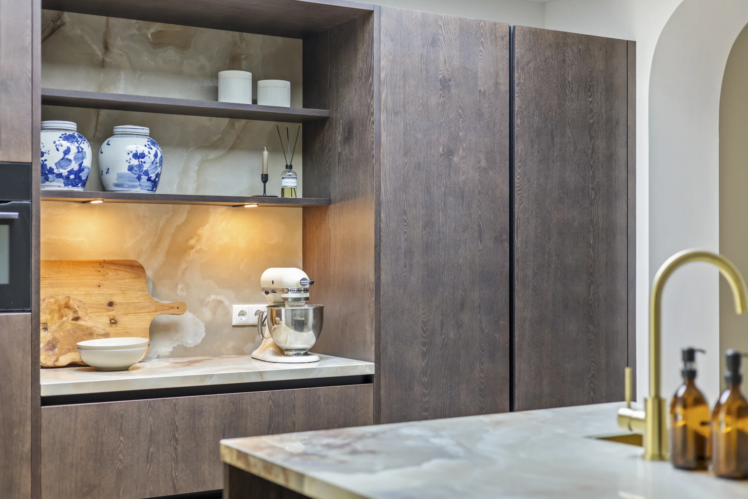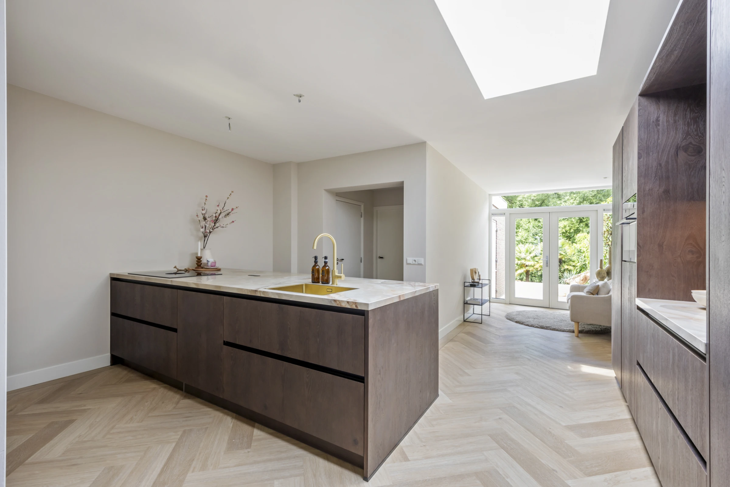 Bij de entree van dit sfeervolle woonhuis komt de charme je al tegemoet. De fraaie authentieke vloer combineert prachtig met de strakke, gestucte muren en de stijlvolle trappartij. Vanuit de hal zijn het souterrain en de woonkamer toegankelijk. De woonkamer ademt sfeer en charme; zo heb je hoge plafonds, mooie en suite deuren en een prachtige vloer. Na het zit- en eetgedeelte van de woonkamer, ligt in het midden van de woning, de prachtige leefkeuken. Deze nieuwe keuken beschikt over een luxe eiland met veel werk- en kastruimte. Verder heeft deze leefkeuken de volgende inbouwapparatuur: een Bora inductiekookplaat met afzuiging, een koelkast met vriesvak, combi oven en vaatwasser. Vanaf de keuken beschikt de begane grond tevens over vloerverwarming. Voorts biedt de woning nog meer leefruimte, aangezien de woning is uitgebreid met een riante aanbouw aan de achterzijde. Ideaal om een lange eettafel te plaatsen, als extra lounge gedeelte, of speelplek voor kinderen. Tenslotte ligt op de begane grond nog een ruime bijkeuken, met aansluitpunten voor het witgoed en de unit van de vloerverwarming. De dubbele tuindeuren vanuit de aanbouw zorgen voor een fijn tuincontact met de achtertuin.