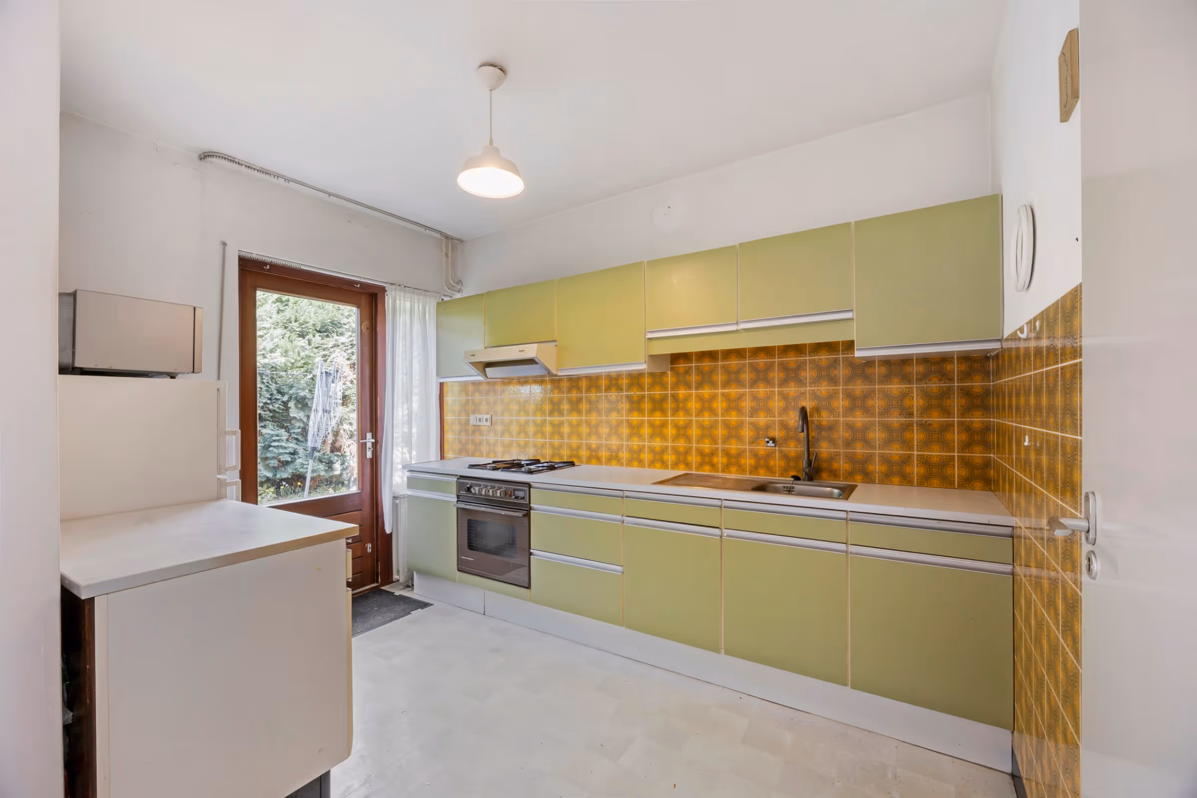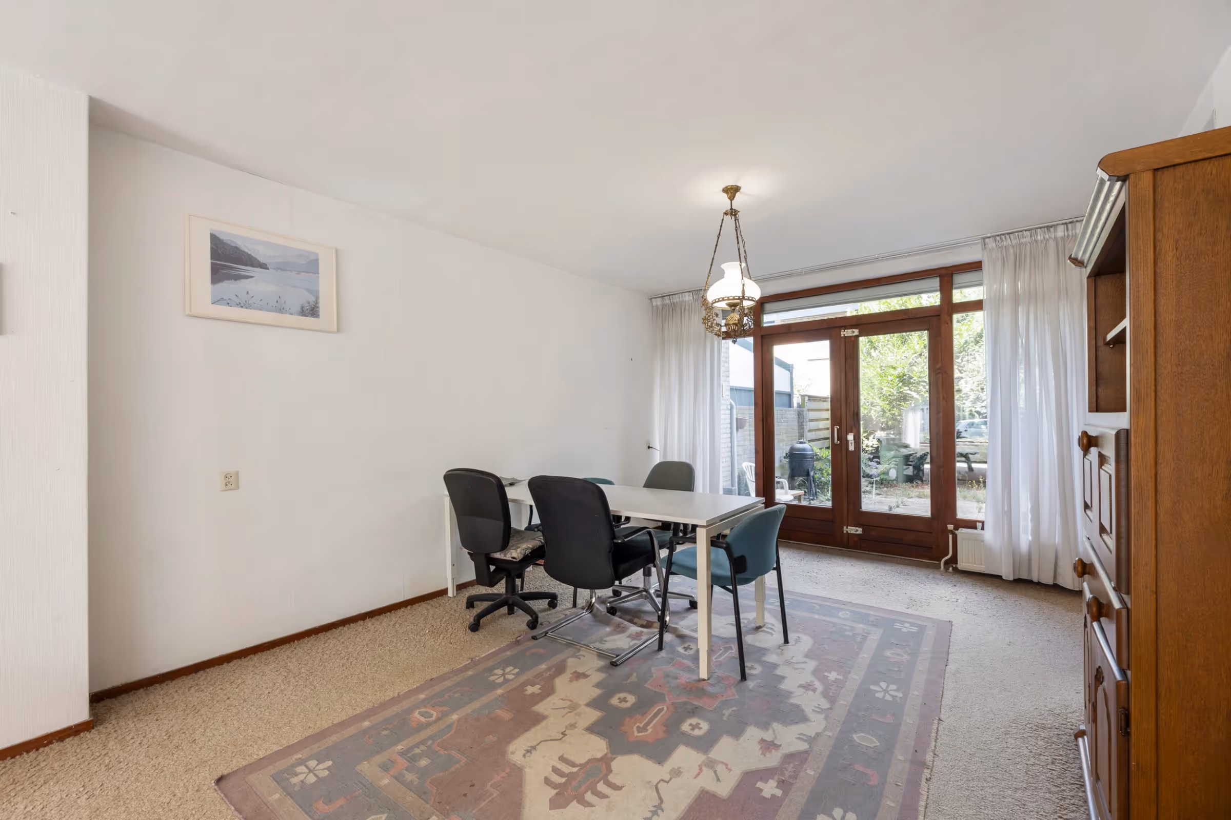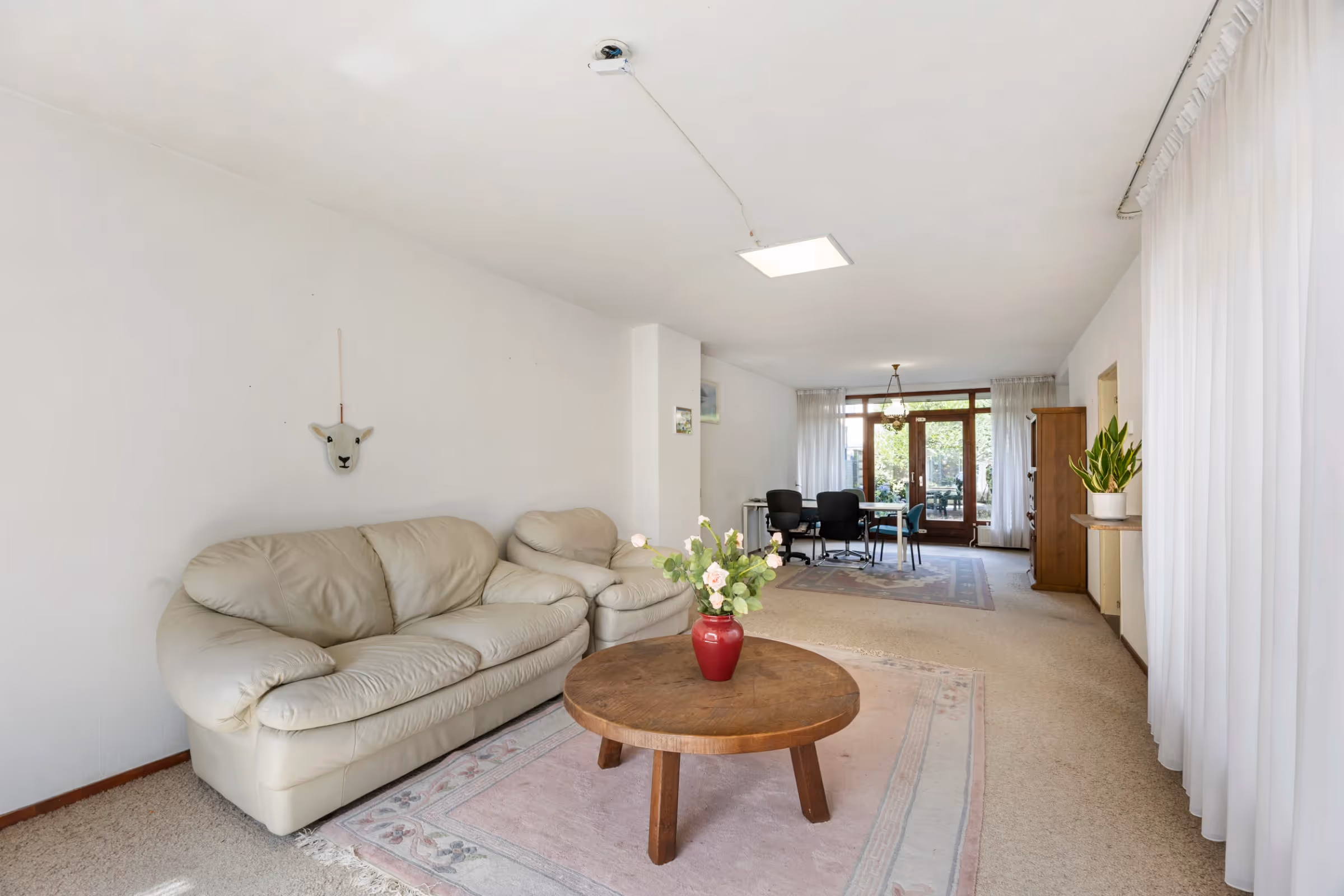 Via de entreehal, waar tevens het gastentoilet en de meterkast zijn gelegen, kom je in de woonkamer. Deze 11 meter diepe woonkamer is lekker licht en ruim van opzet met openslaande tuindeuren. Verder staat de woonkamer in verbinding met de keuken. Deze half open keuken, met ook een goede maatvoering, heeft een eenvoudig keukenblok, welke gemoderniseerd dient te worden. Vanuit de keuken is tevens een trapkast toegankelijk, met behoorlijke wat opbergruimte.