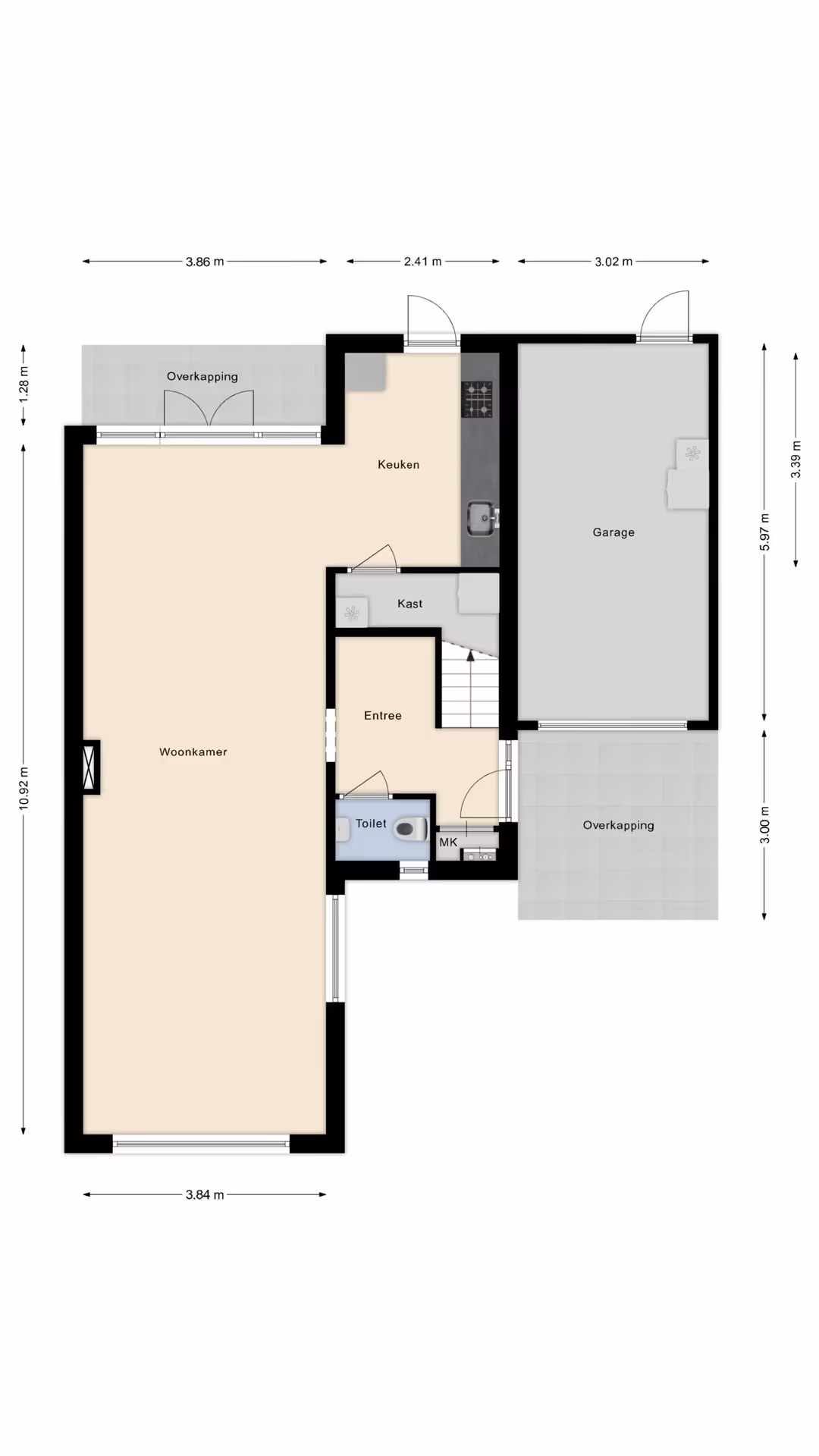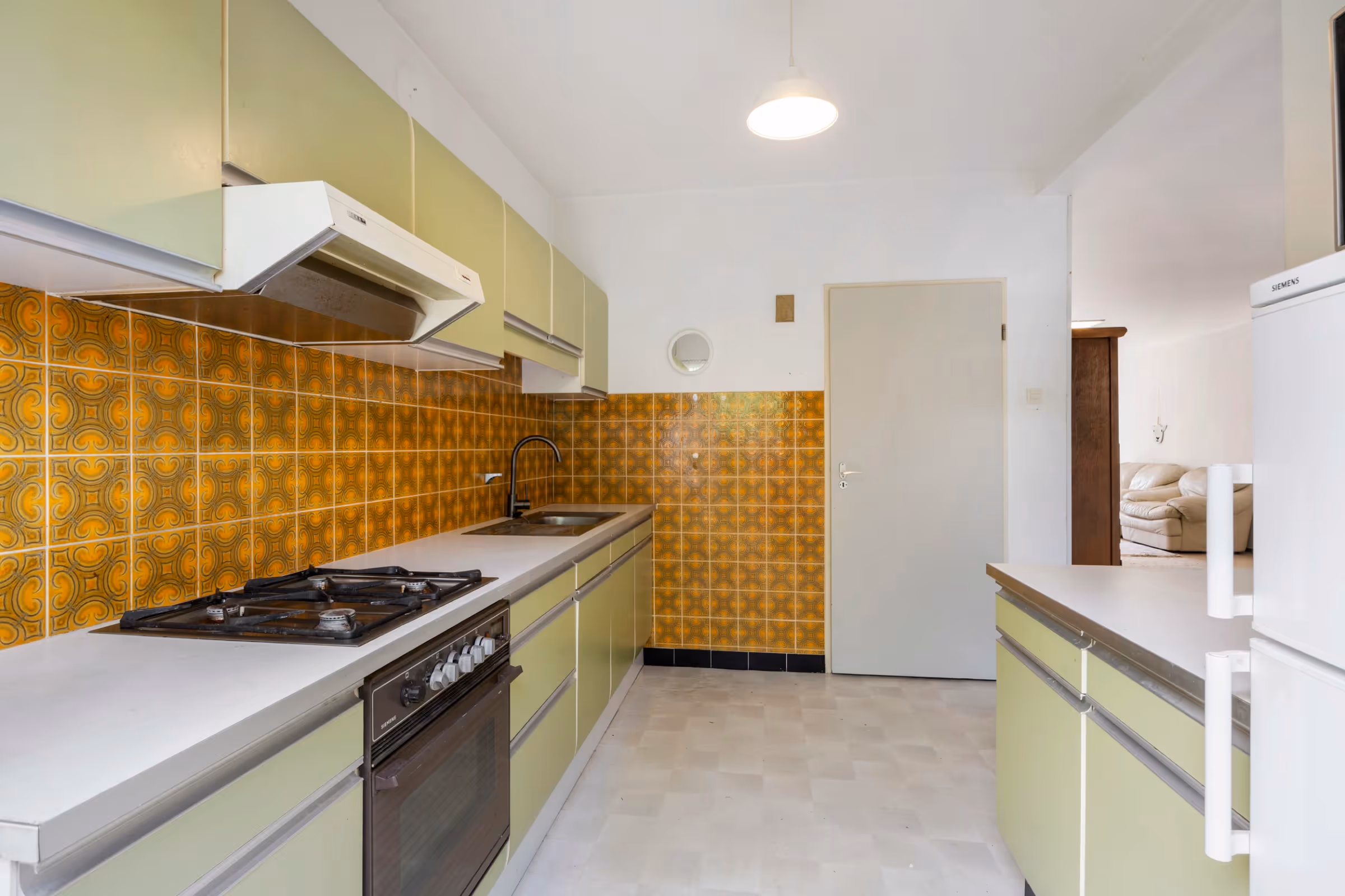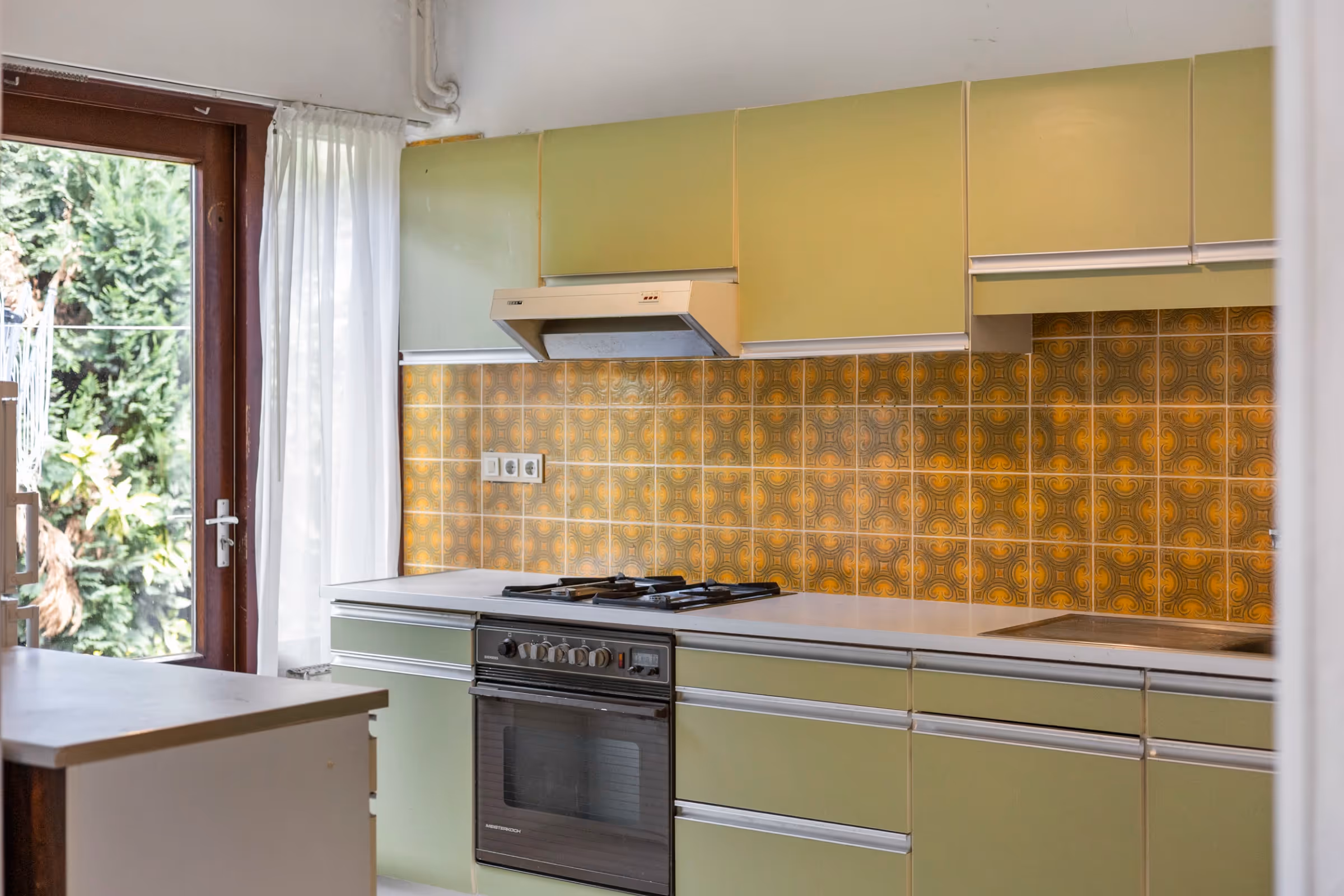 Via de entreehal, waar tevens het gastentoilet en de meterkast zijn gelegen, kom je in de woonkamer. Deze 11 meter diepe woonkamer is lekker licht en ruim van opzet met openslaande tuindeuren. Verder staat de woonkamer in verbinding met de keuken. Deze half open keuken, met ook een goede maatvoering, heeft een eenvoudig keukenblok, welke gemoderniseerd dient te worden. Vanuit de keuken is tevens een trapkast toegankelijk, met behoorlijke wat opbergruimte.