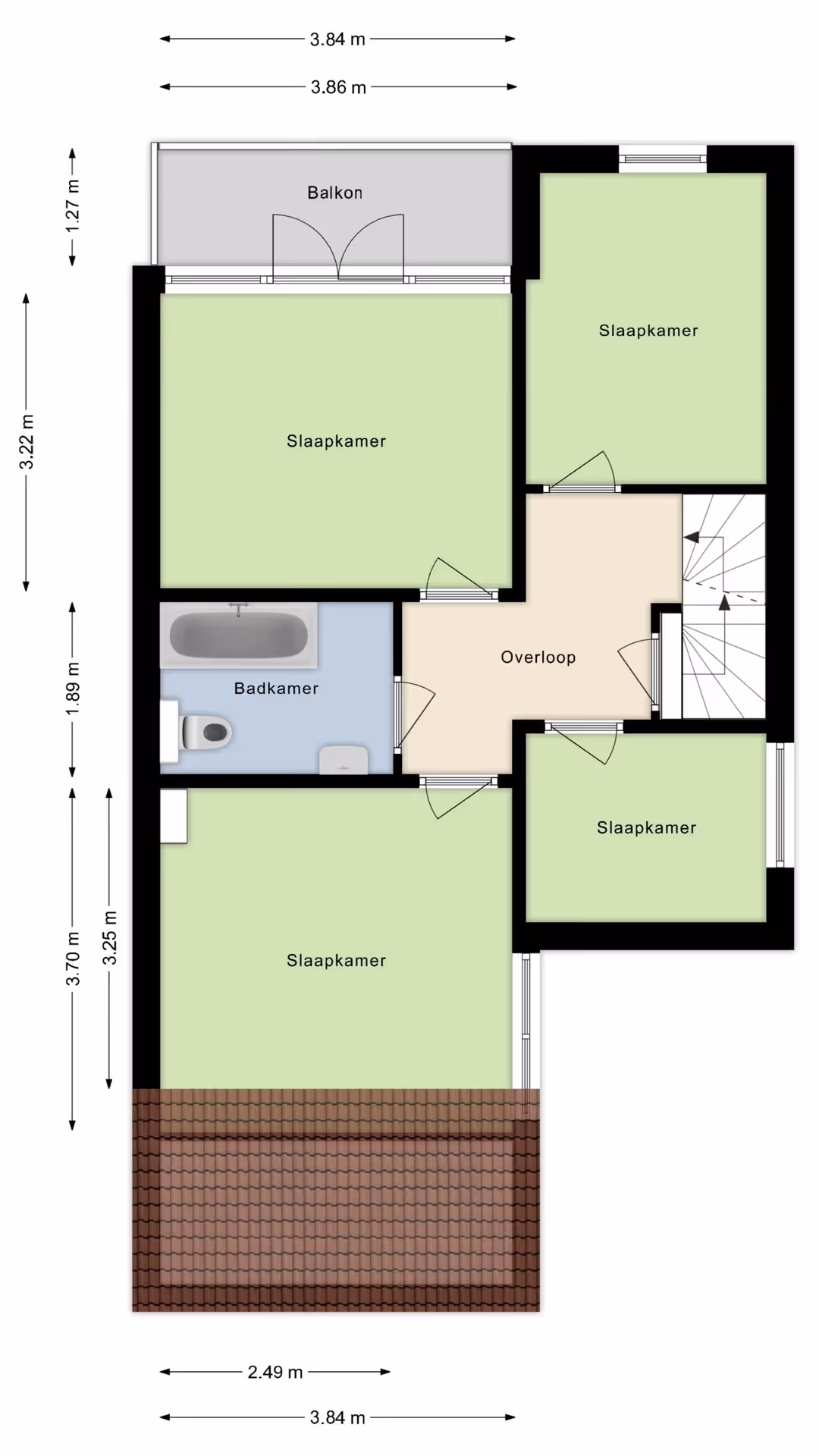 Via de overloop op de 1e verdieping zijn maar liefst 4 slaapkamers en de badkamer bereikbaar. De lekker ruime hoofdslaapkamer, gelegen aan de achterzijde van het woonhuis heeft daarbij ook nog een balkon. De badkamer is netjes, doch gedateerd en bestaat uit een ligbad, wastafel en 2e toilet.