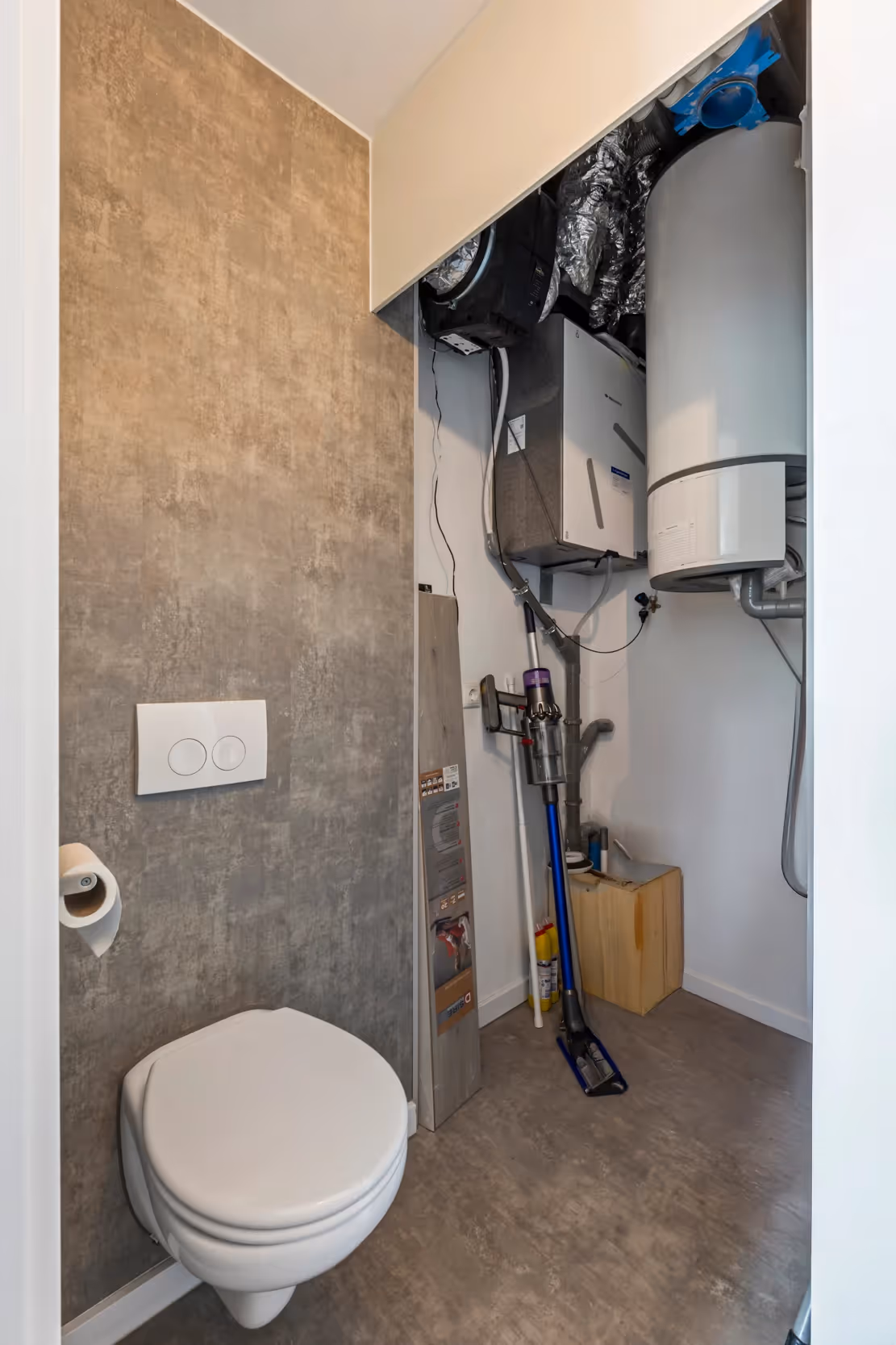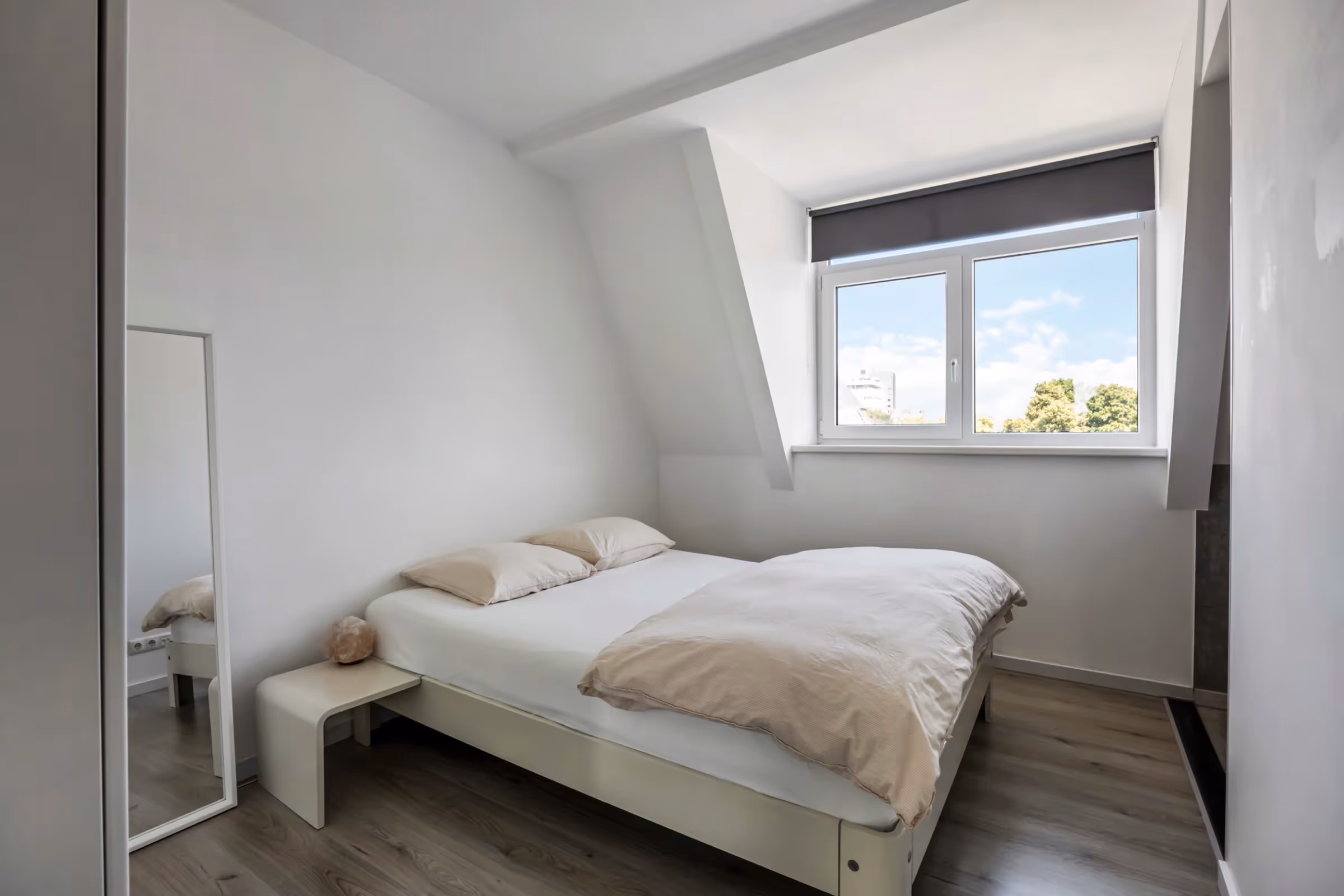 Vanuit de woonkamer is vervolgens de slaapkamer toegankelijk. Deze slaapkamer is eveneens lekker licht en staat in verbinding met de badkamer. De slaapkamer biedt genoeg plek voor een groot 2-persoons bed en een kledingkast. De stijlvolle badkamer beschikt over een wastafelmeubel en een douchecabine. Tenslotte heeft het appartement nog een berging en deze bevat de technische installaties, waaronder de mechanische ventilatie, en de boiler. Ook zijn hier de aansluitpunten voor je wasmachine en het toilet gelegen.