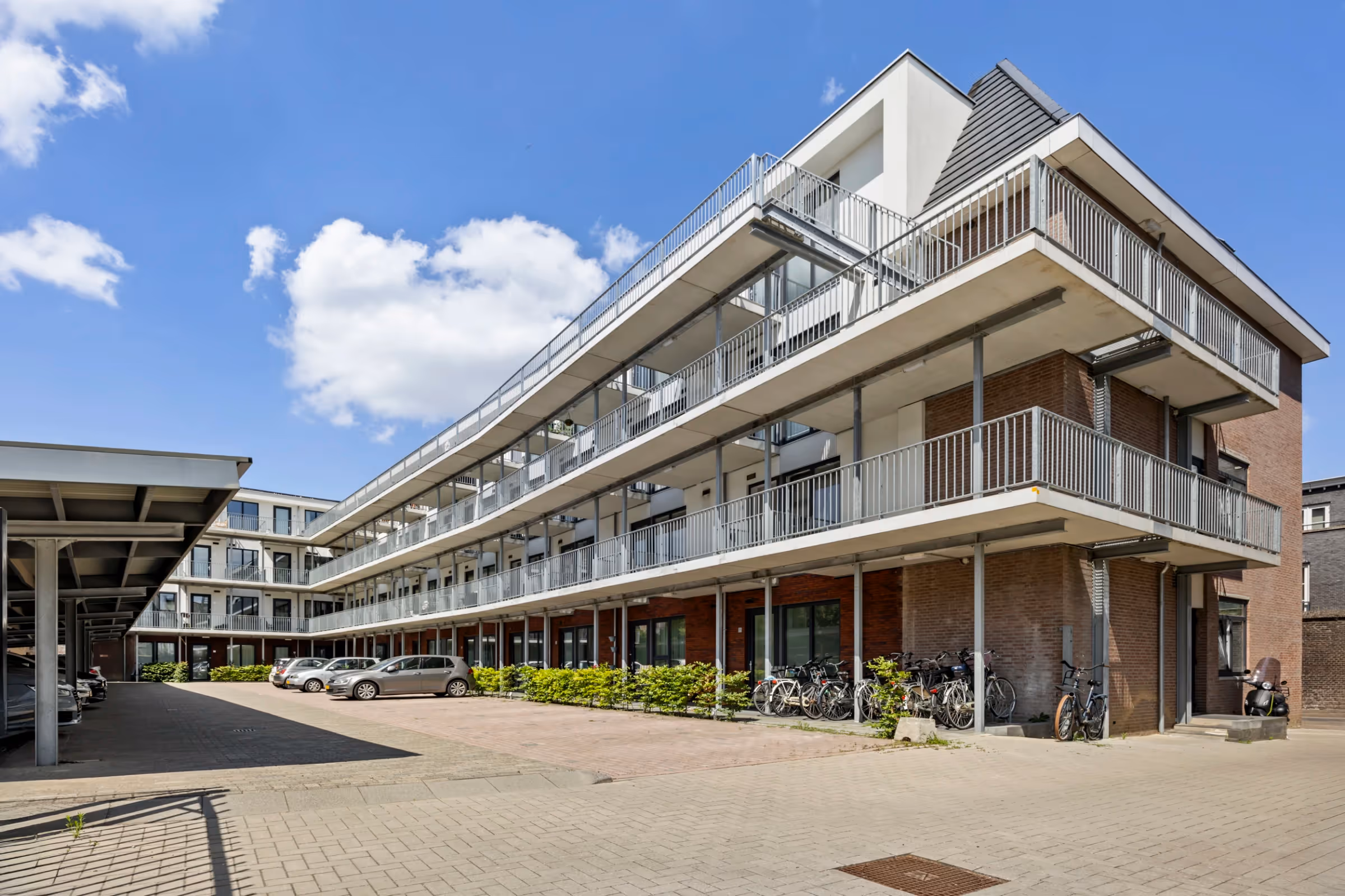 Centrale entreehal met brievenbussen en intercominstallatie. Lift en trapopgang naar de verdiepingen. Naast het gebouw ligt een overdekte fietsenstalling voor de bewoners van het complex.