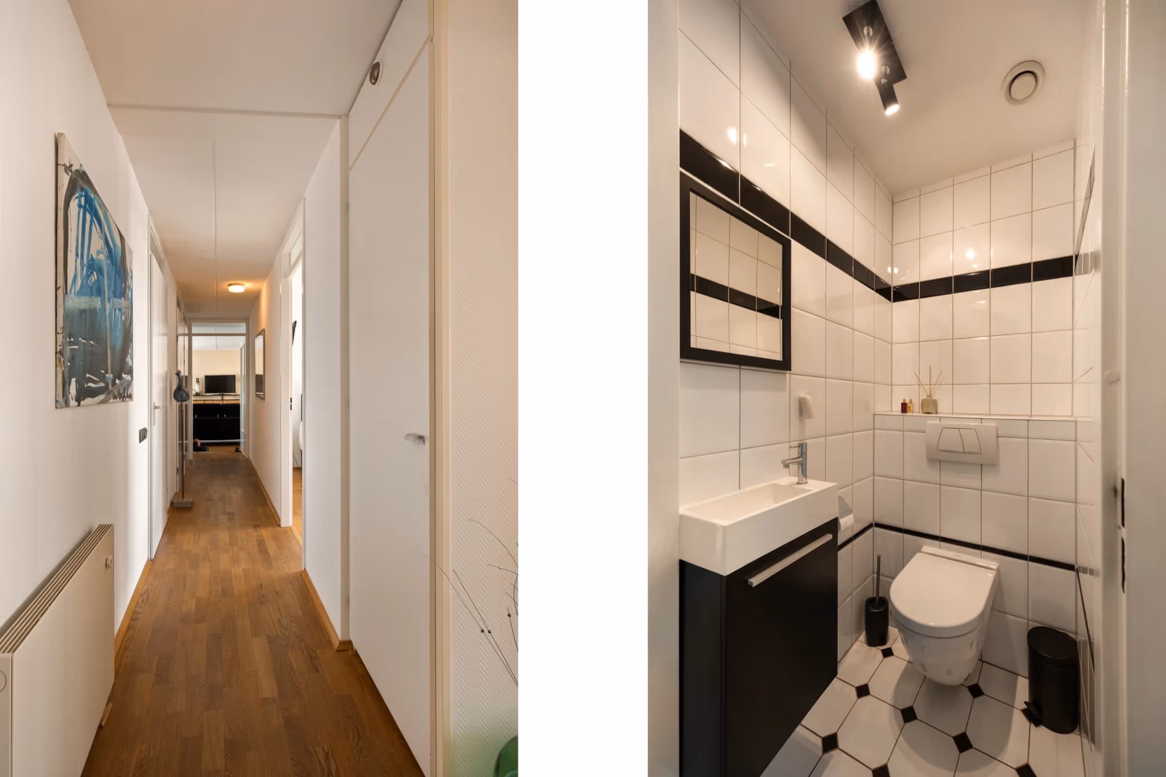 Vervolgens zijn vanuit de hal de bijkeuken / technische ruimte, het gastentoilet, de badkamer en de 2 slaapkamers te bereiken. In de bijkeuken bevindt zich de opstelplaats van het witgoed en de CV combiketel (Bosch, eigendom, 2010). De badkamer is geheel betegeld en voorzien van een ligbad, douchecabine, 2e toilet en wastafelmeubel. Tenslotte beschikt dit keurige appartement over 2 nette slaapkamers. De hoofdslaapkamer biedt tevens toegang tot het balkon en de 2e slaapkamer is momenteel als kastenkamer in gebruik. In de slaapkamers ligt dezelfde fraaie vloer, als in de woonkamer en hal.