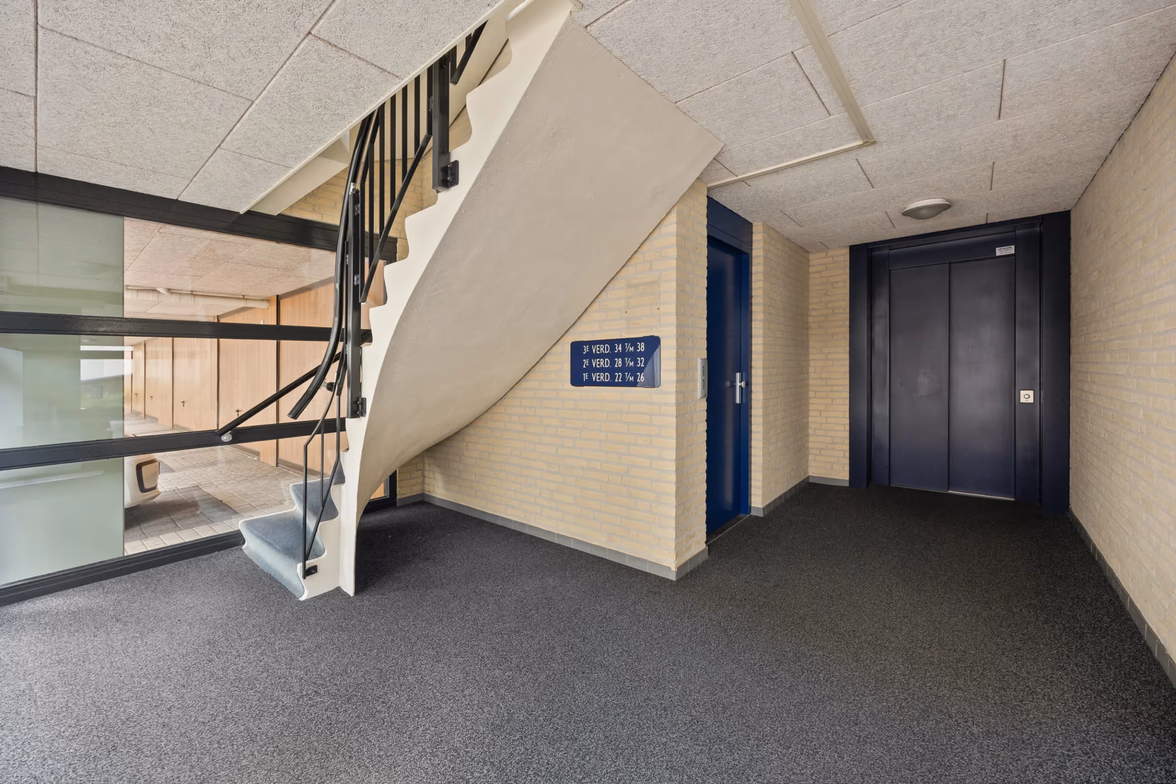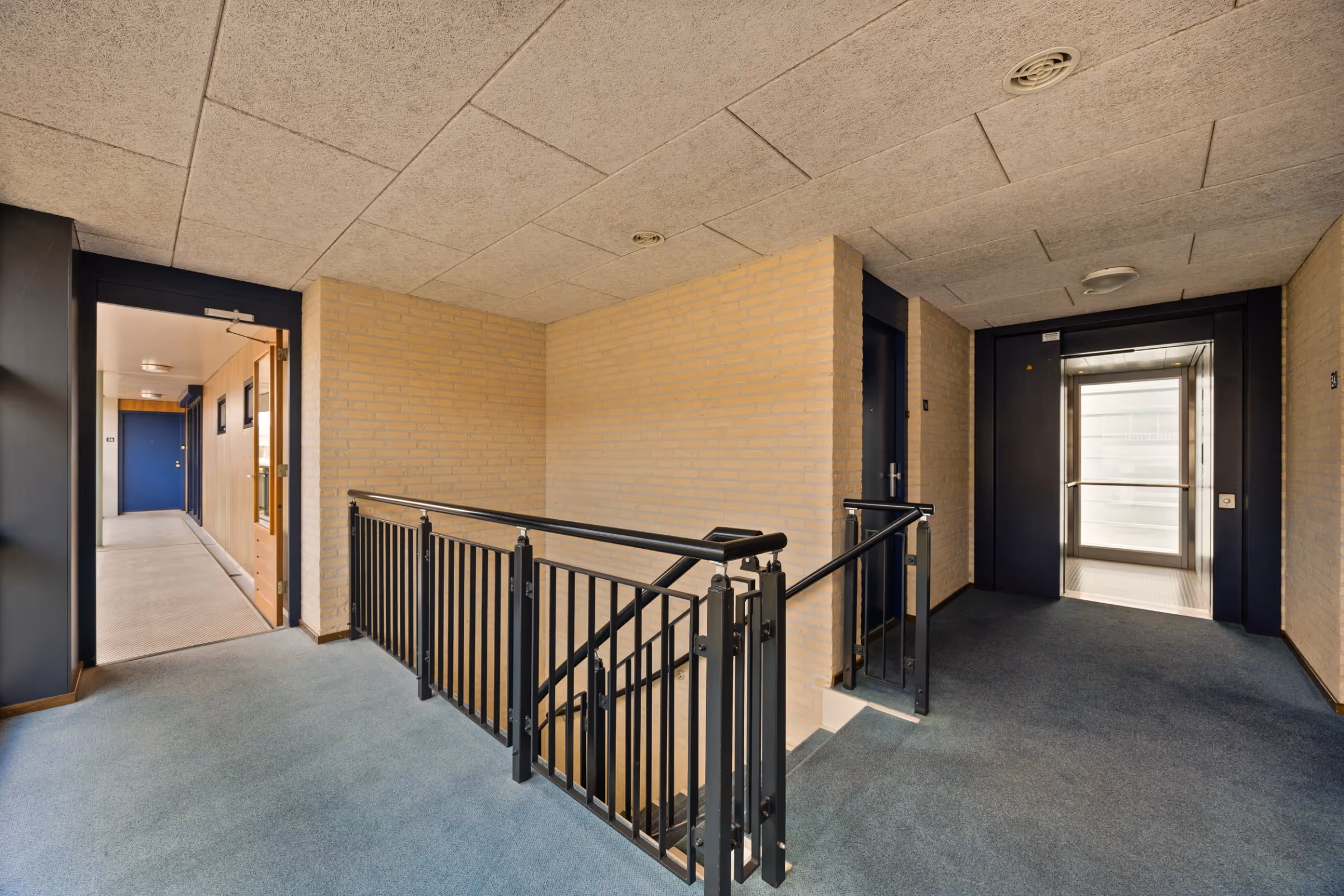 Centrale entreehal met brievenbussen, intercom en liftinstallatie.