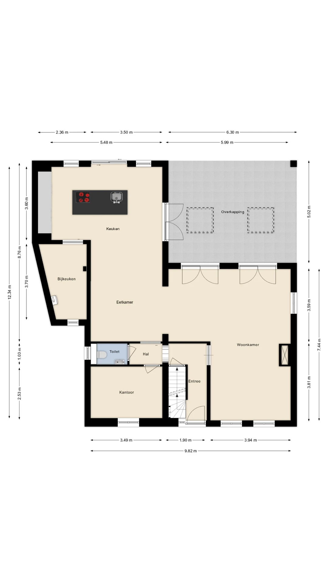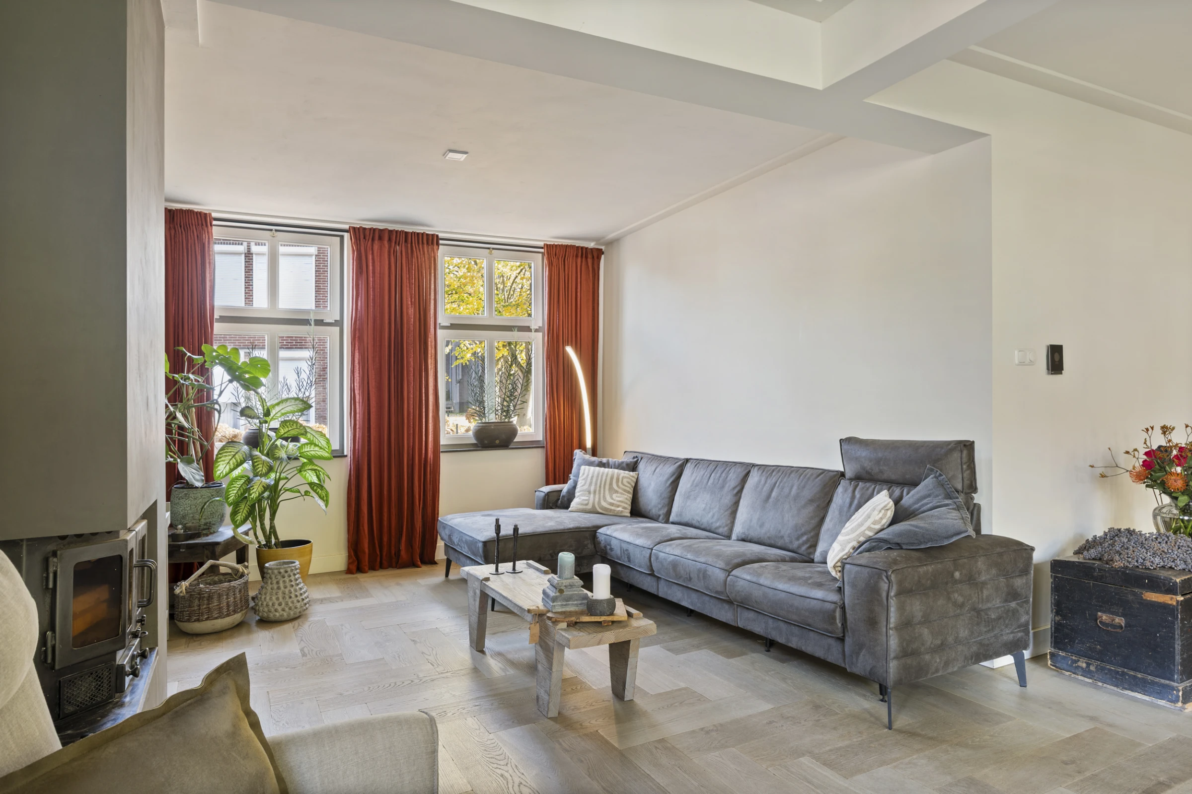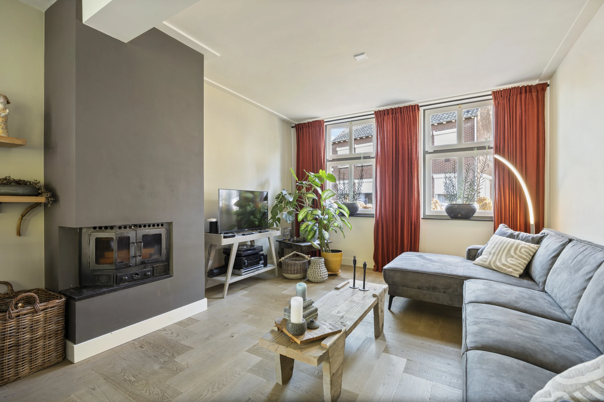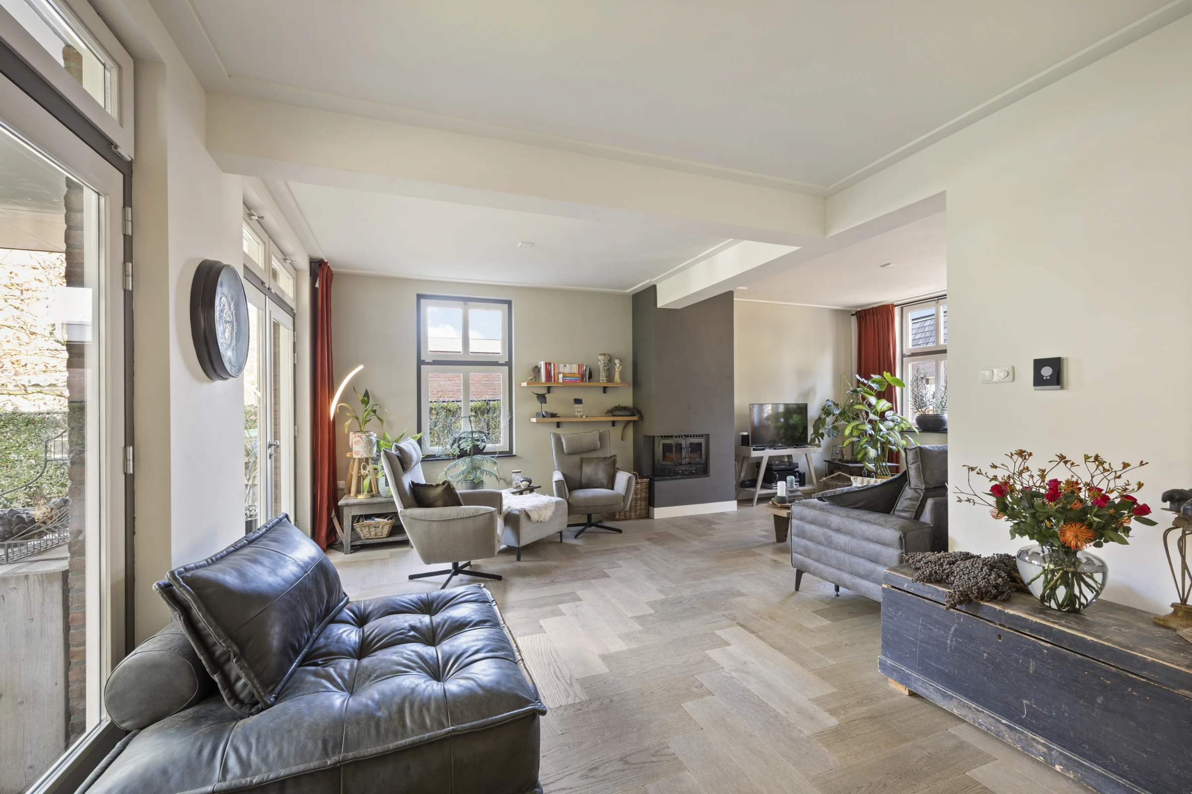 Bij de entree van dit sfeervolle woonhuis komt de charme je al tegemoet, mede door de authentieke vloer. Verder liggen in de hal de meterkast en het moderne gastentoilet. Vanuit de hal zijn vervolgens de woonkamer en werkkamer bereikbaar. De woonkamer ademt sfeer en karakter uit; het uitstekende niveau van afwerking, het fijne tuincontact door de vele raampartijen en maar liefst 4 dubbele tuindeuren en de gezellige haardpartij, dragen hier allen hun steentje aan bij. Aan de achterzijde is de woning uitgebouwd en hier is een riante woonkeuken gerealiseerd. Deze keuken bevat veel kastruimte, veel werkruimte op het luxe aanrechtblad en de volgende inbouwapparatuur: 4-pits inductie kookplaat, combi-oven, stoomoven, koelkast en vaatwasser. Vanuit deze luxe keuken is voorts de bijkeuken toegankelijk. Hier bevinden zich de aansluitpunten voor het witgoed, de collector van de zonnepanelen en de CV combiketel (Nefit, 2018, eigendom). Verder ligt op de begane grond nog een werkkamer / thuiskantoor. Deze kamer 3,5 x 2,5 meter groot en ligt aan de voorzijde van het woonhuis. Tenslotte beschikt de begane grond over vloerverwarming.