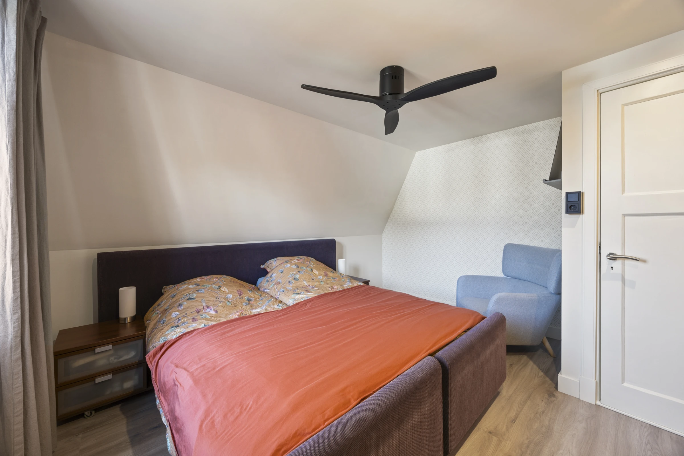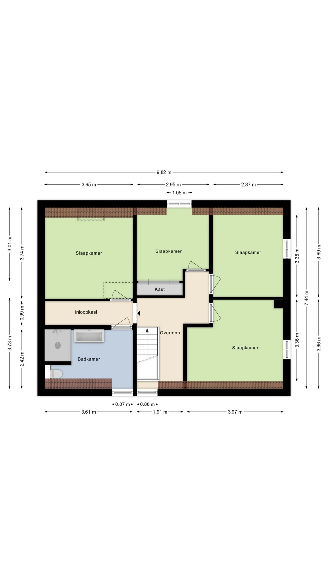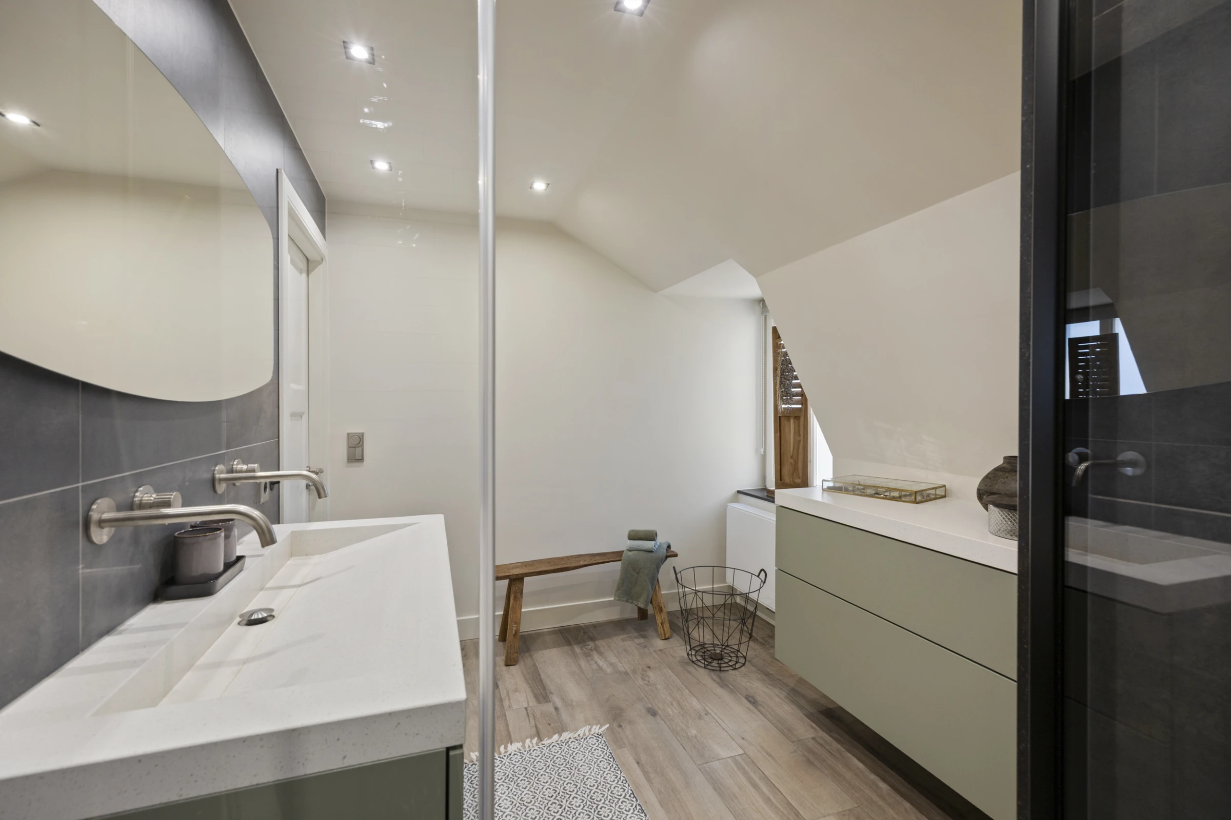 Via de overloop op de 1e verdieping zijn maar liefst 4 slaapkamers en de badkamer te bereiken. Net als de begane grond heeft ook deze verdieping een keurig niveau van afwerking. De slaapkamers hebben allen nette pvc vloeren, strak stucwerk en hardhouten kozijnen met HR++ beglazing. De luxe badkamer is voorzien van een ruime inloopdouche, een wastafelmeubel met dubbele wastafel en een 2e toilet. Tenslotte is op deze verdieping een inbouwkast gelegen.