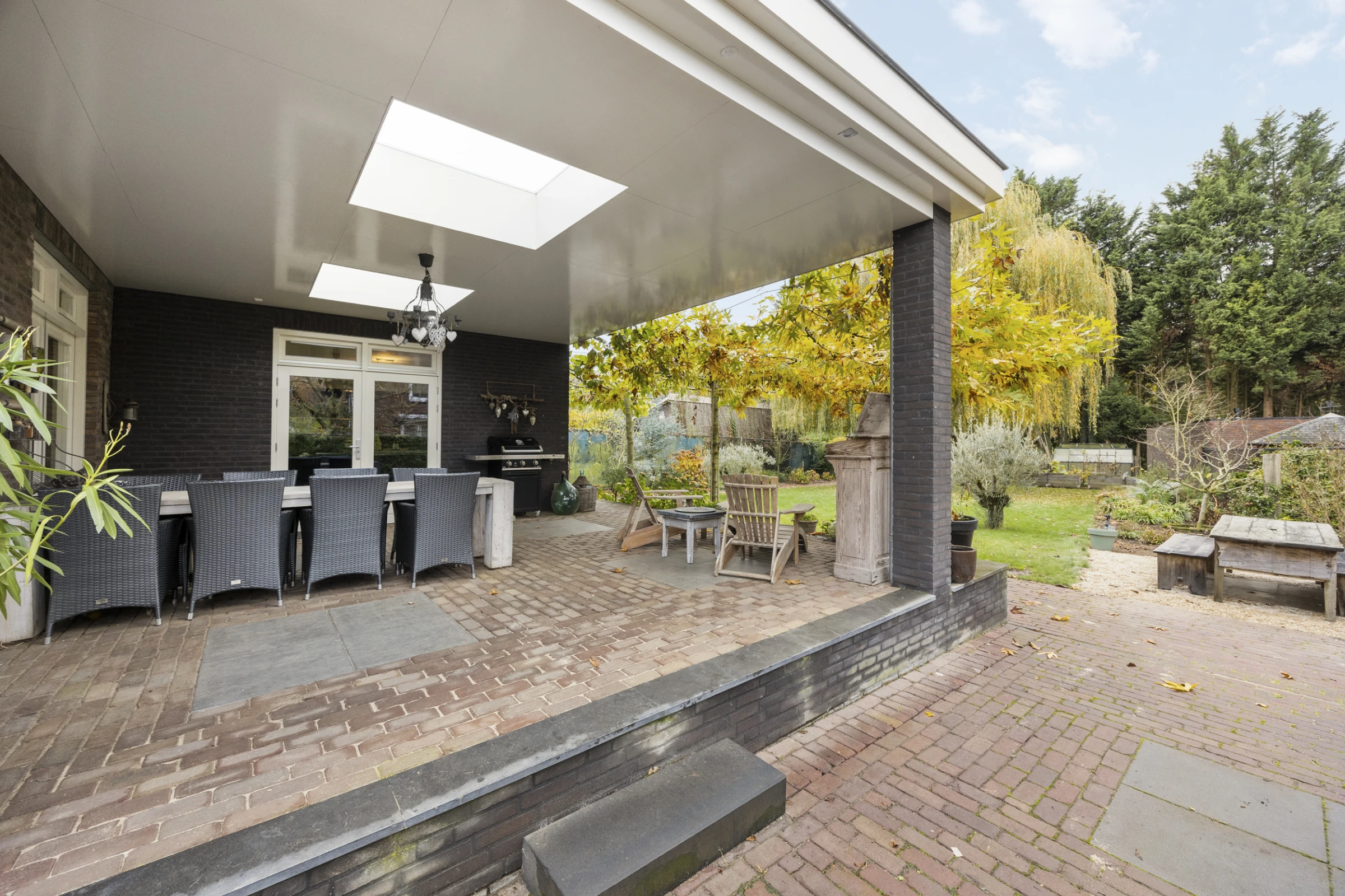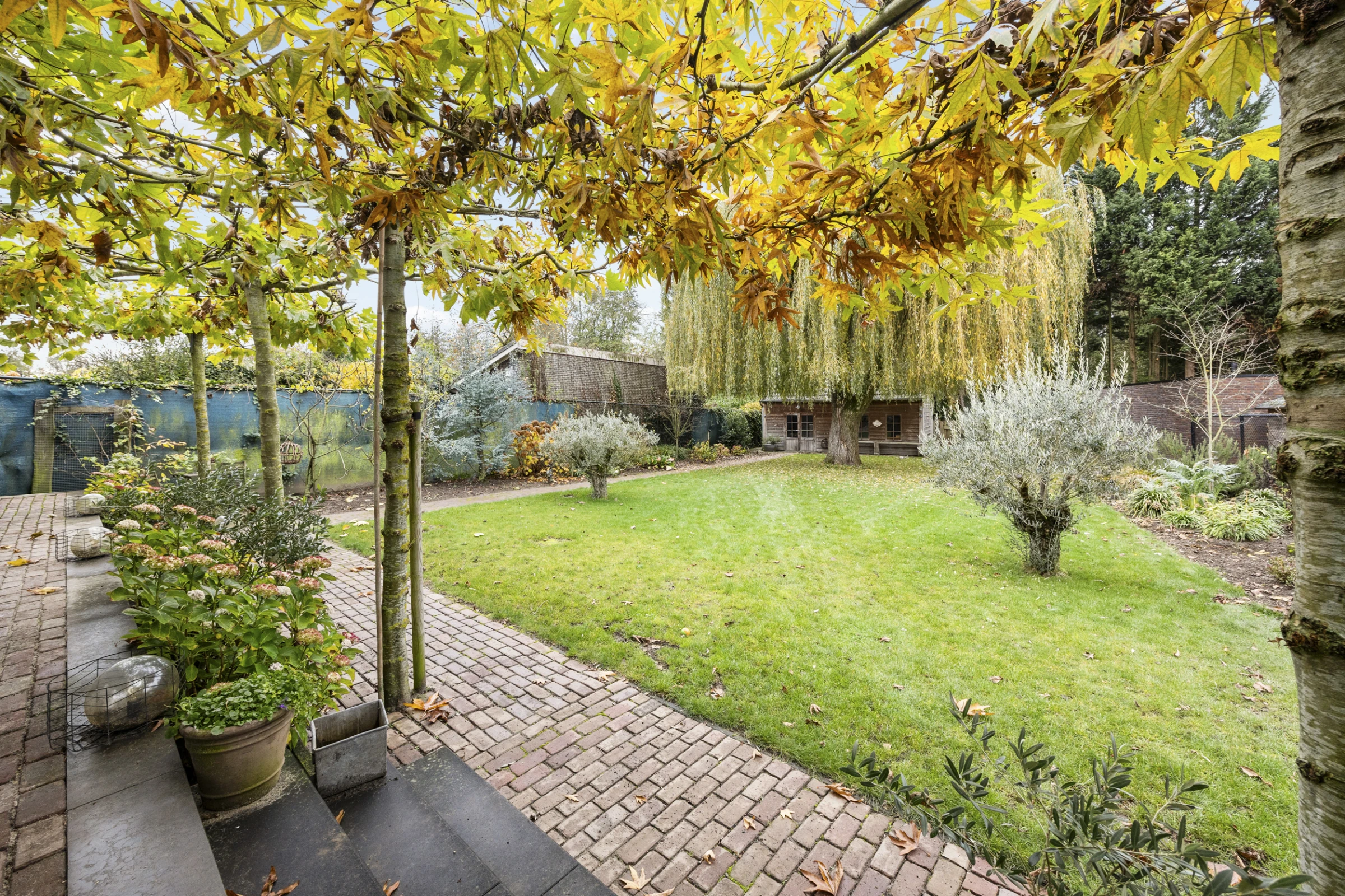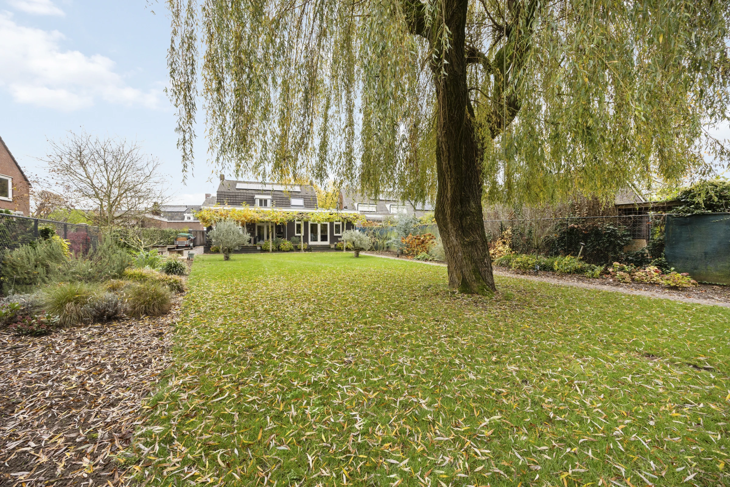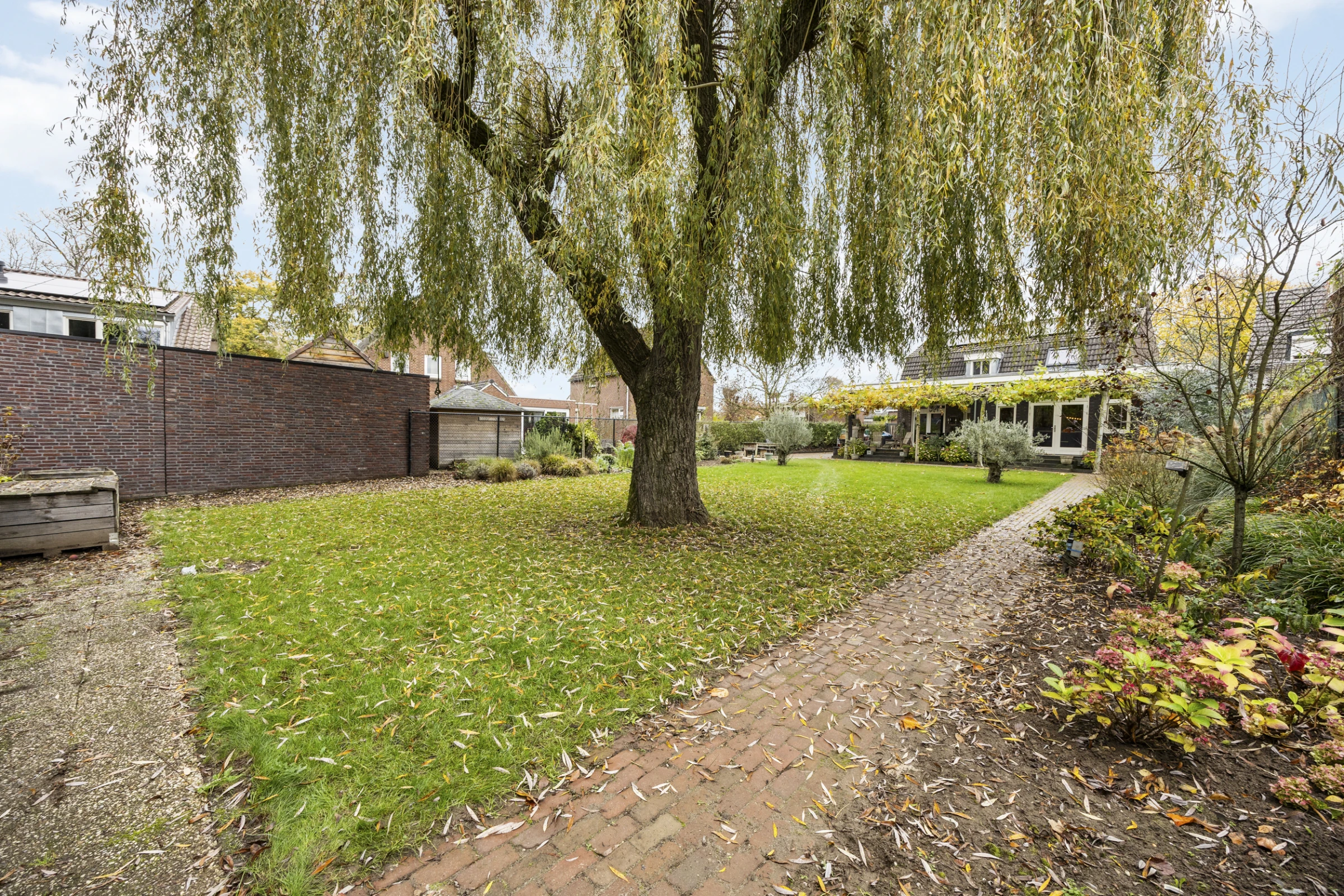 Dit stijlvolle woonhuis heeft ook nog een prachtige tuin, waar je kunt genieten van rust, ruimte en een fraai uitzicht op de mooie wilg die hier staat. De tuin heeft een royaal, overdekt terras, met 2 luxe lichtstraten. Dit terras biedt eenvoudig de mogelijkheid om tot een aanbouw te worden verbouwd, dus mocht je nog meer ruimte of een levensloopbestendige indeling wensen, dan is dit mogelijk. Nu biedt dit terras lekker veel ruimte, voor een lounge plek of een grote eettafel. De tuin is verder stijlvol aangelegd, met een groot gazon en volwassen beplanting. De tuin heeft zeer veel privacy en een gunstige ligging op het Westen. Tenslotte ligt in de tuin een riante tuinberging en heeft de woning een oprit met een poort, waardoor je op eigen perceel kunt parkeren en een auto, camper of caravan afgesloten op het perceel kan staan.
