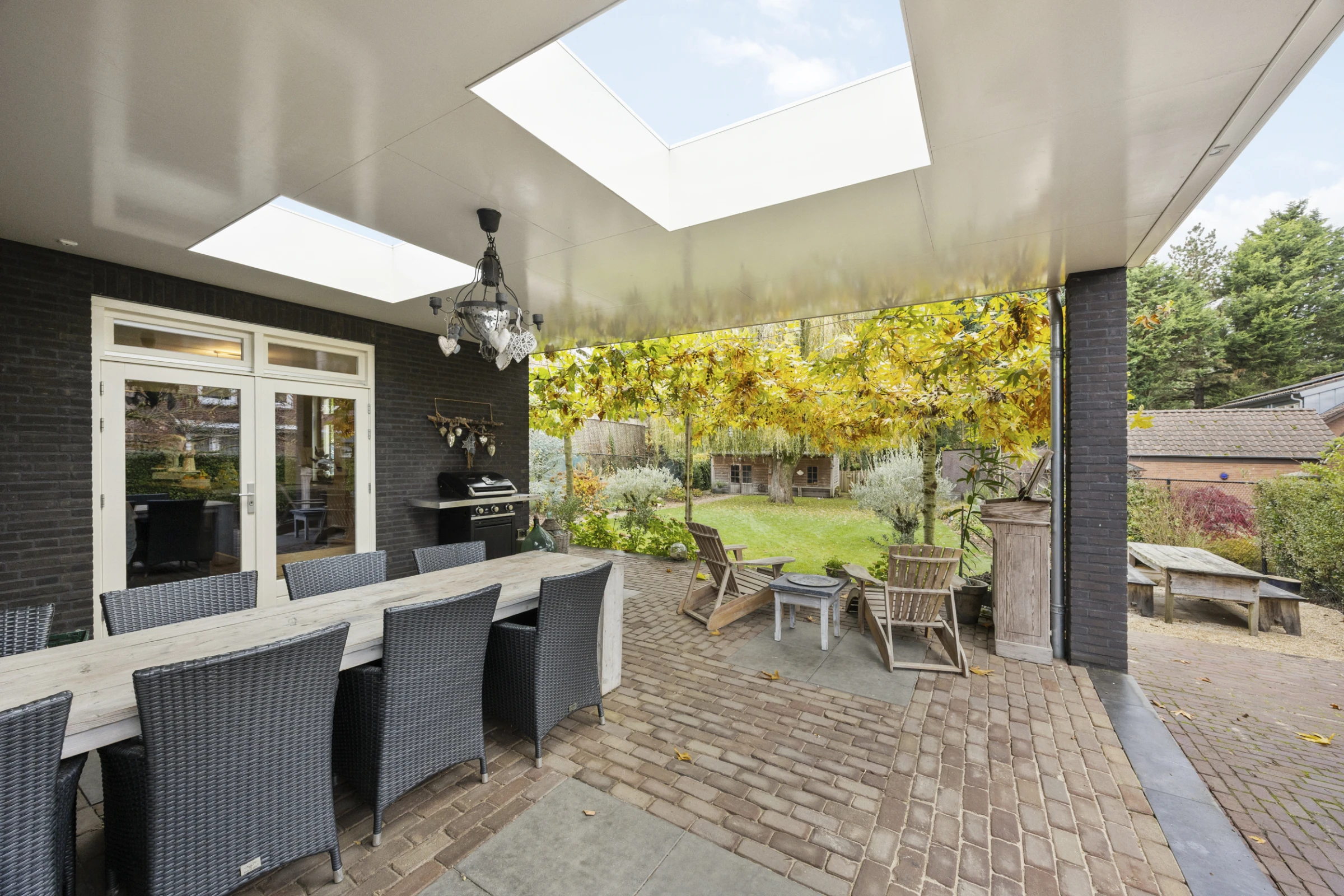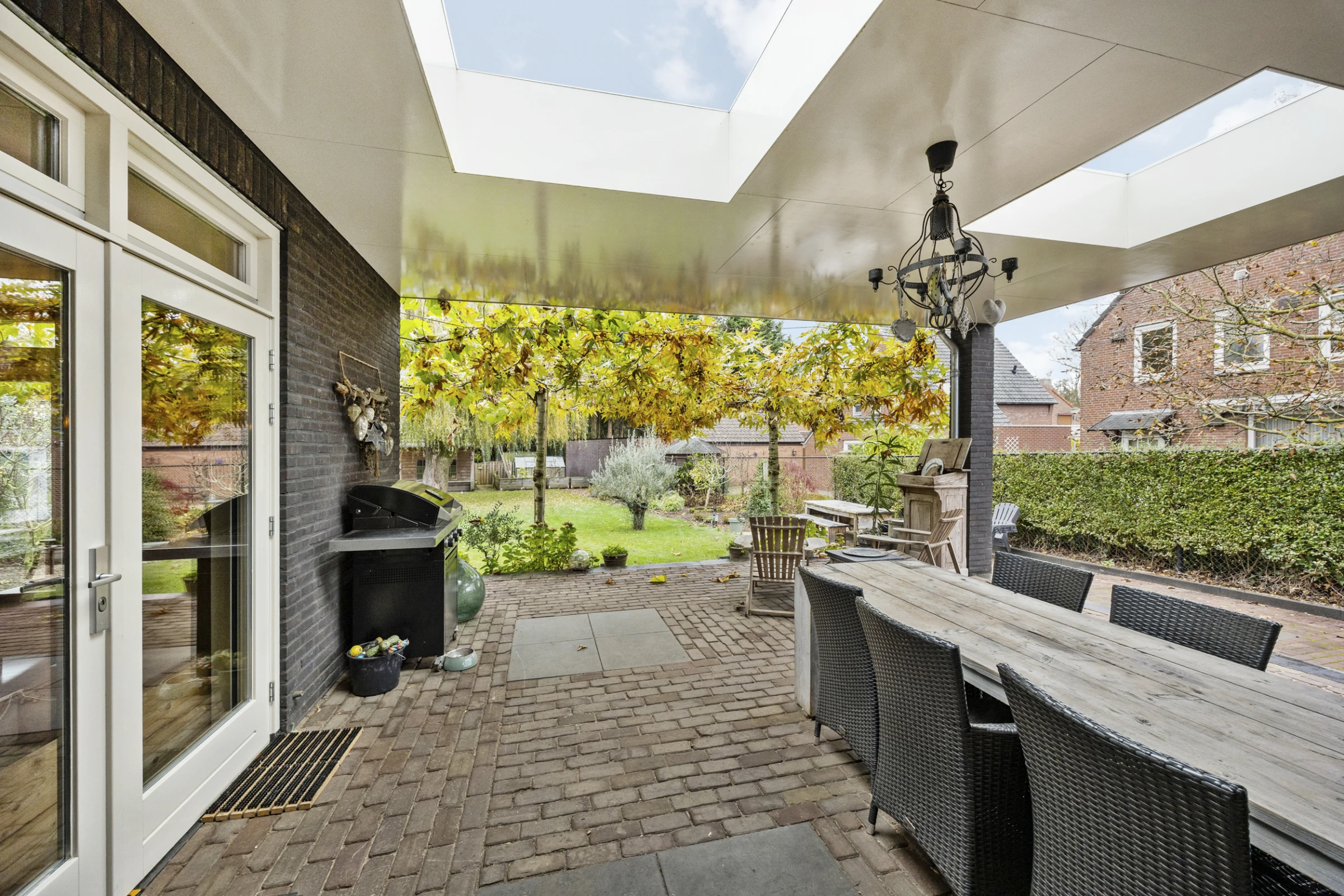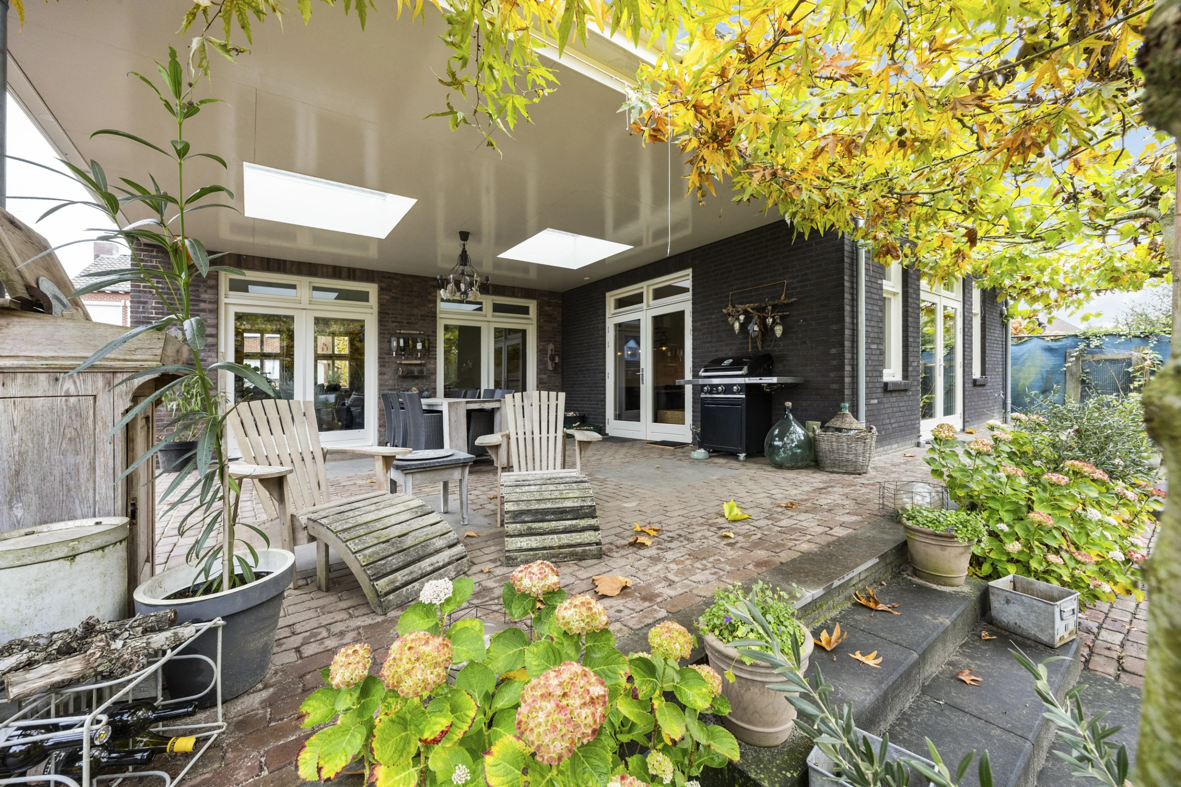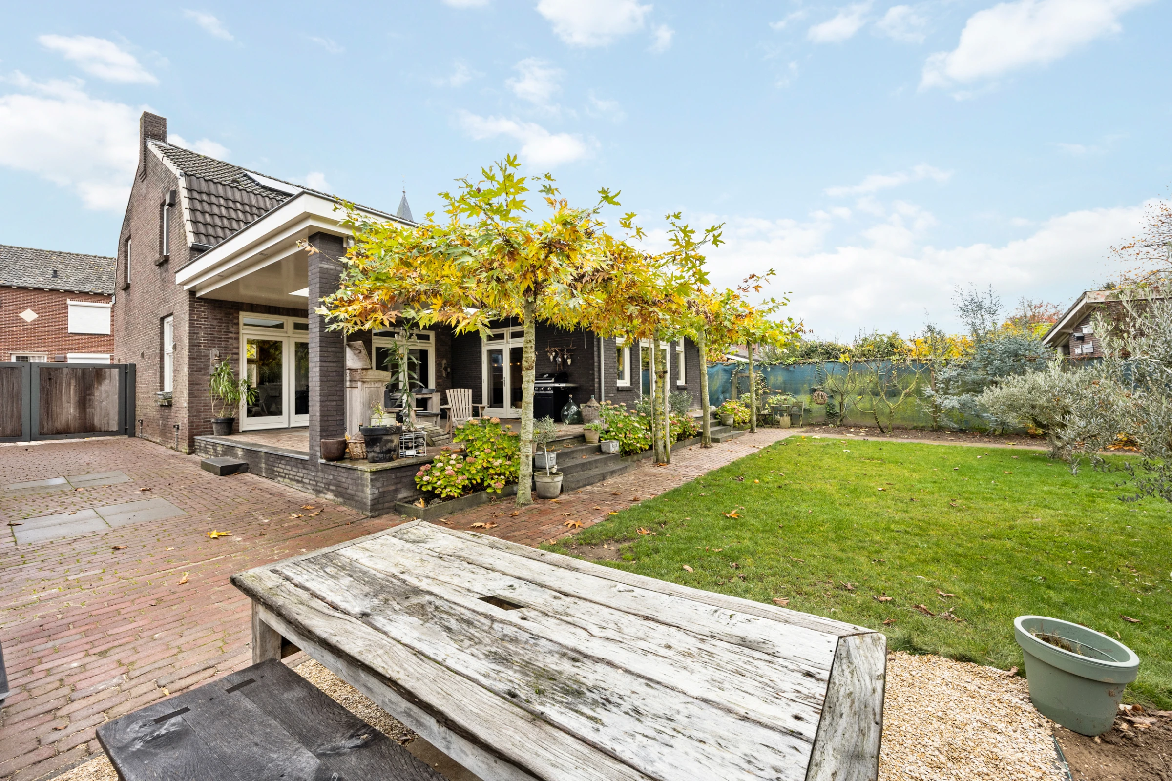 Dit stijlvolle woonhuis heeft ook nog een prachtige tuin, waar je kunt genieten van rust, ruimte en een fraai uitzicht op de mooie wilg die hier staat. De tuin heeft een royaal, overdekt terras, met 2 luxe lichtstraten. Dit terras biedt eenvoudig de mogelijkheid om tot een aanbouw te worden verbouwd, dus mocht je nog meer ruimte of een levensloopbestendige indeling wensen, dan is dit mogelijk. Nu biedt dit terras lekker veel ruimte, voor een lounge plek of een grote eettafel. De tuin is verder stijlvol aangelegd, met een groot gazon en volwassen beplanting. De tuin heeft zeer veel privacy en een gunstige ligging op het Westen. Tenslotte ligt in de tuin een riante tuinberging en heeft de woning een oprit met een poort, waardoor je op eigen perceel kunt parkeren en een auto, camper of caravan afgesloten op het perceel kan staan.