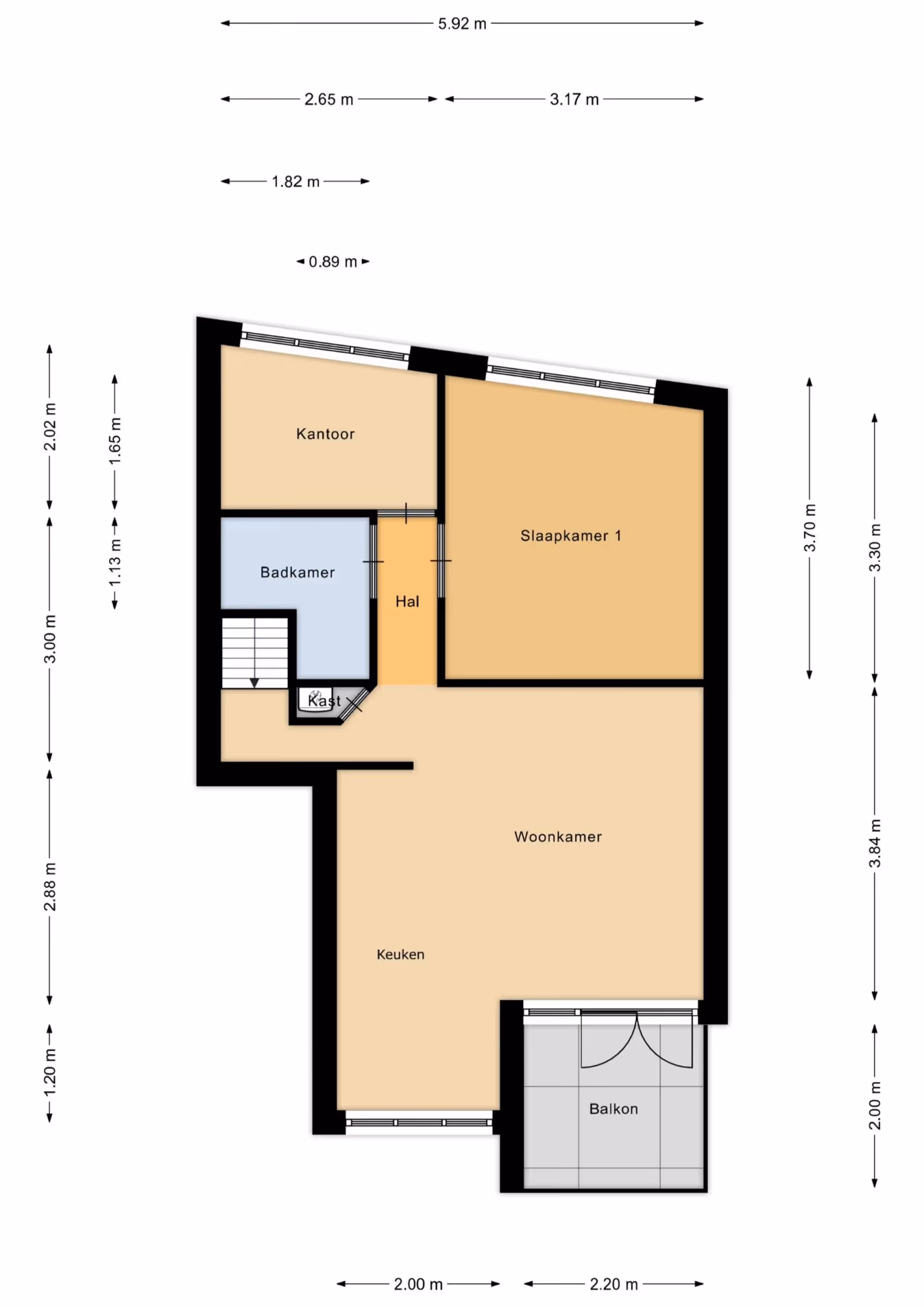 Het appartement zelf ligt op de 3e verdieping, maar je voordeur ligt op de 2e verdieping. Je komt binnen in de hal en de trapopgang brengt je naar de woonkamer. Deze woonkamer heeft het lekker veel lichtinval, is gelegen aan de achterzijde en staat in verbinding met de half open keuken. Deze keuken is voorzien van een inductiekookplaat met afzuigkap, koelkast en oven. Ook is vanuit de woonkamer het balkon / dakterras te bereiken en tenslotte ligt in de woonkamer een bergkast met de opstelplaats voor het witgoed en de CV combiketel (Intergas, eigendom, 2020). Als je vanuit de woonkamer naar de voorzijde loopt, komt je achtereenvolgens bij de badkamer, de hoofdslaapkamer en de 2e slaapkamer / werkkamer. De badkamer is netjes, doch eenvoudig en bestaat uit een douchecabine, toilet en wastafel. De slaapkamer en de 2e (slaap)kamer hebben allebei een prima niveau van afwerking en liggen beide aan de voorzijde van het appartement.