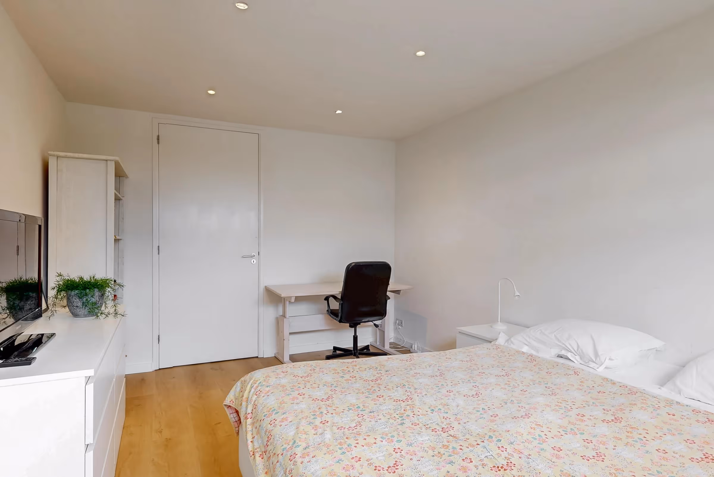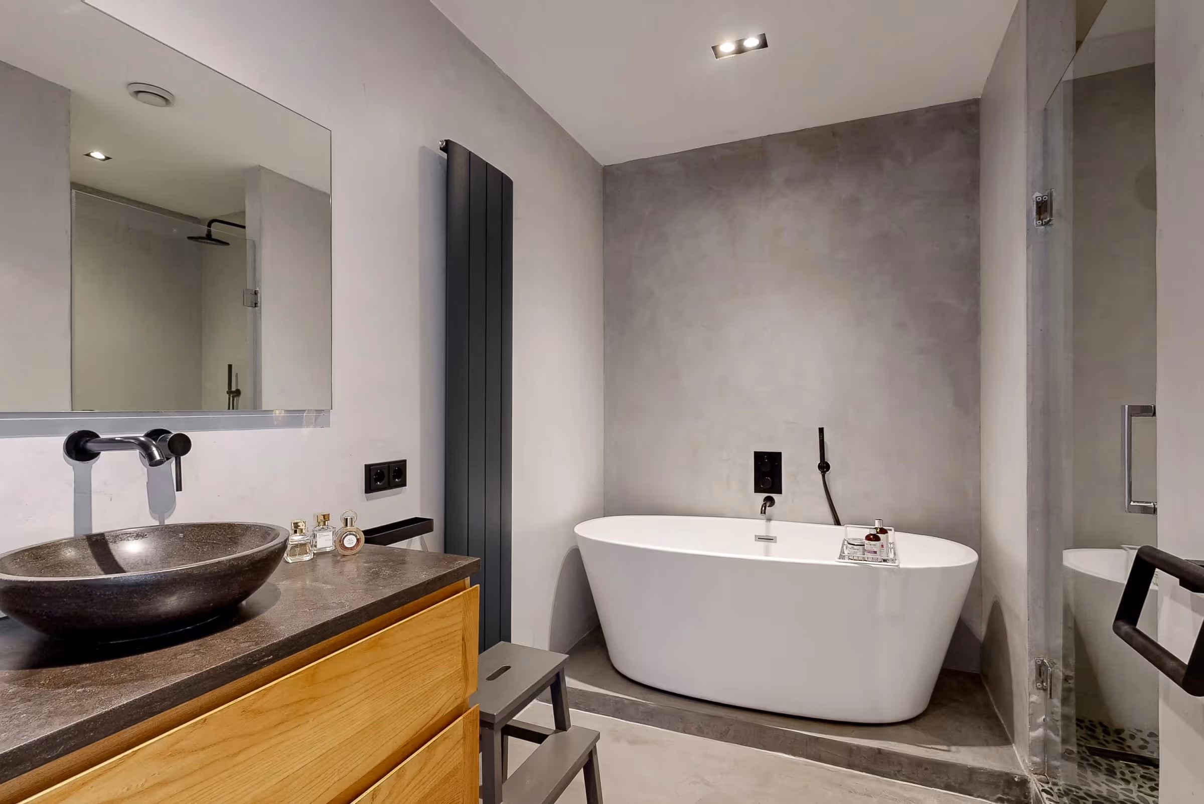 Via de overloop op de 1e verdieping zijn 3 ruime slaapkamers, een 4e werk- of studeerkamer, de moderne badkamer en een apart toilet te bereiken. De hoofdslaapkamer is royaal en bevat een wastafelmeubel met 2 kranen. Alle (slaap)kamers op deze verdieping hebben een keurig niveau van afwerking, met een massieve, houten vloer en stucwerk op de wanden. De moderne badkamer bestaat uit een vrijstaand ligbad, een ruime inloopdouche en een wastafelmeubel. Naast de badkamer ligt een apart toilet. Verder heeft deze verdieping 2 ingebouwde airco’s.