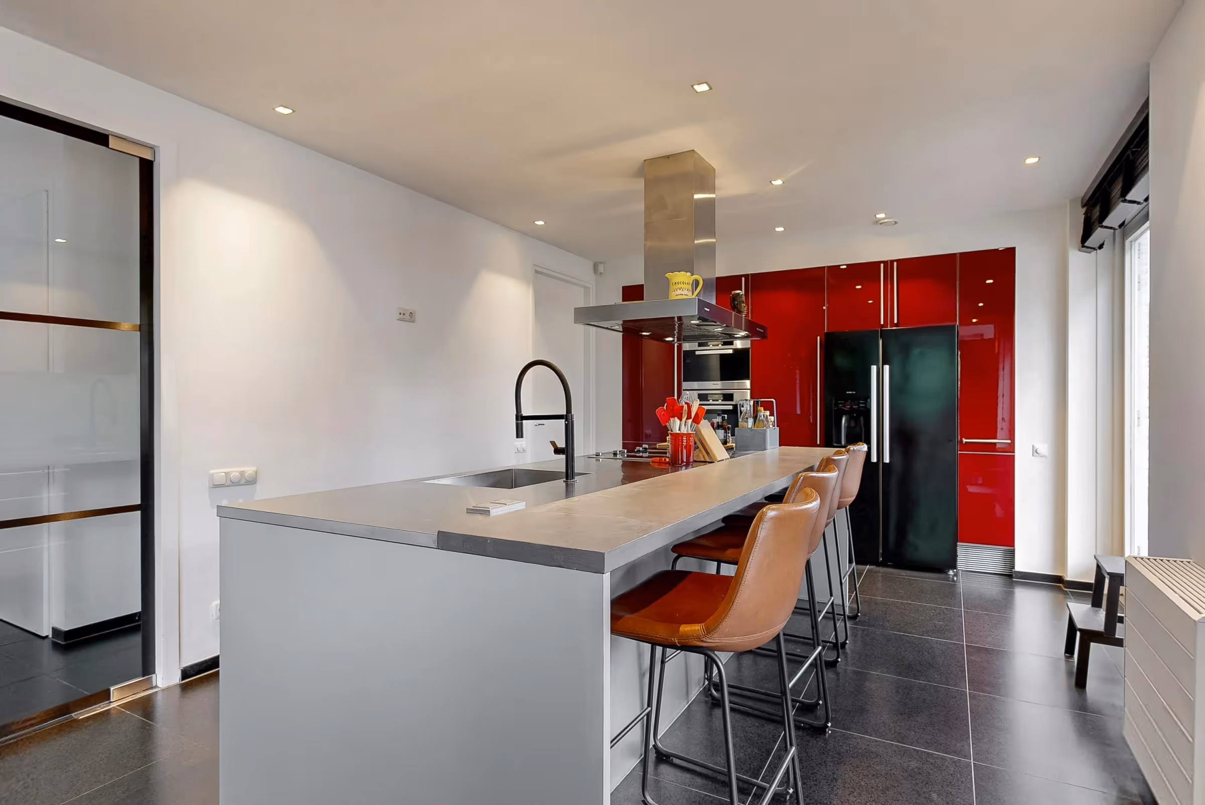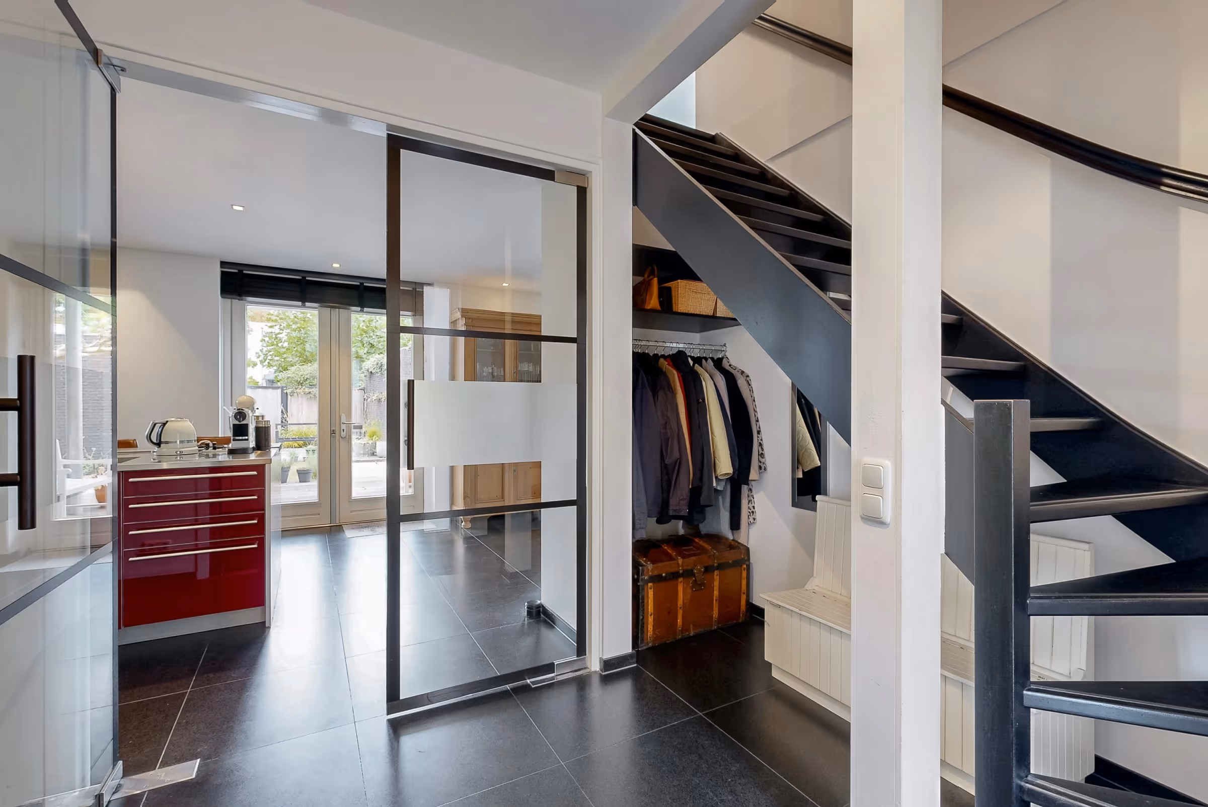 Bij de entree van dit stijlvolle woonhuis zijn de zwarte, stalen deuren meteen een fraaie eyecatcher. De hal en woonkamer zijn voorzien van natuurstenen vloer en vloerverwarming. Verder liggen in de hal het toilet en de meterkast. De woonkamer met open keuken heeft een prachtige lichtinval, door de grote raampartijen die bijna overal doorlopen tot vloerniveau. Al deze raampartijen beschikken over automatisch screens, waardoor je prachtig kunt spelen met het daglicht en de sfeer in de kamer. Tevens heb je hierdoor ook een prettig tuincontact, hetgeen de kamer een heerlijk ruimtelijk gevoel geeft. De Poggenpohl leefkeuken uit 2005 bestaat uit een groot kook- en spoeleiland en een royale kastenwand. Alle inbouwapparatuur is van Siemens of Miele en omvat de volgende apparaten: een elektrische kookplaat met (gas)wokbrander, afzuigkap, vaatwasser, stoomoven en combi-oven. Vanuit de keuken is de bijkeuken toegankelijk, waar een 2e keukenblok is geplaats, met extra kastruimte en waar het witgoed en de technische installaties geplaatst zijn (WTW unit, CV ketel en boiler).Achter de bijkeuken ligt nog een extra bergruimte met kast. Ideaal voor het opbergen van bijvoorbeeld de winterkleding en kerstspullen. Ook ligt hier nog een royale slaapkamer van bijna 23 m2.