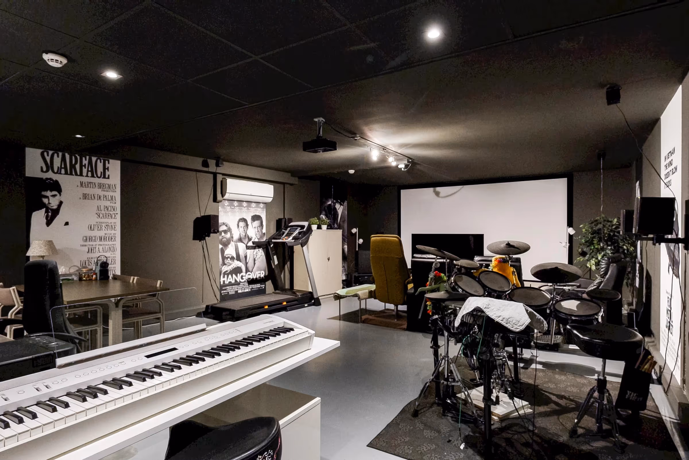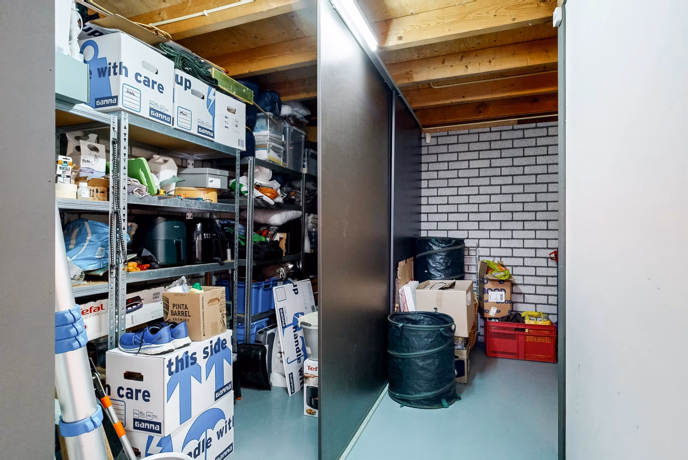 Deze woning beschikt over een luxe souterrain, onder de tuinberging. Deze ruimte is te bereiken vanuit de tuinberging en is 51 m² groot (en deze oppervlakte valt niet onder de 185 m² woonoppervlakte van het huis). Deze kamer heeft een keurig niveau van afwerking, is voorzien van een airco, internet en veel stroompunten en is momenteel als thuisbioscoop en game-room in gebruik. De bioscoop (scherm, beamer en stoelen) krijg je bij de woning erbij. Uiteraard kan deze fijne extra kamer op tal van manieren gebruikt worden, denk aan een muziekstudio (de ruimte is oorspronkelijk als drumstudio aangelegd en volledig geluidsdicht), mancave of sportruimte. Let wel, deze ruimte is via de tuinberging te bereiken en niet rechtstreeks vanuit de woning.