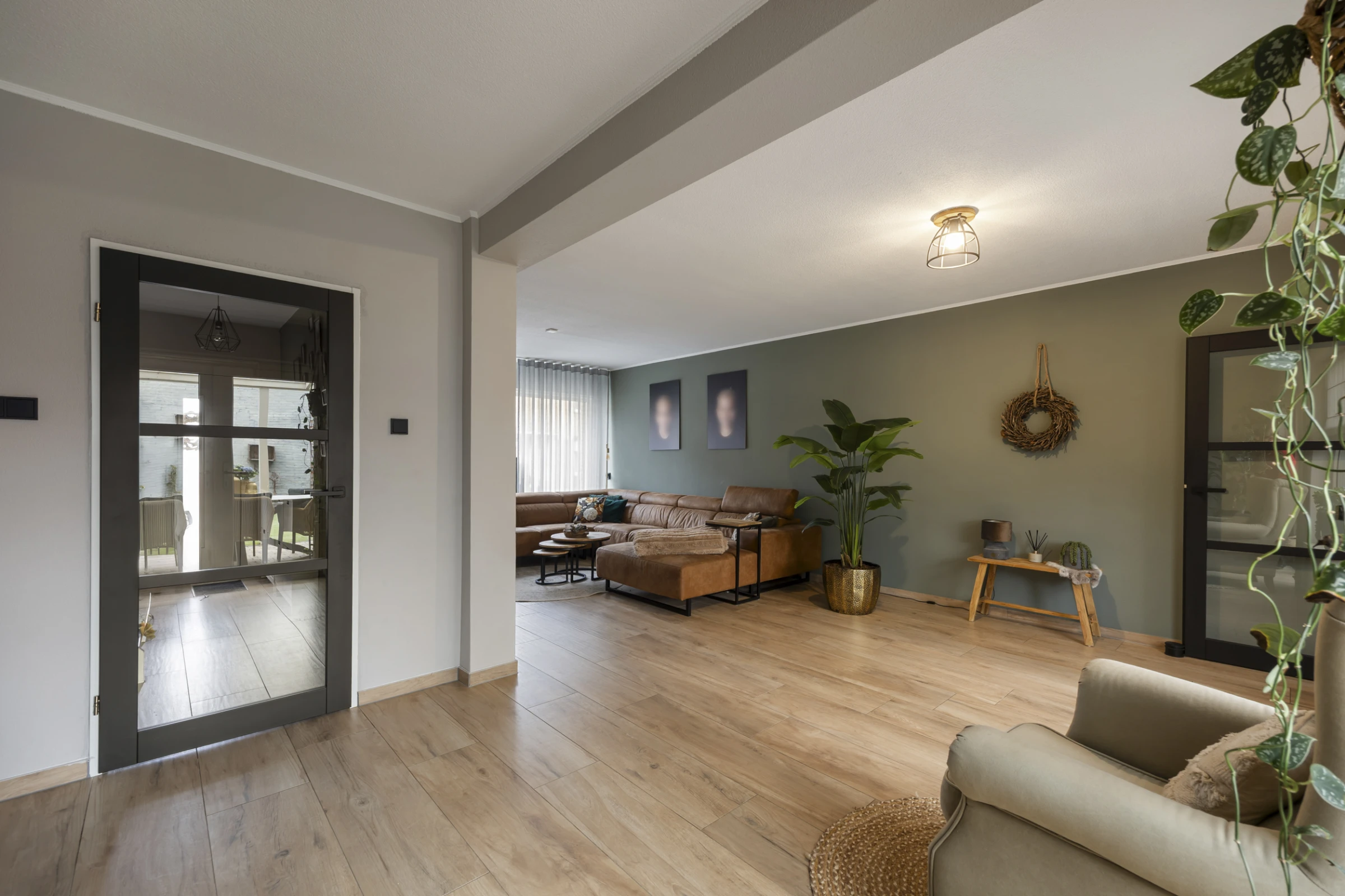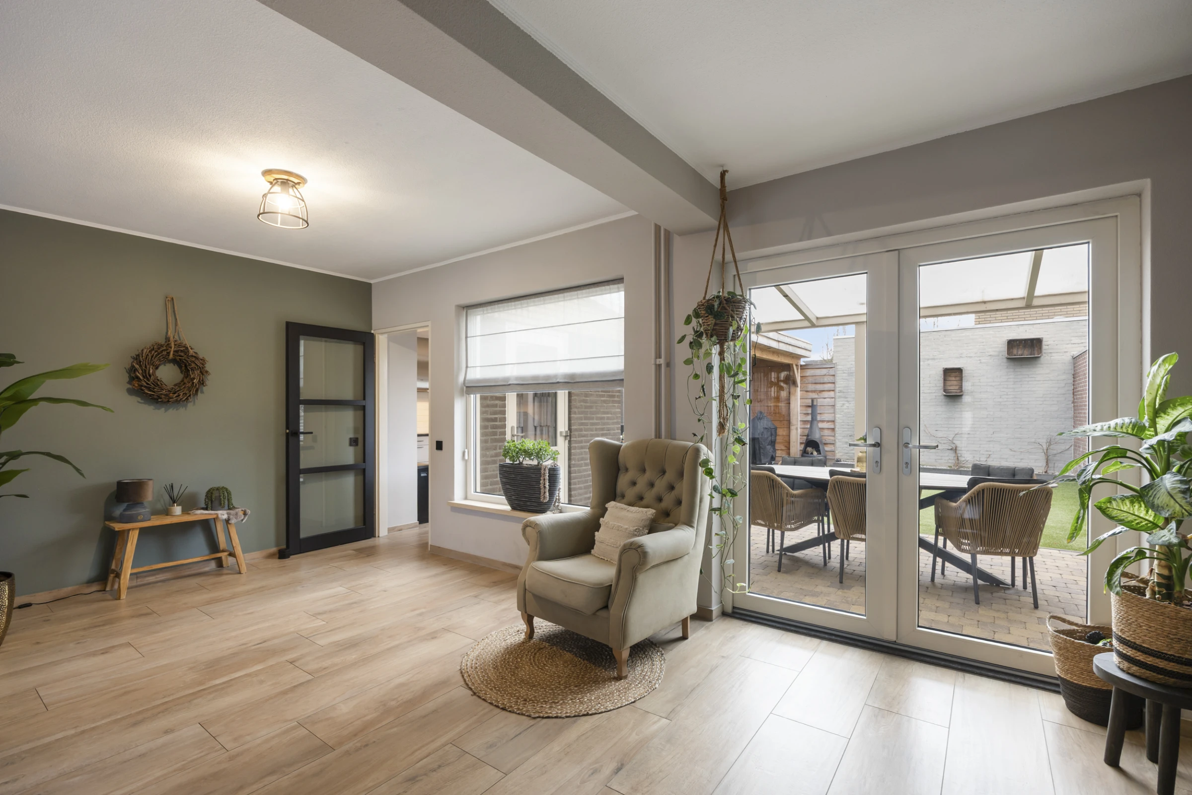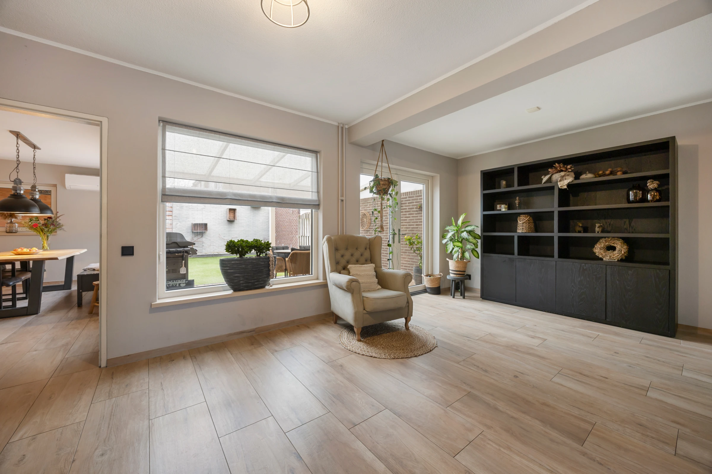 Entree in de hal met toilet met fonteintje, meterkast, trapkast en toegang tot de woonkamer. De woonkamer is een sfeervolle ruimte met een uitstekend niveau van afwerking. Aan de achterzijde heeft de kamer dubbele openslaande deuren, waardoor je een fijn contact hebt met de achtertuin. De woonkamer heeft verder een stijlvolle tegelvloer, met houtlook en de begane grond beschikt voor een groot deel over vloerverwarming. Voorts is vanuit de woonkamer de leefkeuken bereikbaar. Deze mooie ruimte biedt plaats aan een grote eettafel en heeft een riant keukenblok, met de volgende inbouwapparatuur: een kookplaat met RVS afzuigkap, koelkast, oven en vaatwasser. Tenslotte zijn vanuit deze leefkeuken zowel de tuin, als de inpandige garage toegankelijk.