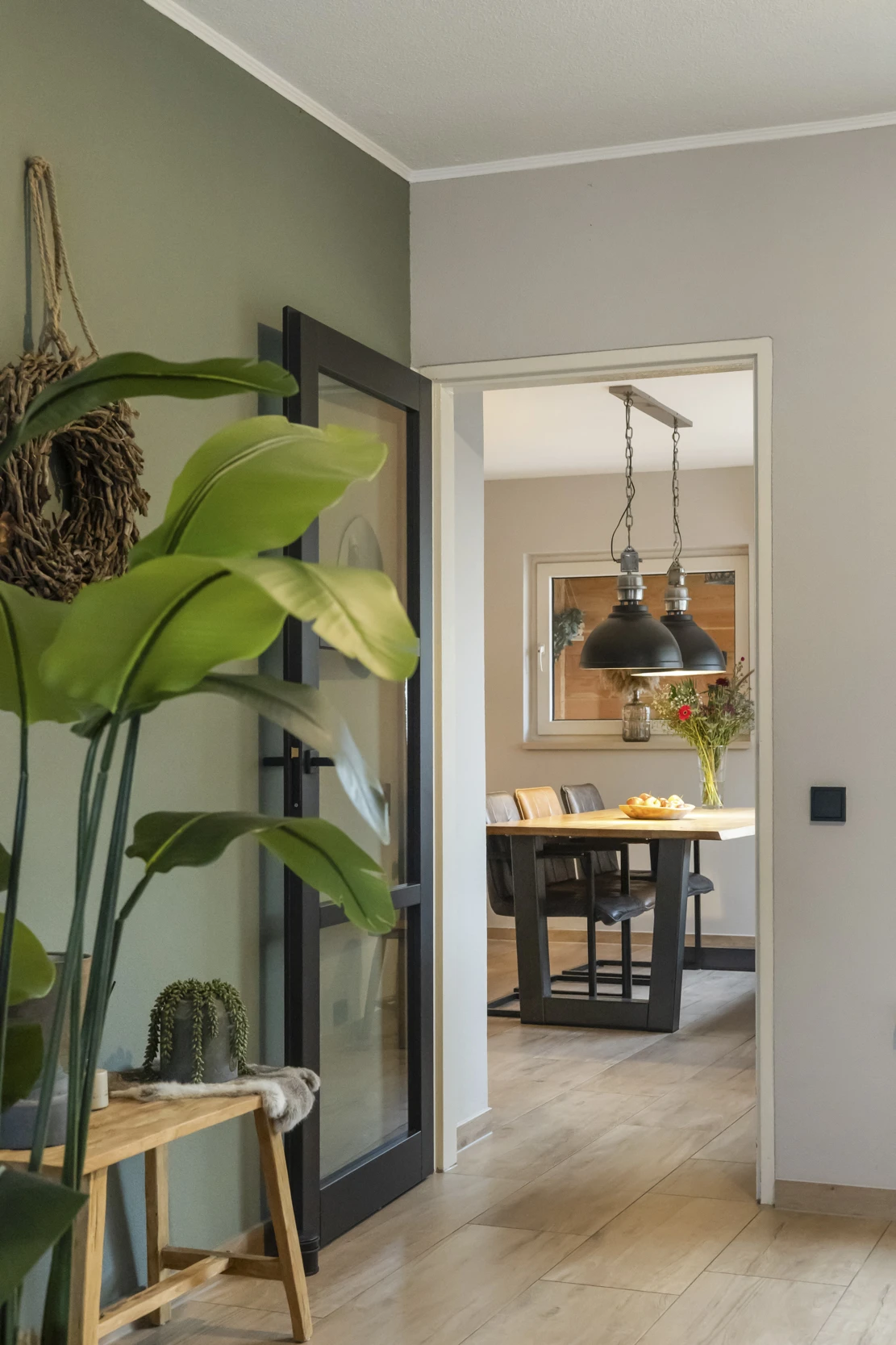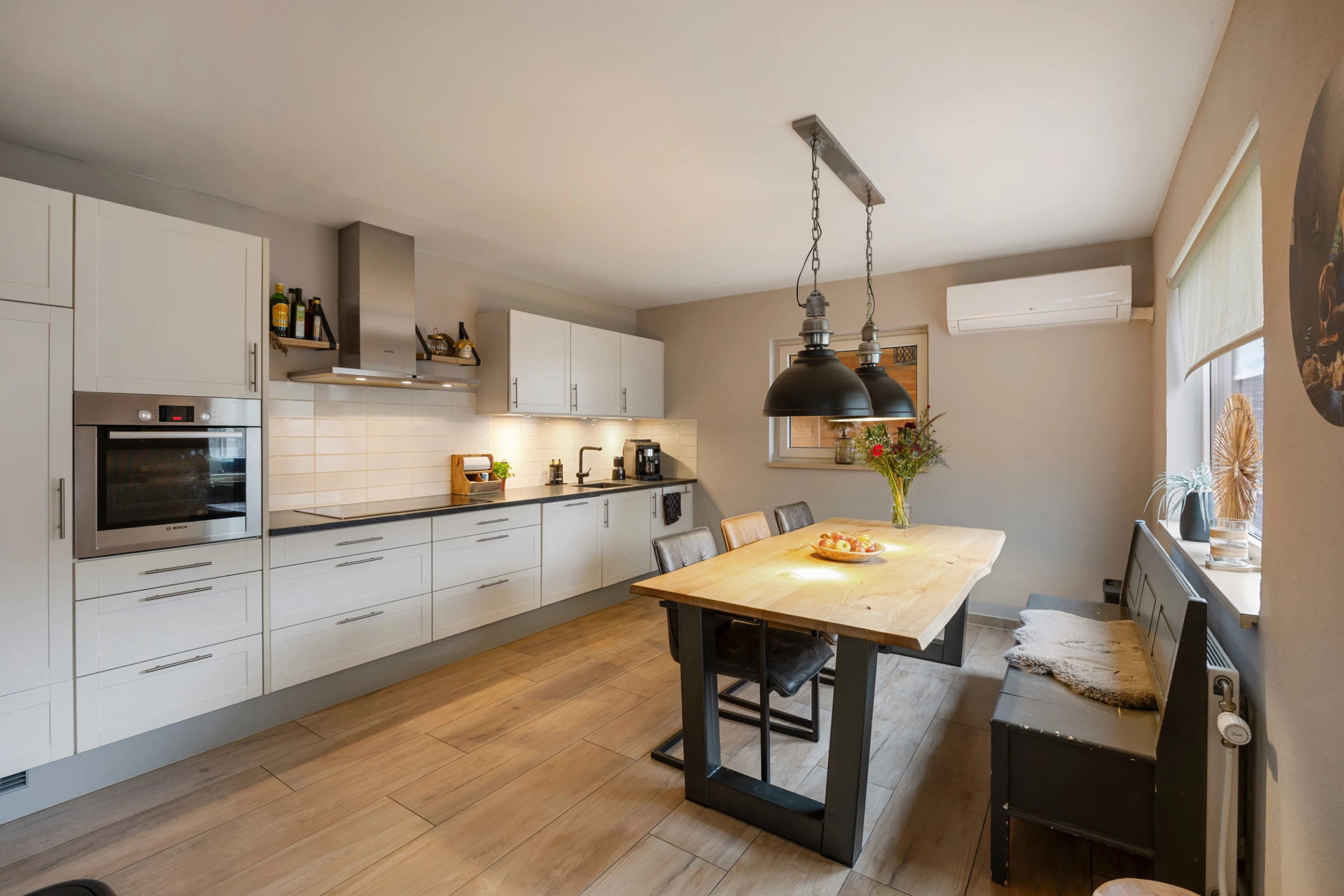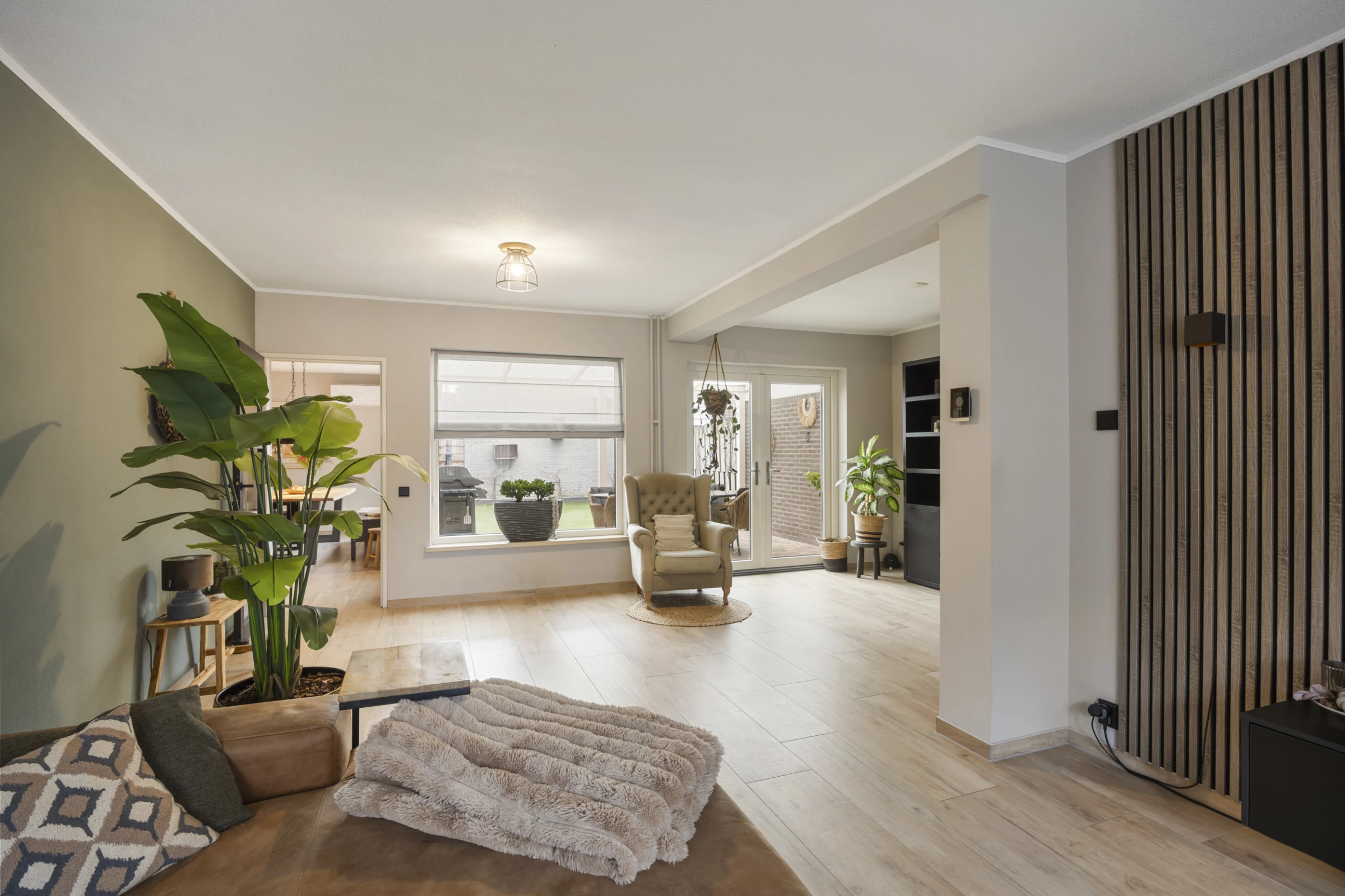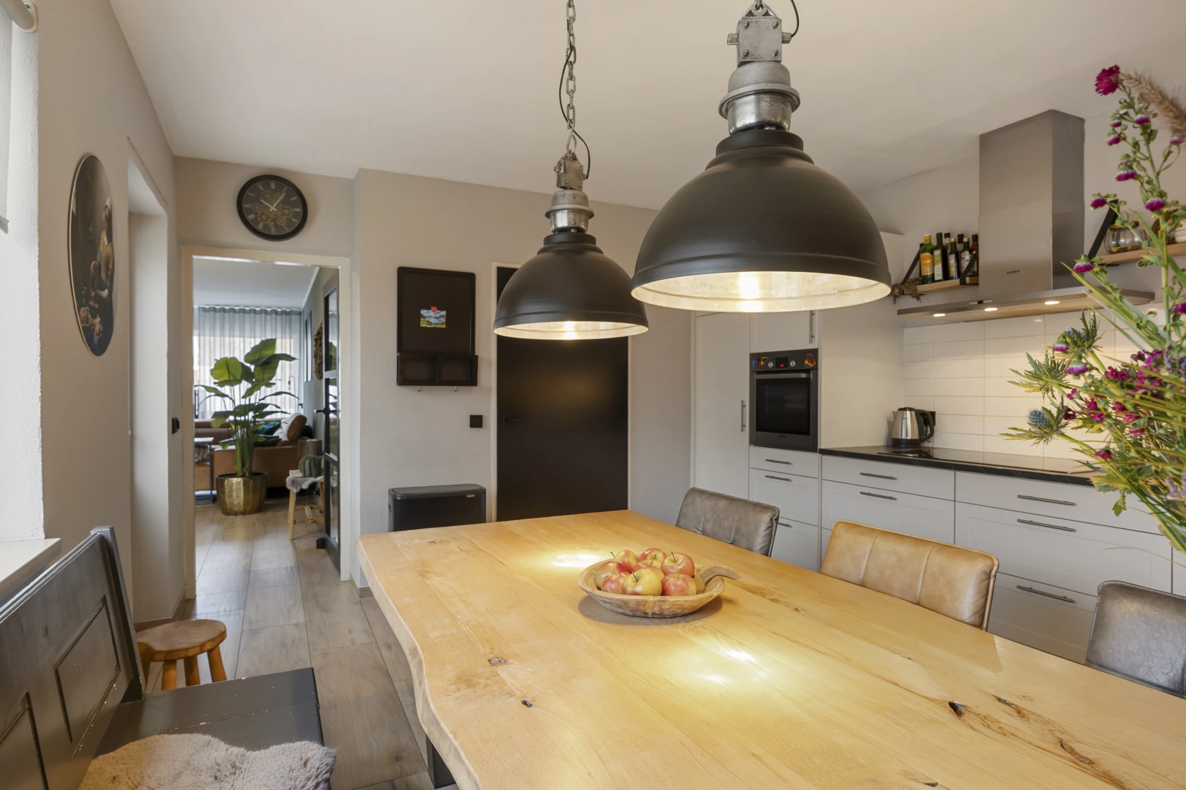Entree in de hal met toilet met fonteintje, meterkast, trapkast en toegang tot de woonkamer. De woonkamer is een sfeervolle ruimte met een uitstekend niveau van afwerking. Aan de achterzijde heeft de kamer dubbele openslaande deuren, waardoor je een fijn contact hebt met de achtertuin. De woonkamer heeft verder een stijlvolle tegelvloer, met houtlook en de begane grond beschikt voor een groot deel over vloerverwarming. Voorts is vanuit de woonkamer de leefkeuken bereikbaar. Deze mooie ruimte biedt plaats aan een grote eettafel en heeft een riant keukenblok, met de volgende inbouwapparatuur: een kookplaat met RVS afzuigkap, koelkast, oven en vaatwasser. Tenslotte zijn vanuit deze leefkeuken zowel de tuin, als de inpandige garage toegankelijk.