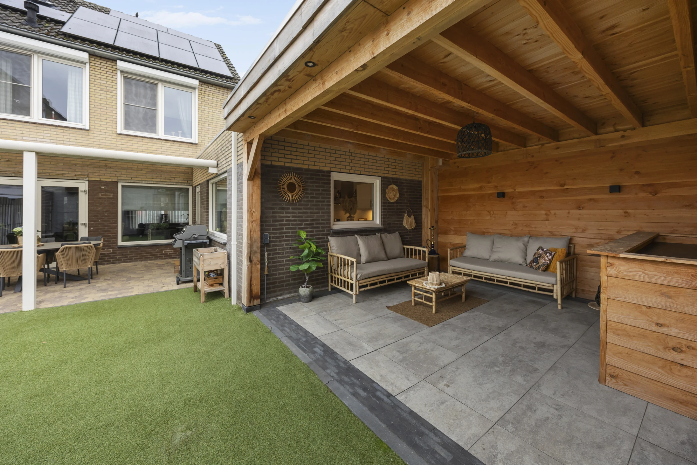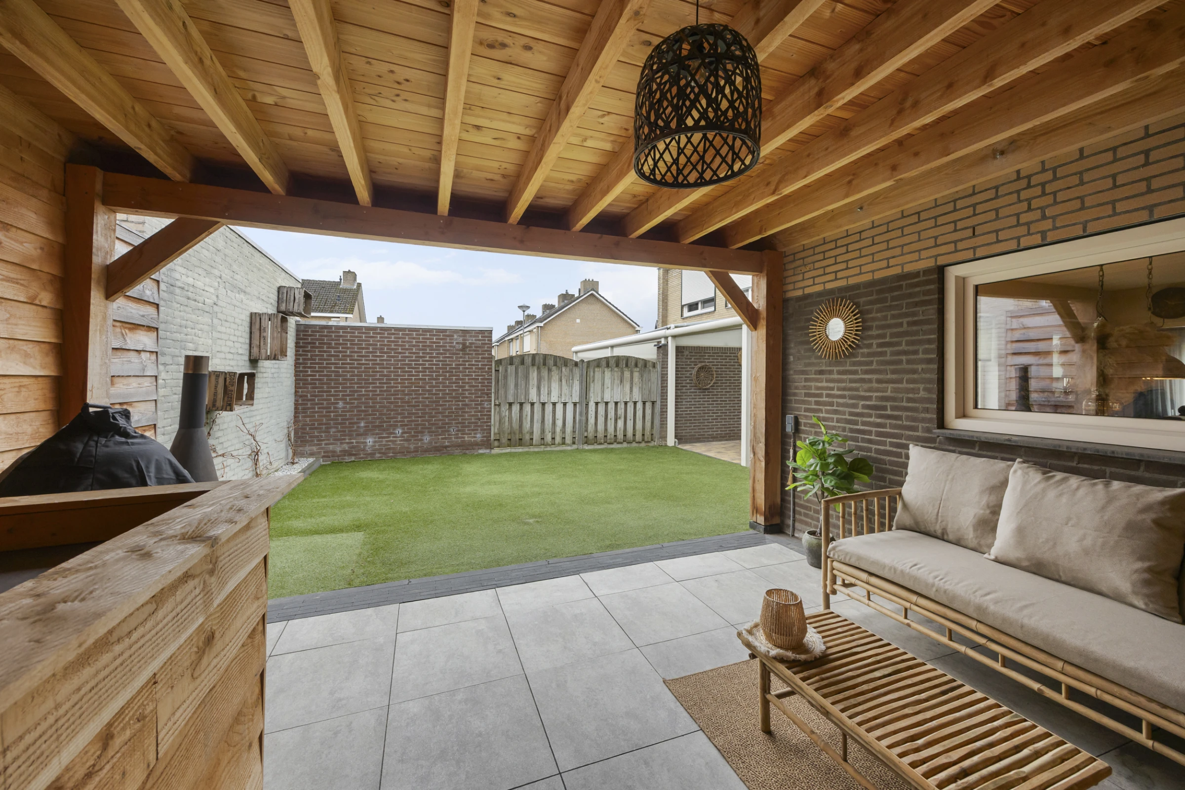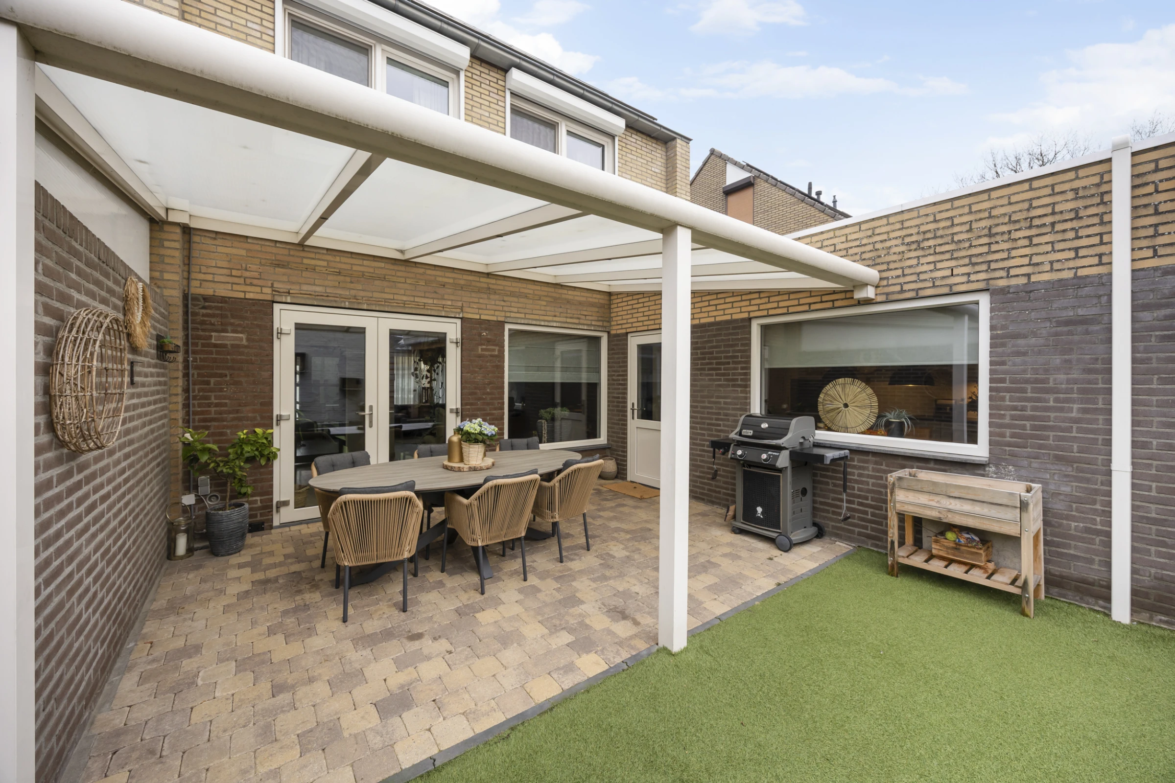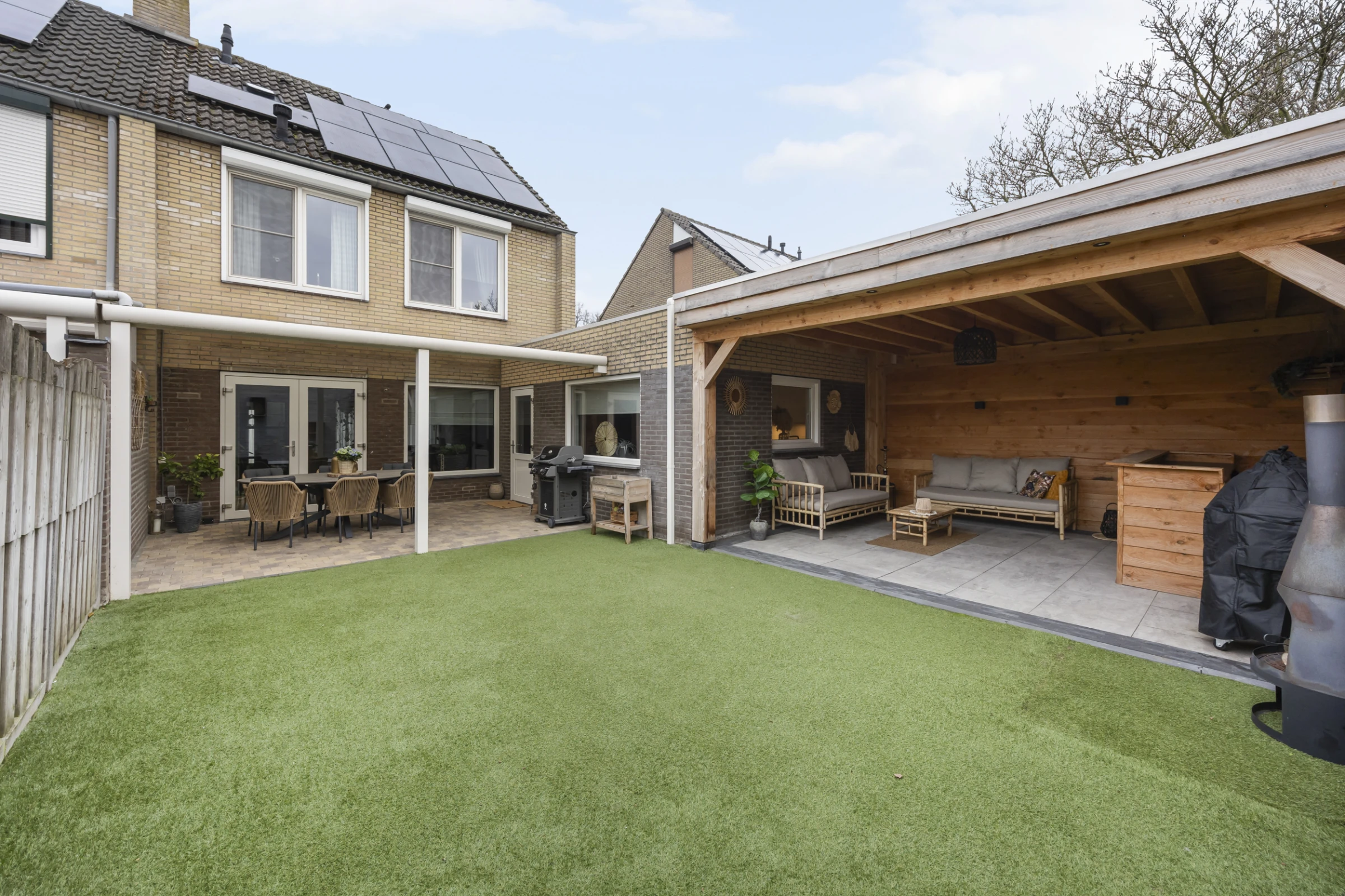 Deze fijne woning heeft ook nog eens een hele mooie achtertuin, welke bestaat uit maar liefst 2 overdekte terrassen en een kunstgras gazon. De tuin is geheel omsloten en helemaal onderhoudsvriendelijk. Achter de woonkamer ligt de aluminium/kunststof terrasoverkapping, maar de meest luxe (houten) terrasoverkapping, bevindt zich achter de keuken. Hier is het een groot deel van het jaar erg goed vertoeven en dit is een ideale plek voor een grote zithoek, buitenkeuken of een (thuis)bar. Tenslotte ligt aan de voorzijde nog een oprit.