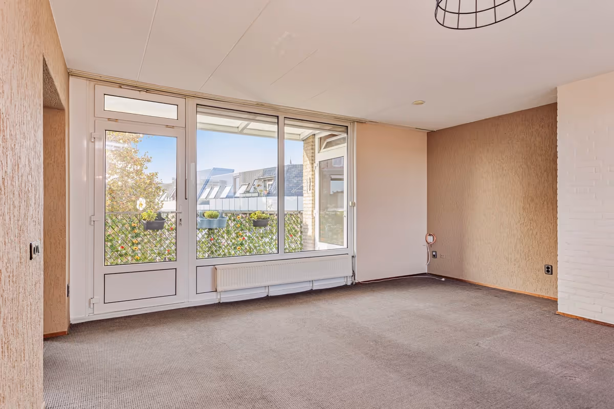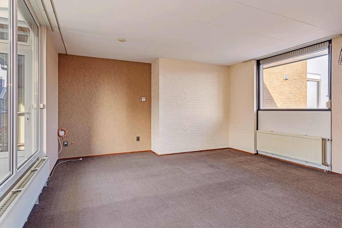 De woonkamer is verdeeld in een zit- en eetkamer en door het feit dat het appartement grote kozijnen heeft, heeft het lekker veel lichtinval.