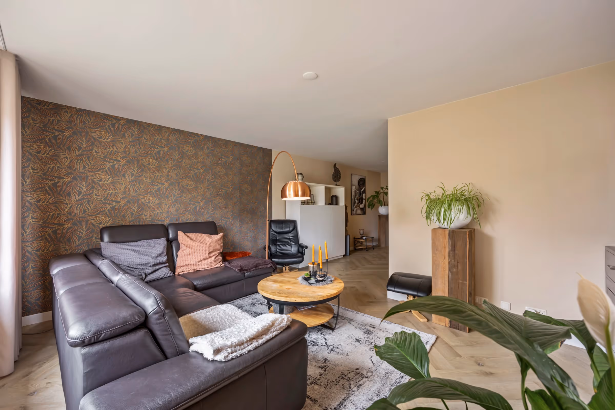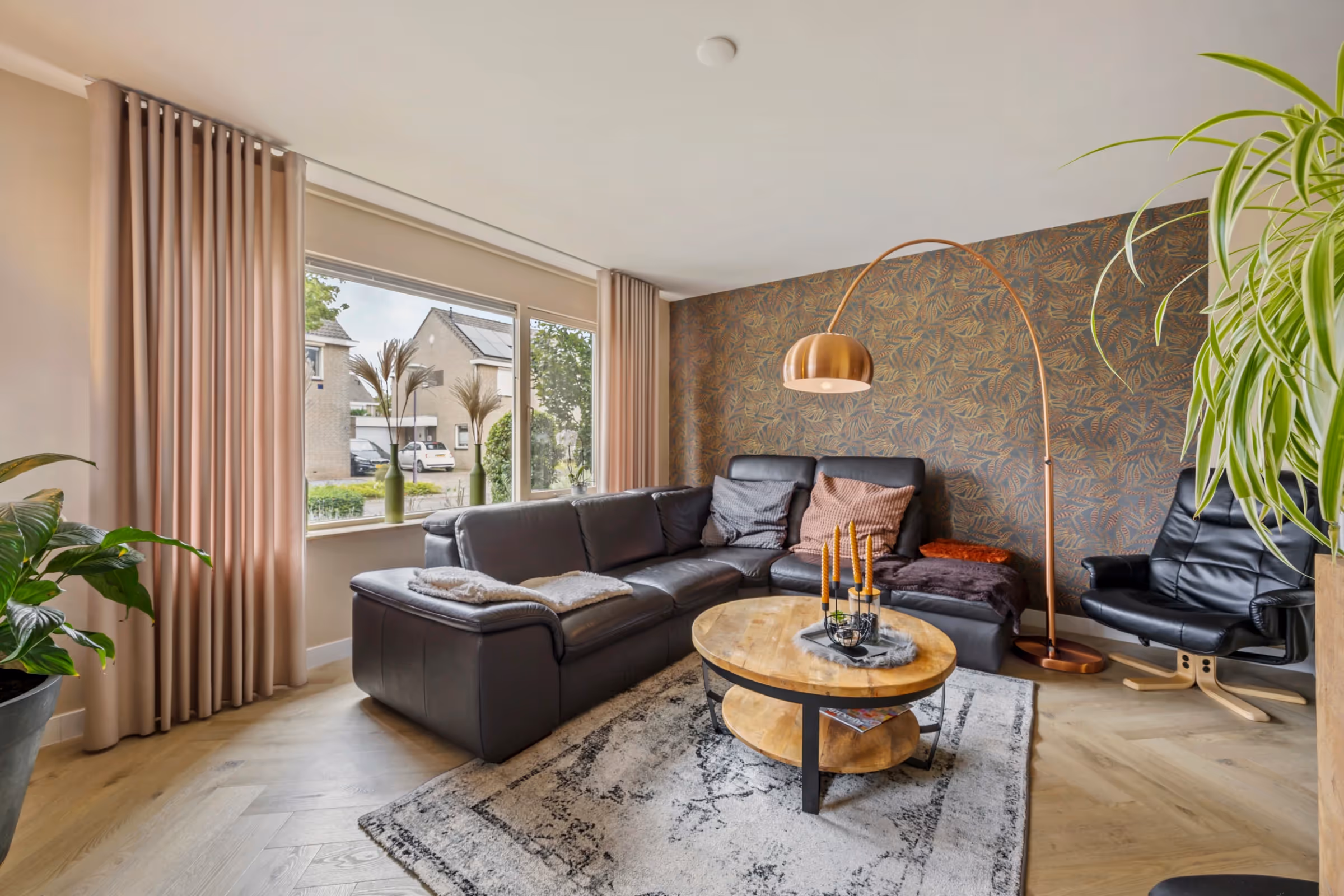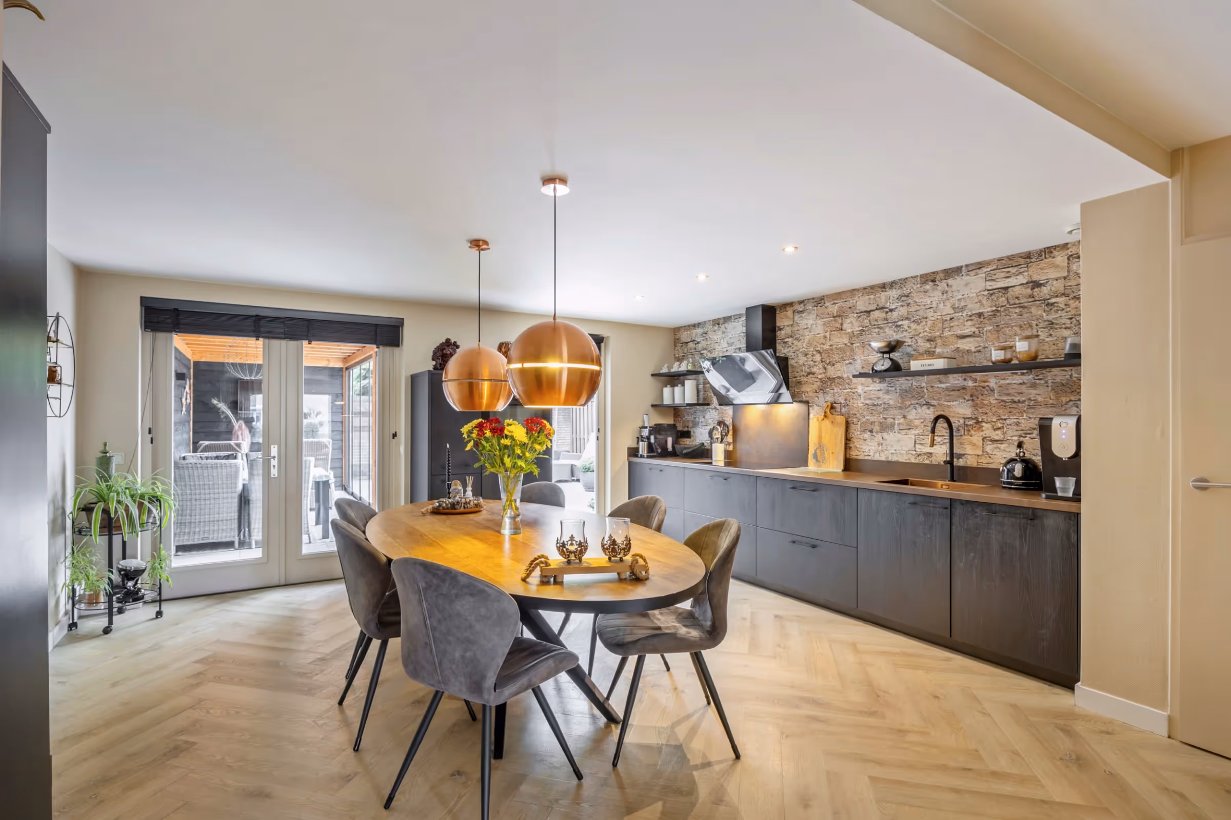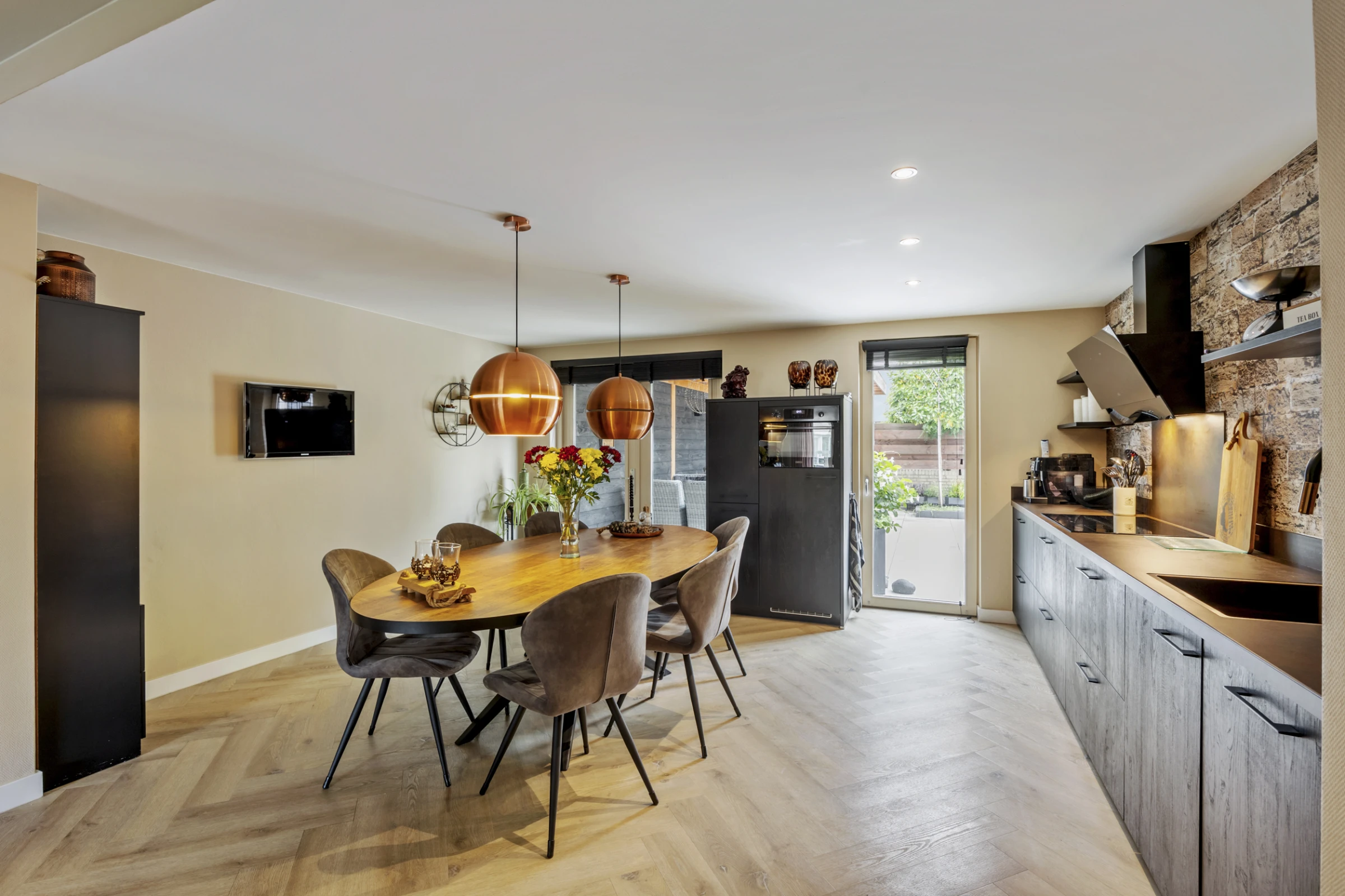 Via de entreehal, waar tevens het gastentoilet en de meterkast zijn gelegen, kom je in de woonkamer. Deze riante woonkamer heeft een uitstekend niveau van afwerking en is ruim van opzet, mede door de uitbouw aan de achterzijde. Hier ligt ook de fraaie leefkeuken, welke van alle gemakken is voorzien. De luxe keuken stamt uit 2021 en is uitgevoerd met de volgende inbouwapparatuur: een 5-pits inductiekookplaat, afzuigkap, koelkast, combi oven, boiler en vaatwasser. Zowel de keuken, als de woonkamer hebben een luxe pvc vloer met vloerverwarming. Vanuit de keuken is verder de inpandige garage te bereiken. Ook deze ruimte heeft een uitstekend niveau van afwerking, met een nette vloer en inbouwkasten (met aansluiting voor de wasmachine). Momenteel is de garage alleen als bergruimte in gebruik en ook vanuit de garage is de tuin te bereiken. Tenslotte is vanuit de leefkeuken nog de luxe terrasoverkapping / tuinkamer te bereiken. Deze stijlvolle, houten terrasoverkapping is voorzien van glazen schuifpuien, waardoor je een groot deel van het jaar kunt genieten van deze buitenruimte.