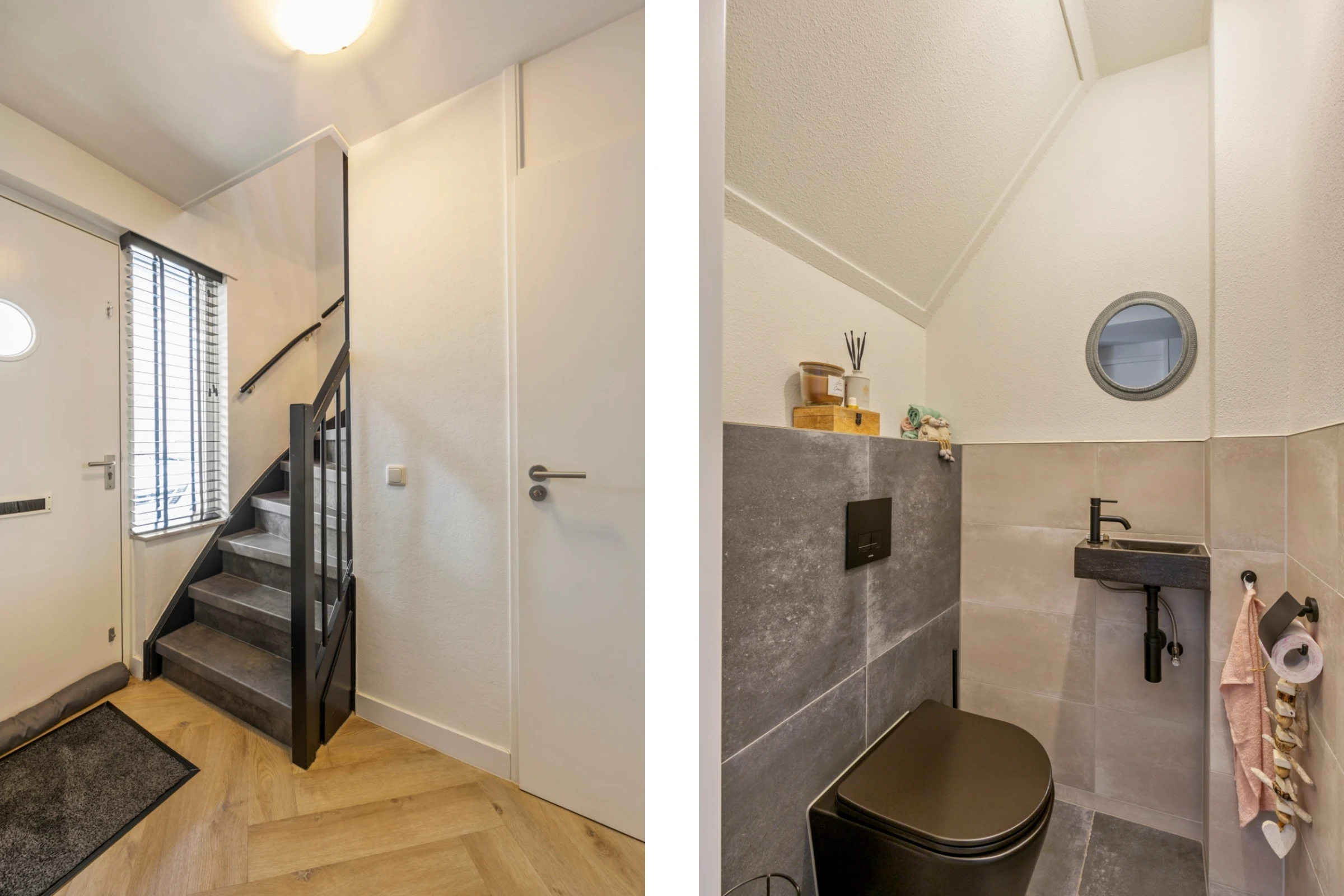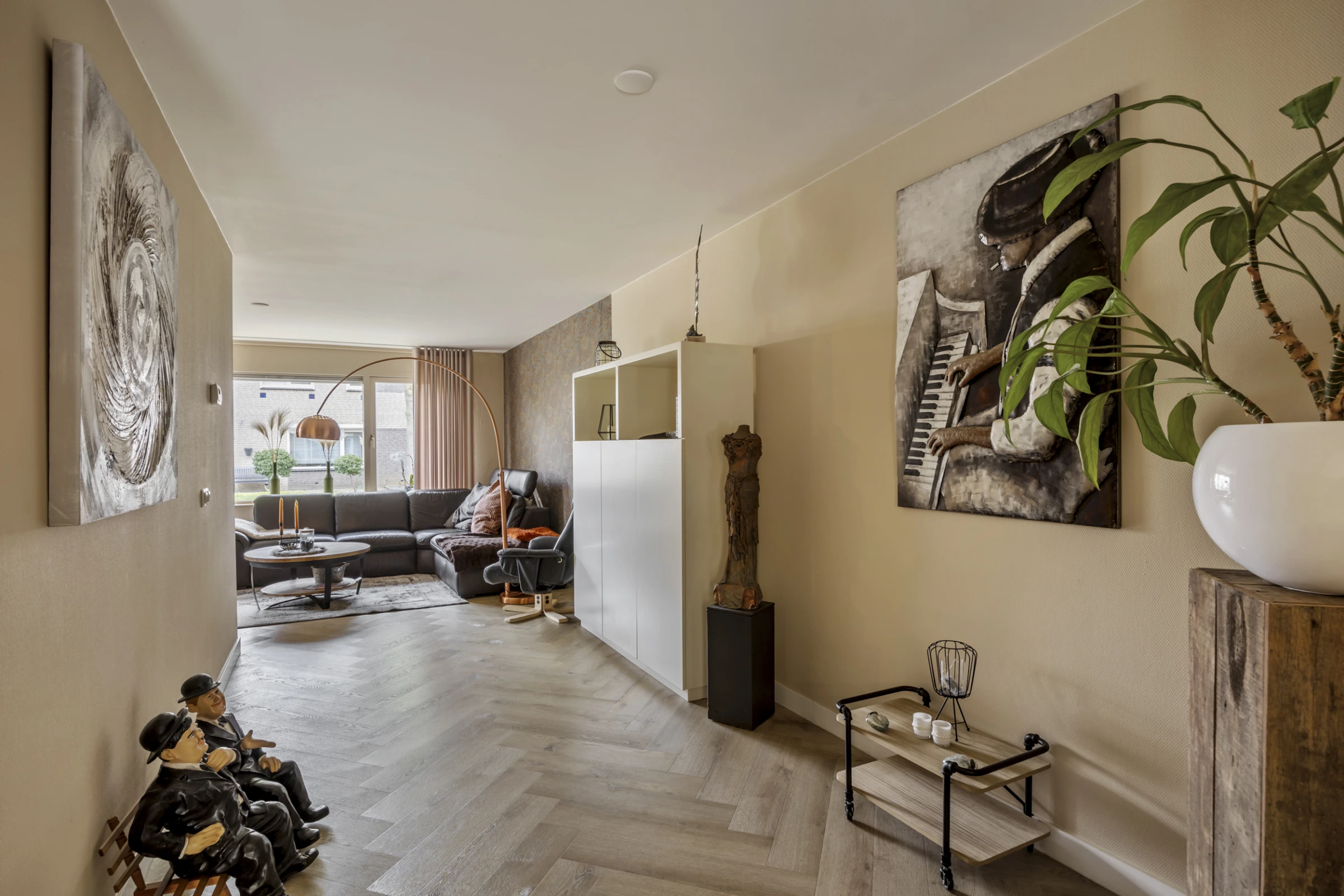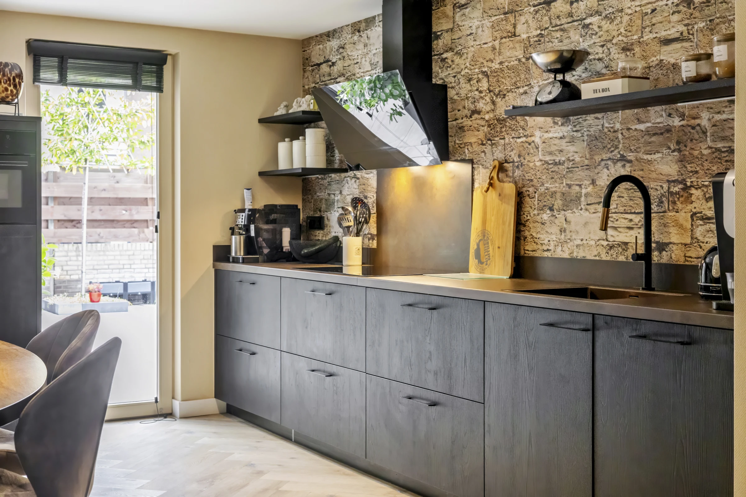 Via de entreehal, waar tevens het gastentoilet en de meterkast zijn gelegen, kom je in de woonkamer. Deze riante woonkamer heeft een uitstekend niveau van afwerking en is ruim van opzet, mede door de uitbouw aan de achterzijde. Hier ligt ook de fraaie leefkeuken, welke van alle gemakken is voorzien. De luxe keuken stamt uit 2021 en is uitgevoerd met de volgende inbouwapparatuur: een 5-pits inductiekookplaat, afzuigkap, koelkast, combi oven, boiler en vaatwasser. Zowel de keuken, als de woonkamer hebben een luxe pvc vloer met vloerverwarming. Vanuit de keuken is verder de inpandige garage te bereiken. Ook deze ruimte heeft een uitstekend niveau van afwerking, met een nette vloer en inbouwkasten (met aansluiting voor de wasmachine). Momenteel is de garage alleen als bergruimte in gebruik en ook vanuit de garage is de tuin te bereiken. Tenslotte is vanuit de leefkeuken nog de luxe terrasoverkapping / tuinkamer te bereiken. Deze stijlvolle, houten terrasoverkapping is voorzien van glazen schuifpuien, waardoor je een groot deel van het jaar kunt genieten van deze buitenruimte.