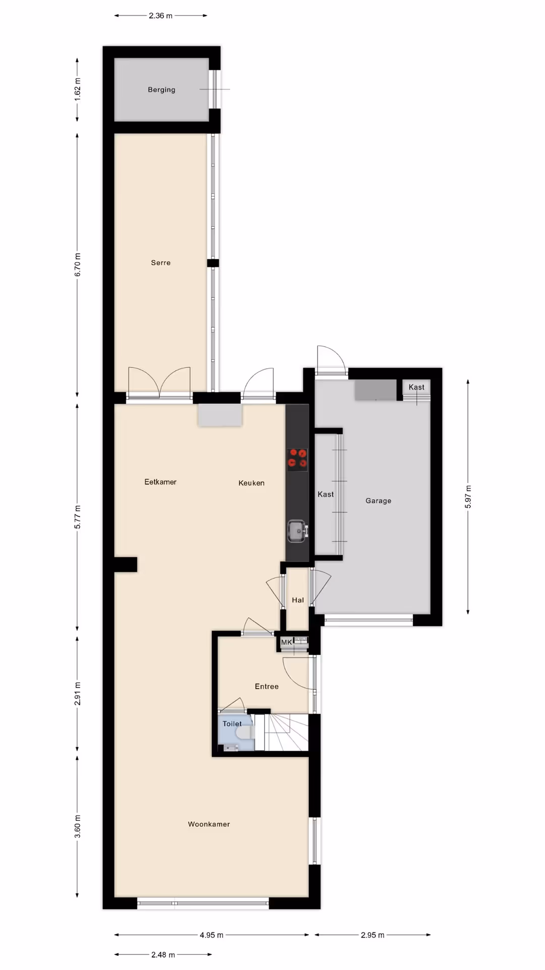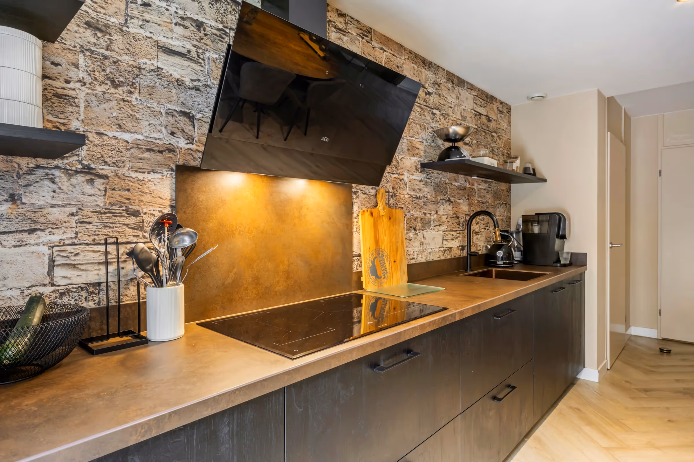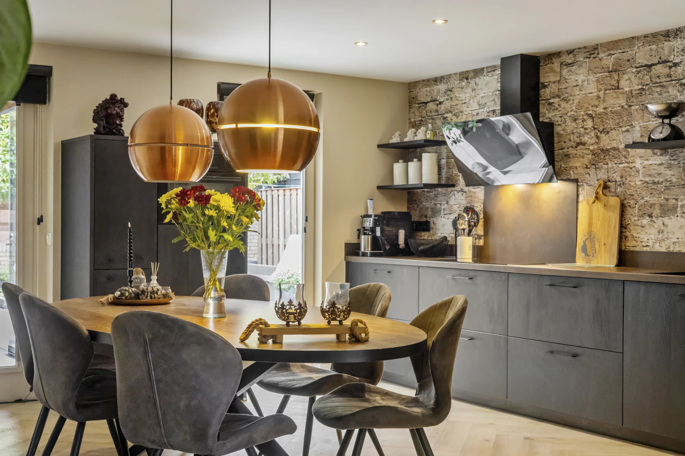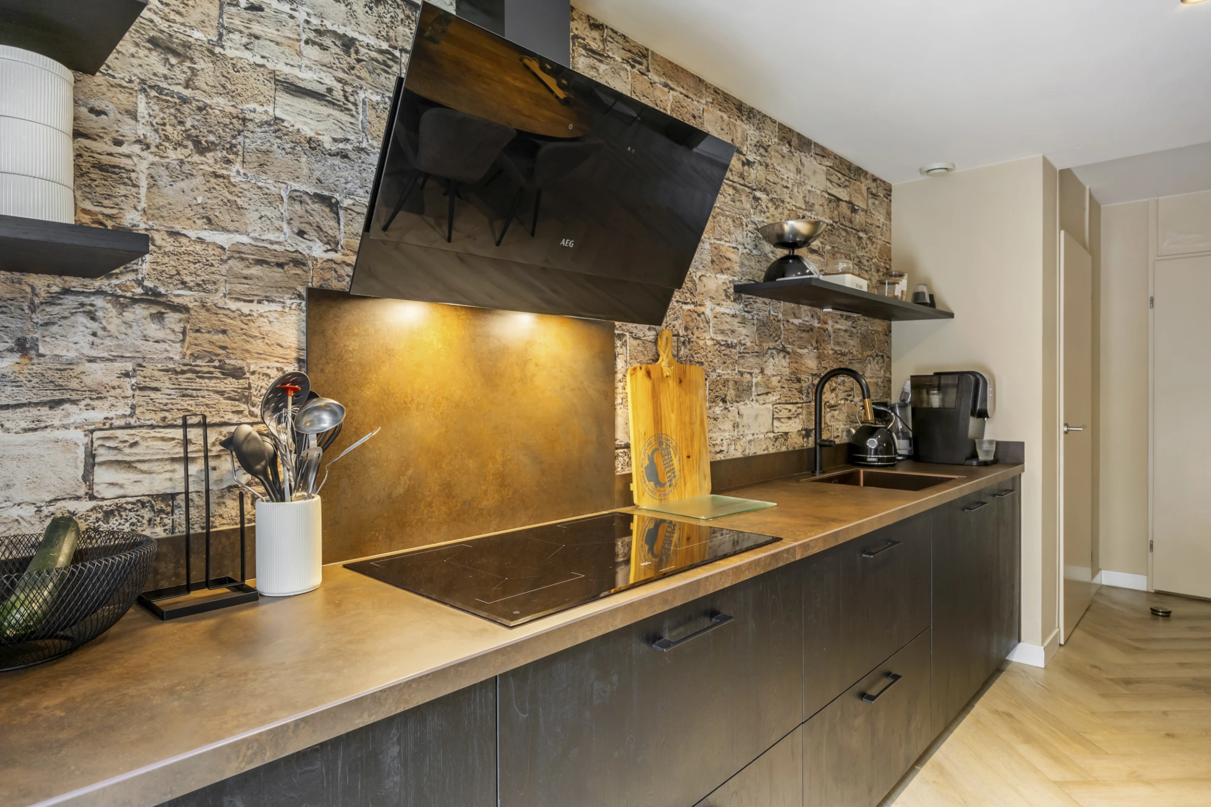 Via de entreehal, waar tevens het gastentoilet en de meterkast zijn gelegen, kom je in de woonkamer. Deze riante woonkamer heeft een uitstekend niveau van afwerking en is ruim van opzet, mede door de uitbouw aan de achterzijde. Hier ligt ook de fraaie leefkeuken, welke van alle gemakken is voorzien. De luxe keuken stamt uit 2021 en is uitgevoerd met de volgende inbouwapparatuur: een 5-pits inductiekookplaat, afzuigkap, koelkast, combi oven, boiler en vaatwasser. Zowel de keuken, als de woonkamer hebben een luxe pvc vloer met vloerverwarming. Vanuit de keuken is verder de inpandige garage te bereiken. Ook deze ruimte heeft een uitstekend niveau van afwerking, met een nette vloer en inbouwkasten (met aansluiting voor de wasmachine). Momenteel is de garage alleen als bergruimte in gebruik en ook vanuit de garage is de tuin te bereiken. Tenslotte is vanuit de leefkeuken nog de luxe terrasoverkapping / tuinkamer te bereiken. Deze stijlvolle, houten terrasoverkapping is voorzien van glazen schuifpuien, waardoor je een groot deel van het jaar kunt genieten van deze buitenruimte.