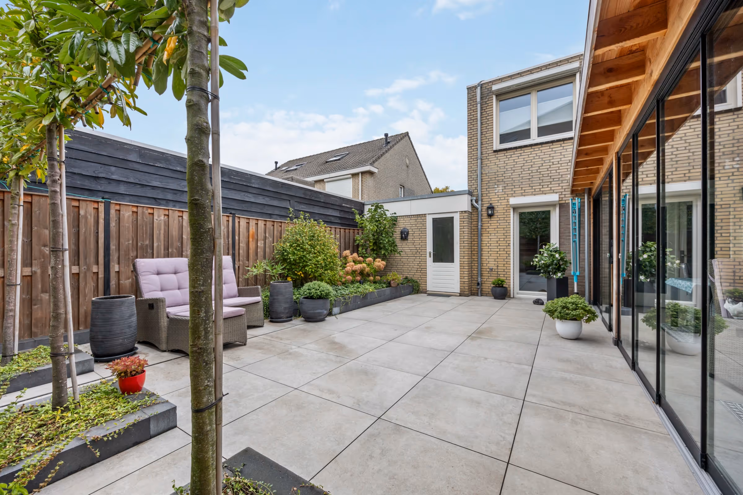 De tuin van dit fijne woonhuis is keurig netjes aangelegd en geheel omsloten. De luxe tuinkamer / terrasoverkapping is de eye-catcher en de tuin is helemaal onderhoudsvriendelijk aangelegd, met een terras, enkele bordessen met planten en een houten tuinhuisje. De tuin is gelegen op het Westen, hetgeen gunstig is voor wat betreft de zon. Tenslotte beschikt het perceel over een grote oprit, geschikt voor meerdere auto’s.