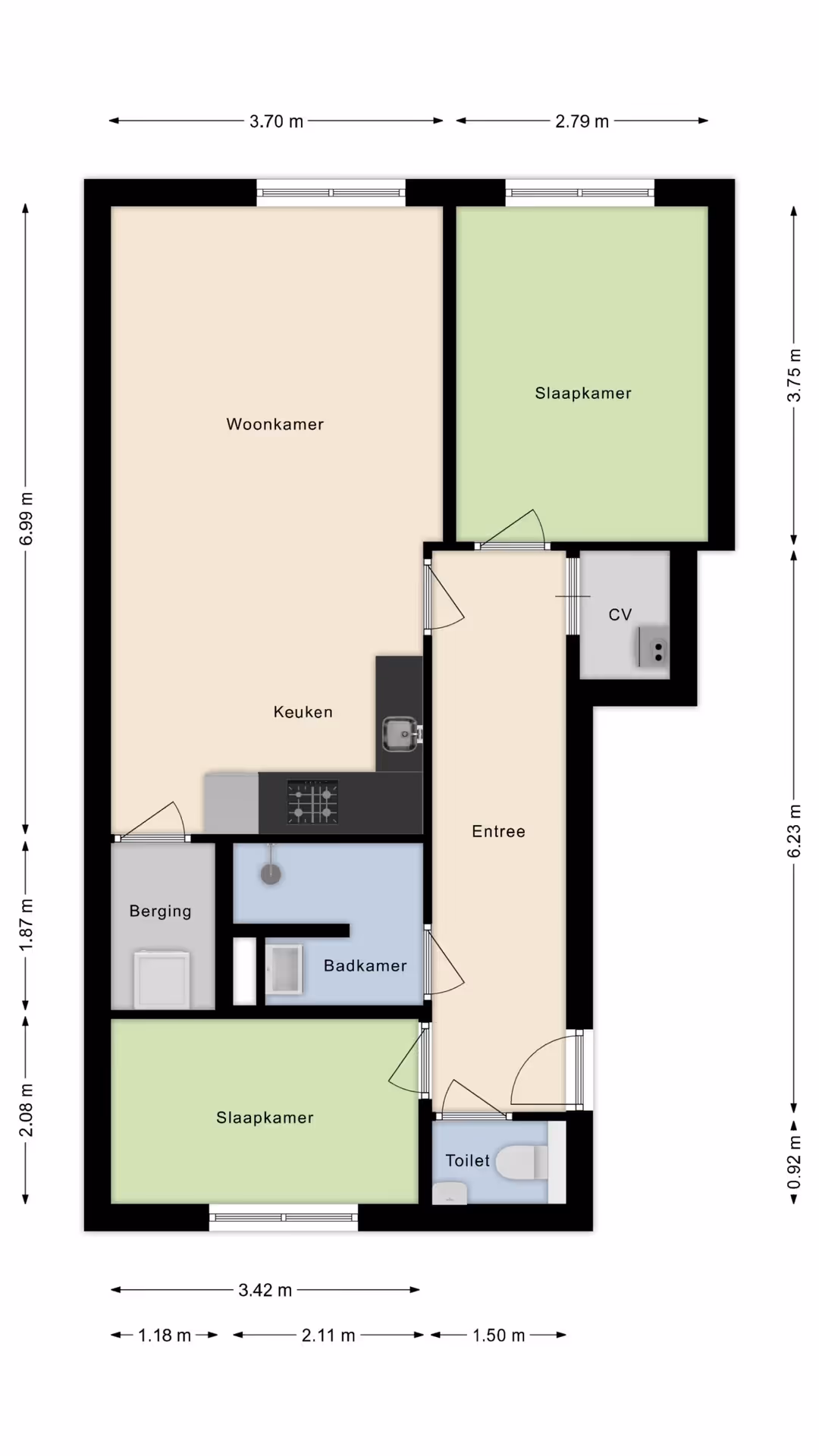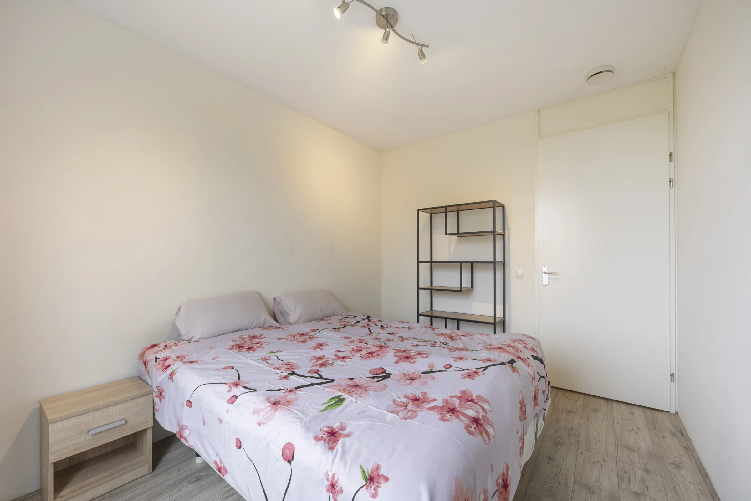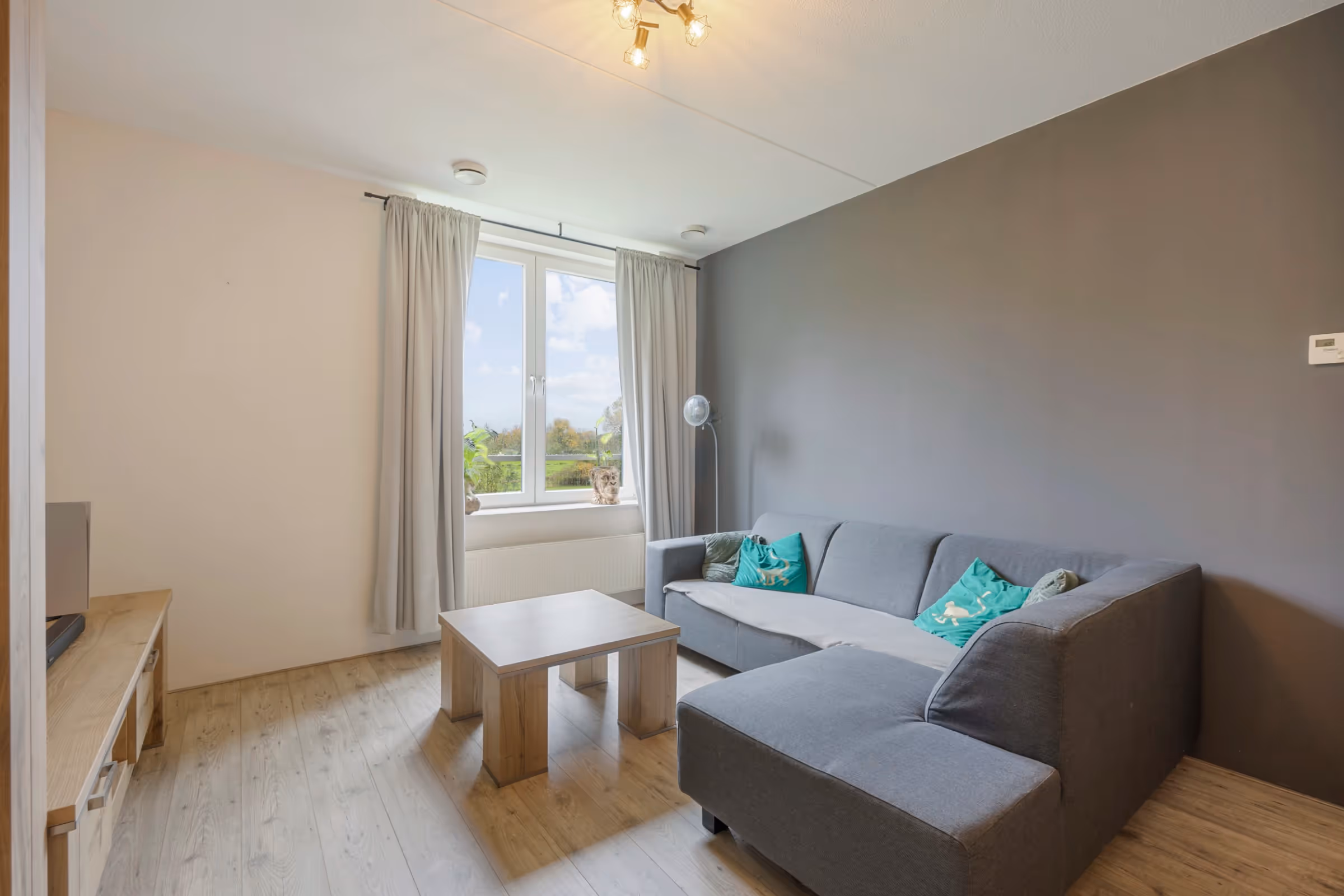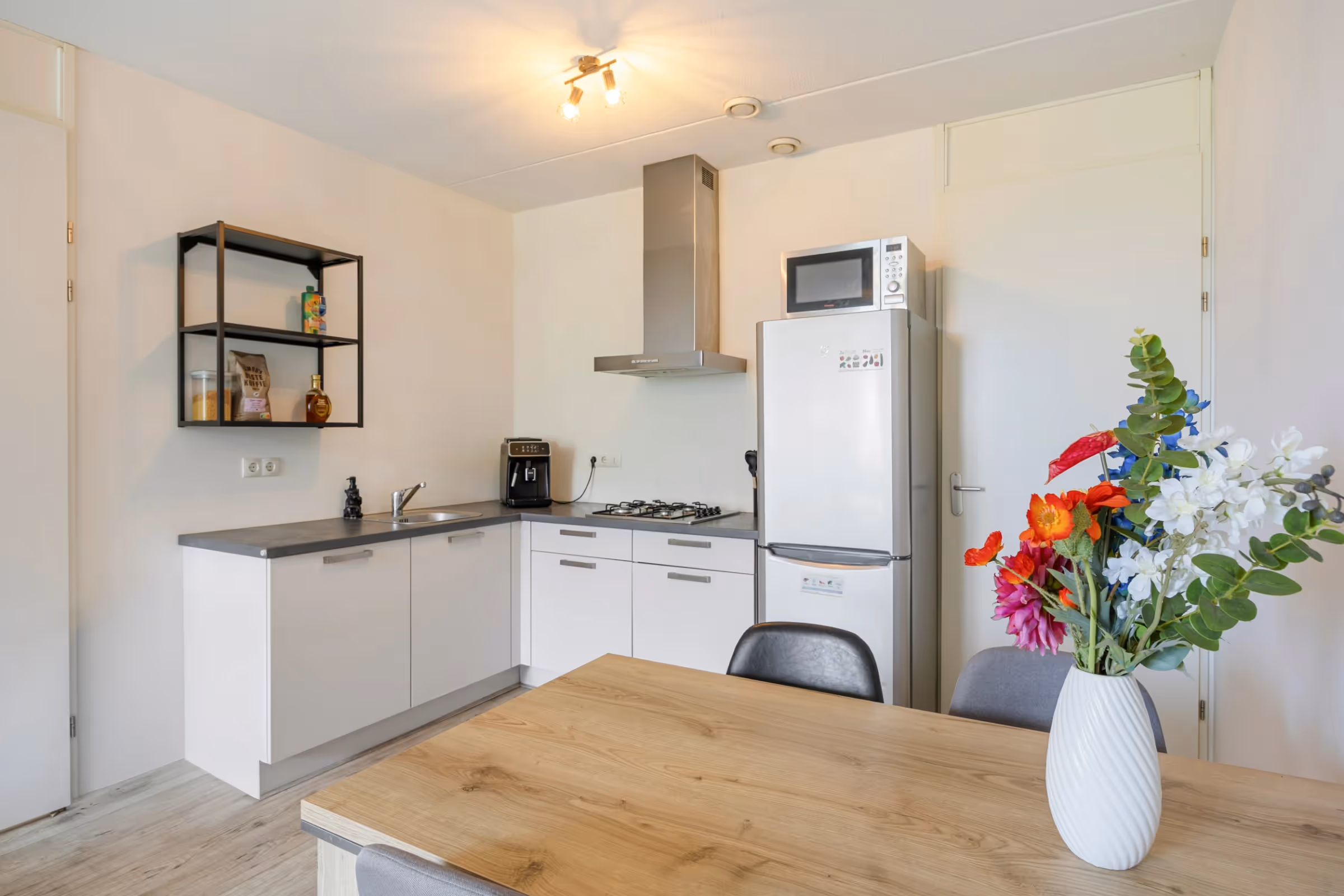 De lichte woonkamer is verdeeld in een zit- en eethoek en heeft lekker veel lichtinval. De open keuken heeft een keukenblok in hoekopstelling en de volgende inbouwapparatuur: een 4-pits gasfornuis en een afzuigkap. Door het gehele appartement ligt een nette vloer. Naast de keuken ligt een berging. Deze berging is ruim en herbergt de aansluitpunten voor het witgoed.