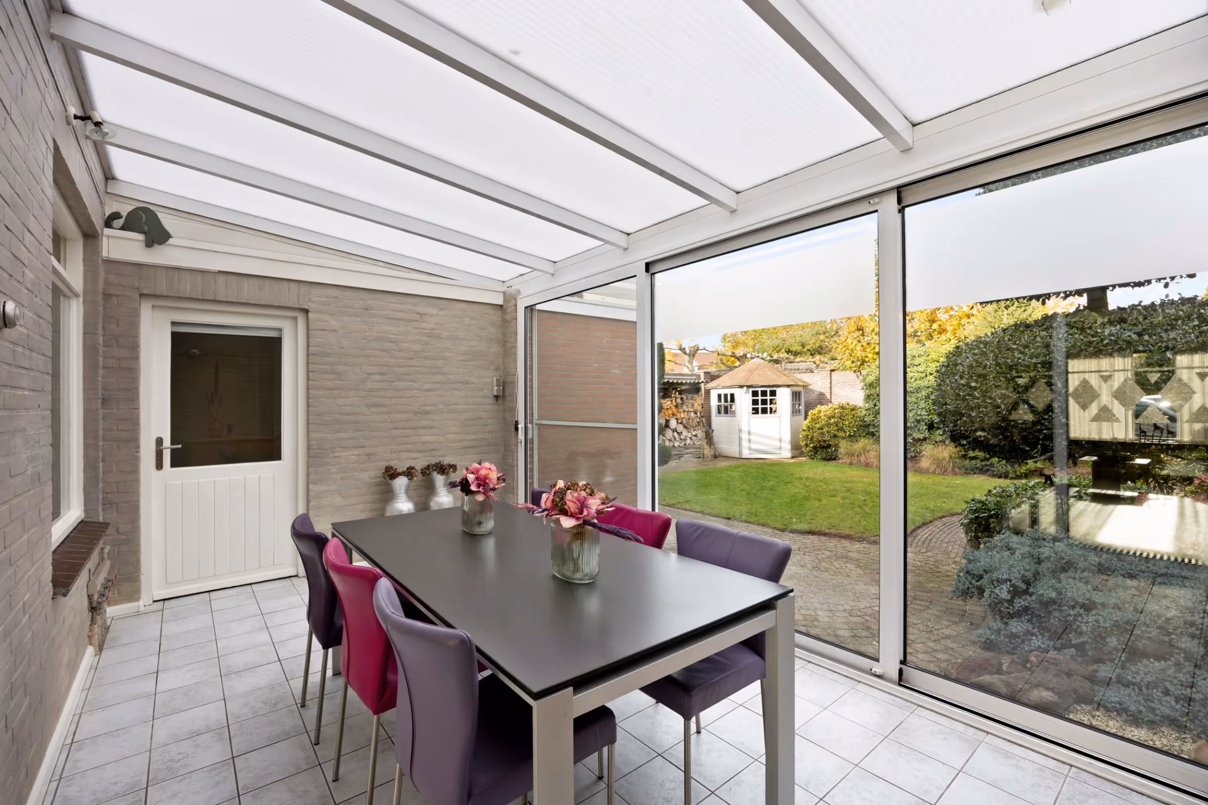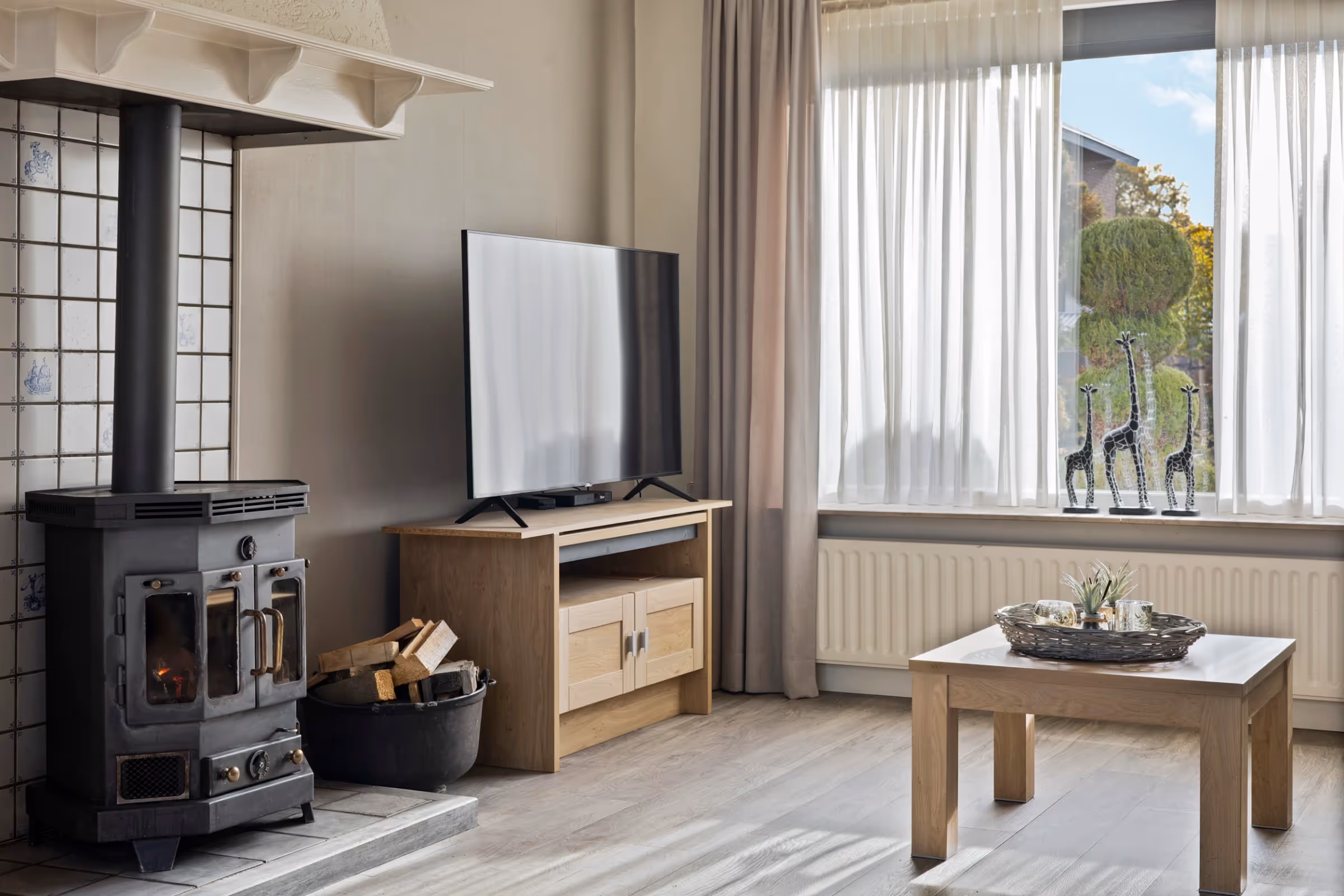 De woonkamer is voorzien van een nette pvc-vloer en een sfeervolle houtkachel die zorgt voor extra warmte en gezelligheid. De houten kozijnen met dubbel glas dragen bij aan het goede wooncomfort. Via de woonkamer stap je de serre binnen; deze heeft vloerverwarming en een schuifpui met dubbel glas, waardoor je het hele jaar door kunt genieten van veel extra leefruimte in deze fijne kamer.