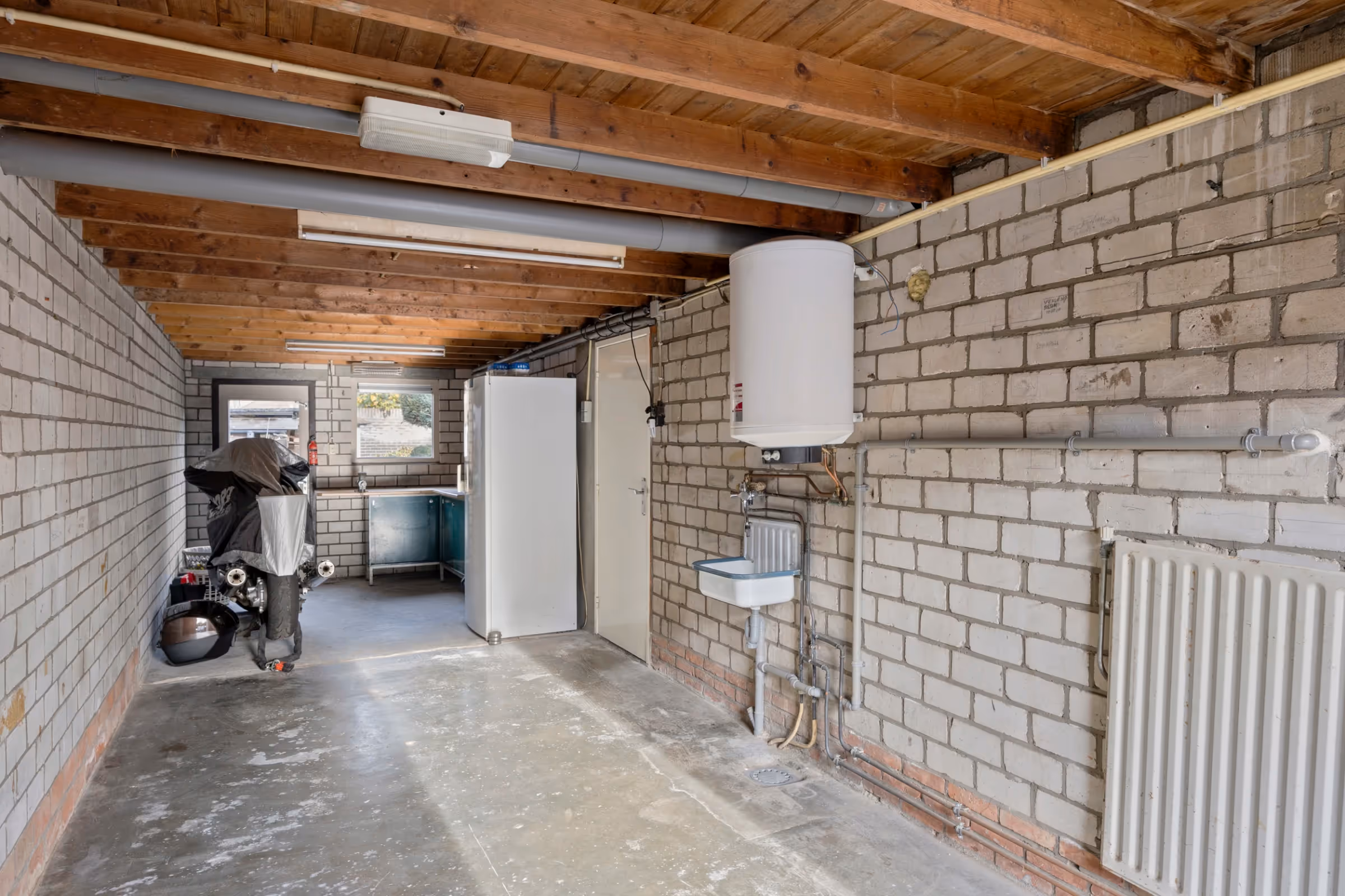 Je komt binnen in de ruime hal met het gastentoilet. Vanuit hier bereik je de lichte woonkamer met halfopen keuken. Deze moderne keuken is uitgerust met een combi-oven, koelkast, vaatwasser, inductiekookplaat en een gezellig barretje om aan te zitten of te tafelen. Vanuit de keuken bereik je ook de ruime provisiekelder. Naast de keuken kom je in een 2e hal, welke toegang geef naar een praktische bijkeuken / wasruimte en de inpandige garage.