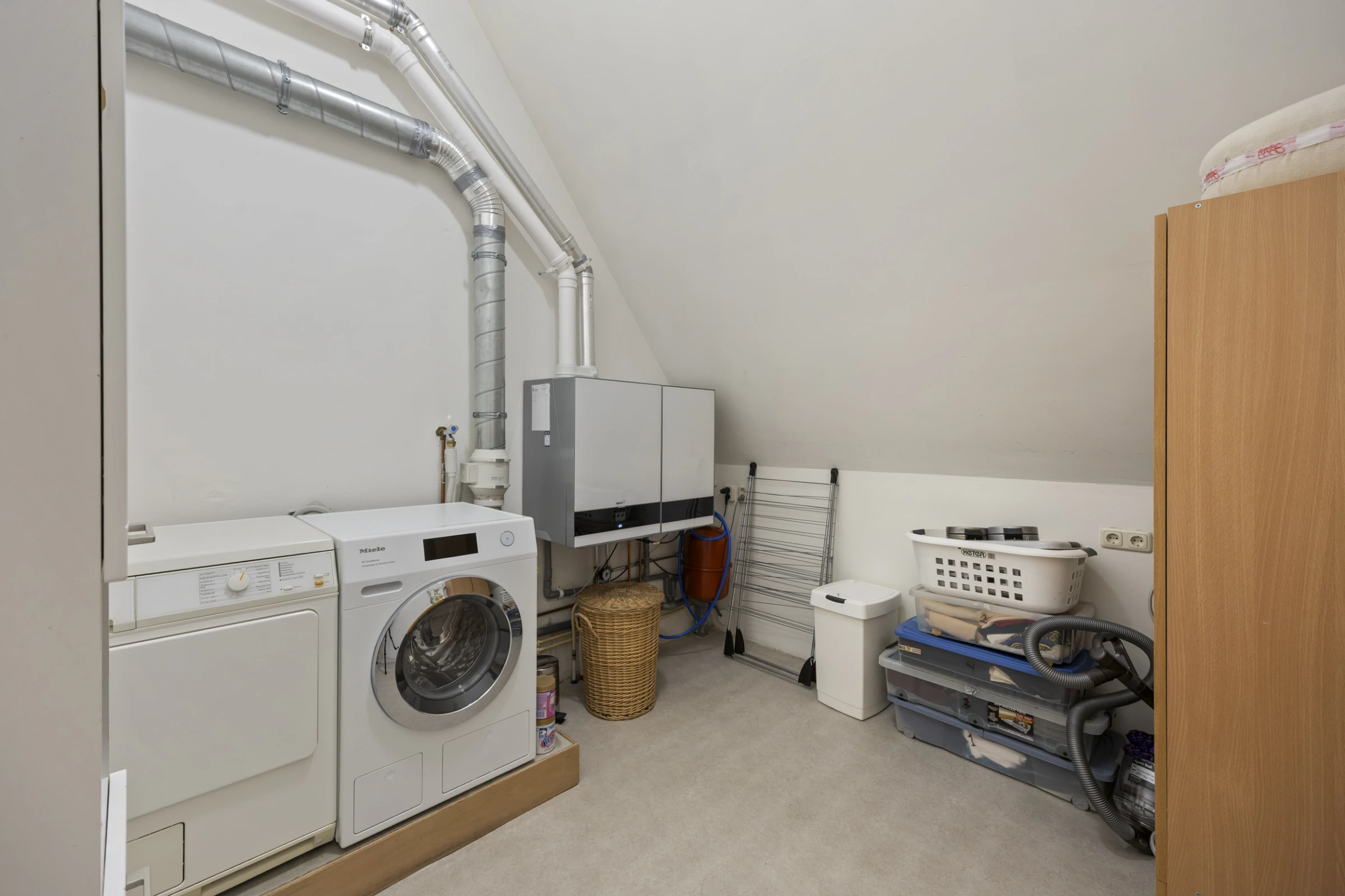 De houten trappartij loopt door tot de 2e verdieping. Hier is een riante zolderkamer gelegen en een aparte was- en CV-ruimte. De wasruimte herbergt de aansluitpunten voor het witgoed, de mechanische ventilatie en de CV-combiketel (Nefit, 2021, eigendom). De zolderkamer is een prachtige, multifunctionele ruimte. De houten balken in het zicht, de dakramen en de hoogte, maken het een erg prettige kamer om te verblijven. Deze kamer kan prima als 3e slaapkamer fungeren, of dienst doen als hobbyruimte of thuiswerkplek.