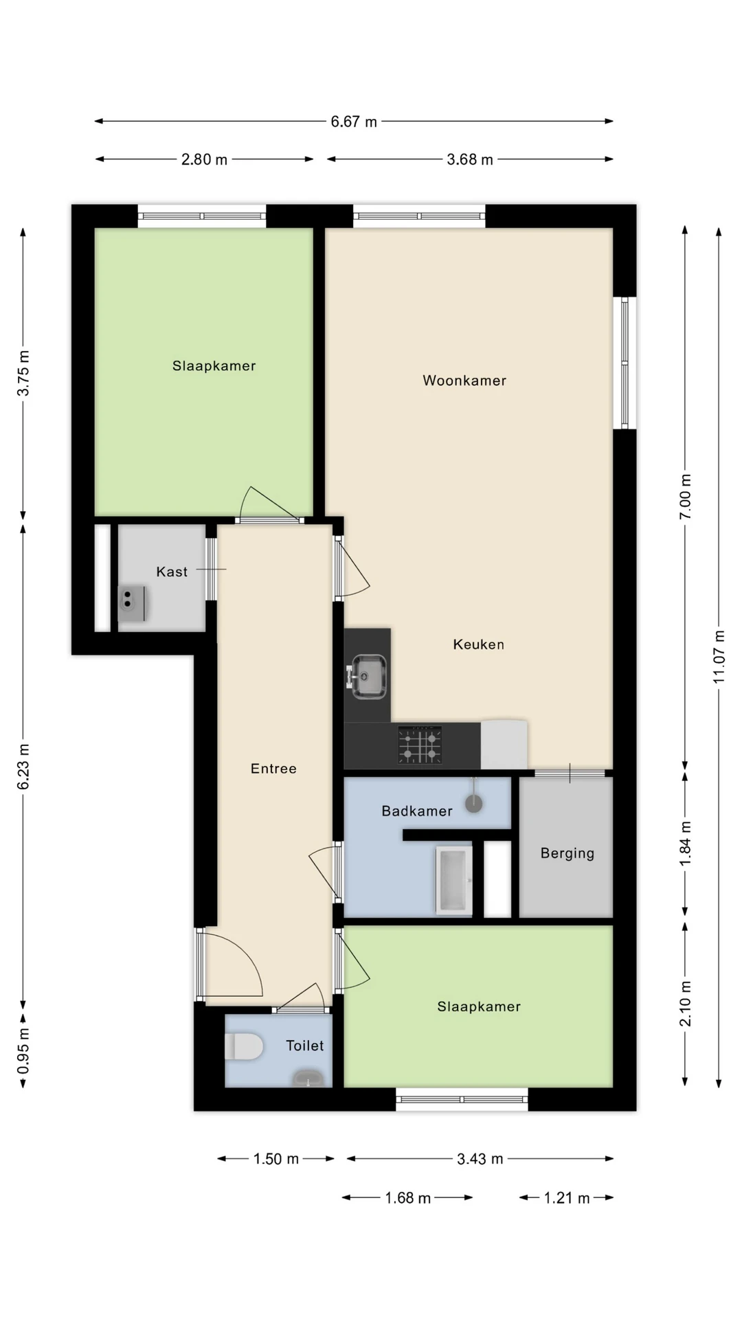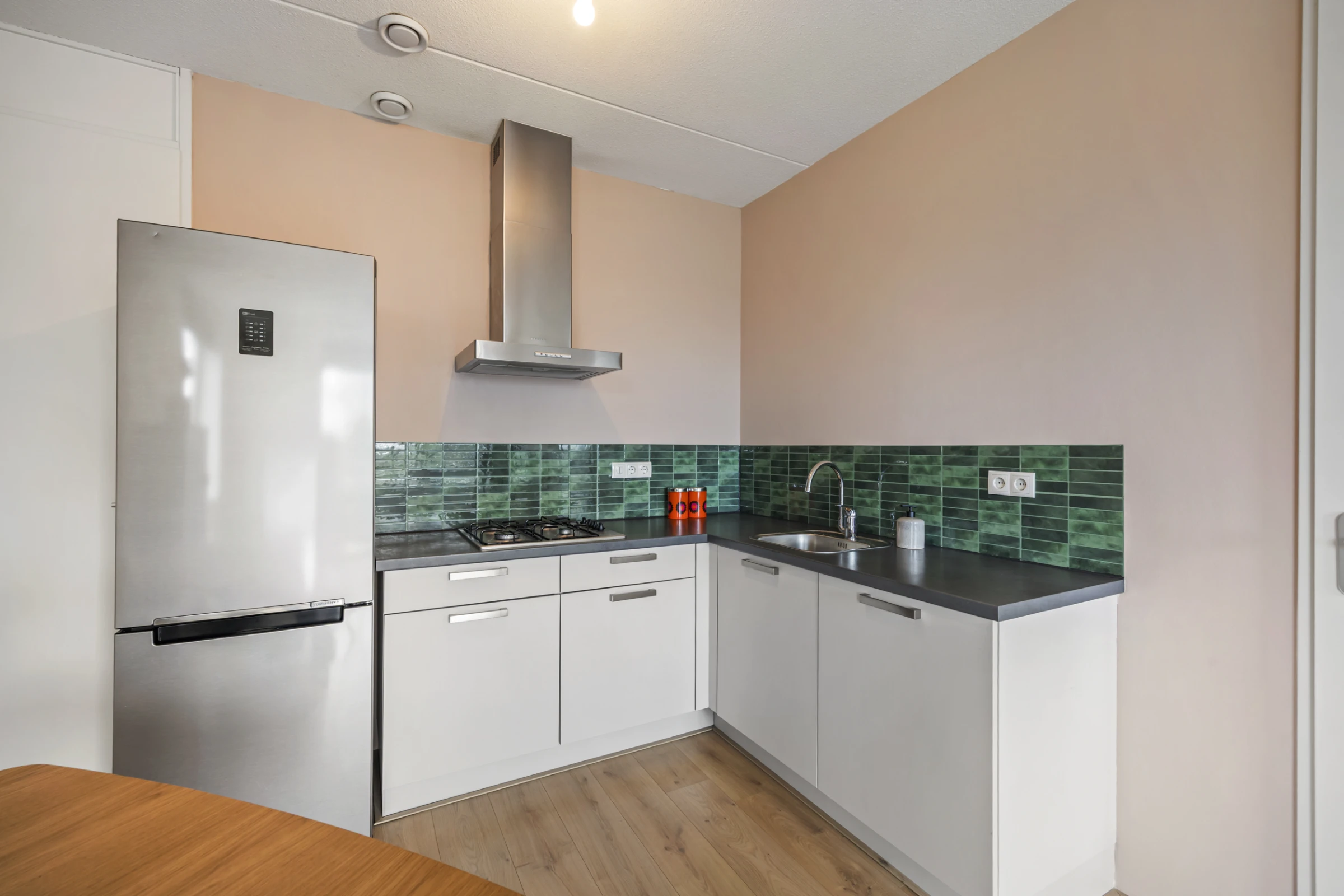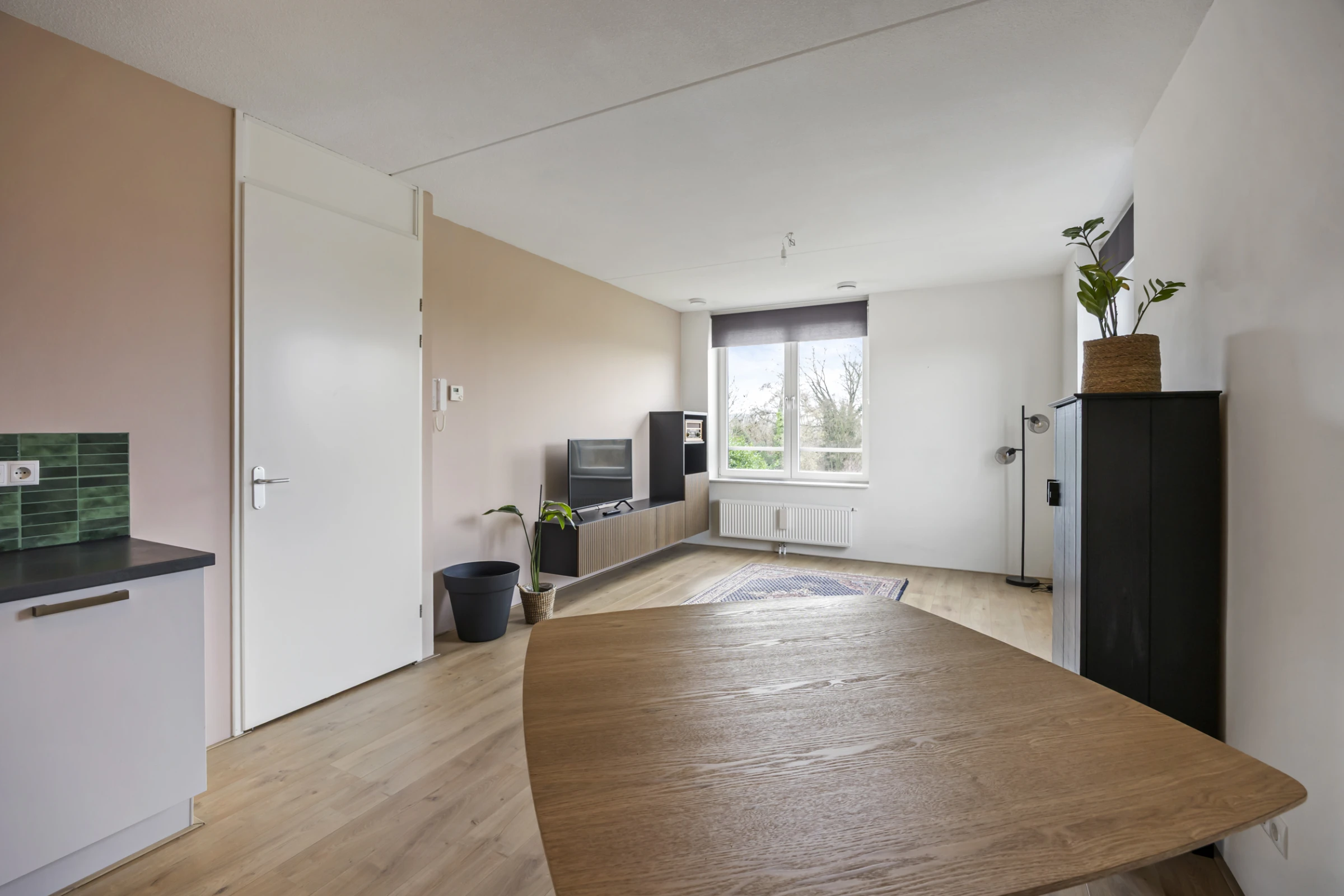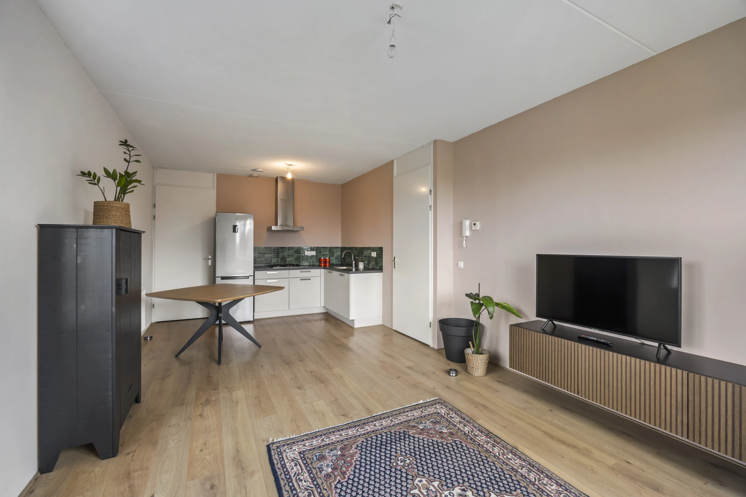De lichte woonkamer is verdeeld in een zit- en eethoek en heeft lekker veel lichtinval. De open keuken heeft een keukenblok in hoekopstelling en de volgende inbouwapparatuur: een 4-pits gasfornuis en een afzuigkap. Door het gehele appartement ligt een nette vloer. Naast de keuken ligt een berging. Deze berging is ruim en herbergt de aansluitpunten voor het witgoed.
