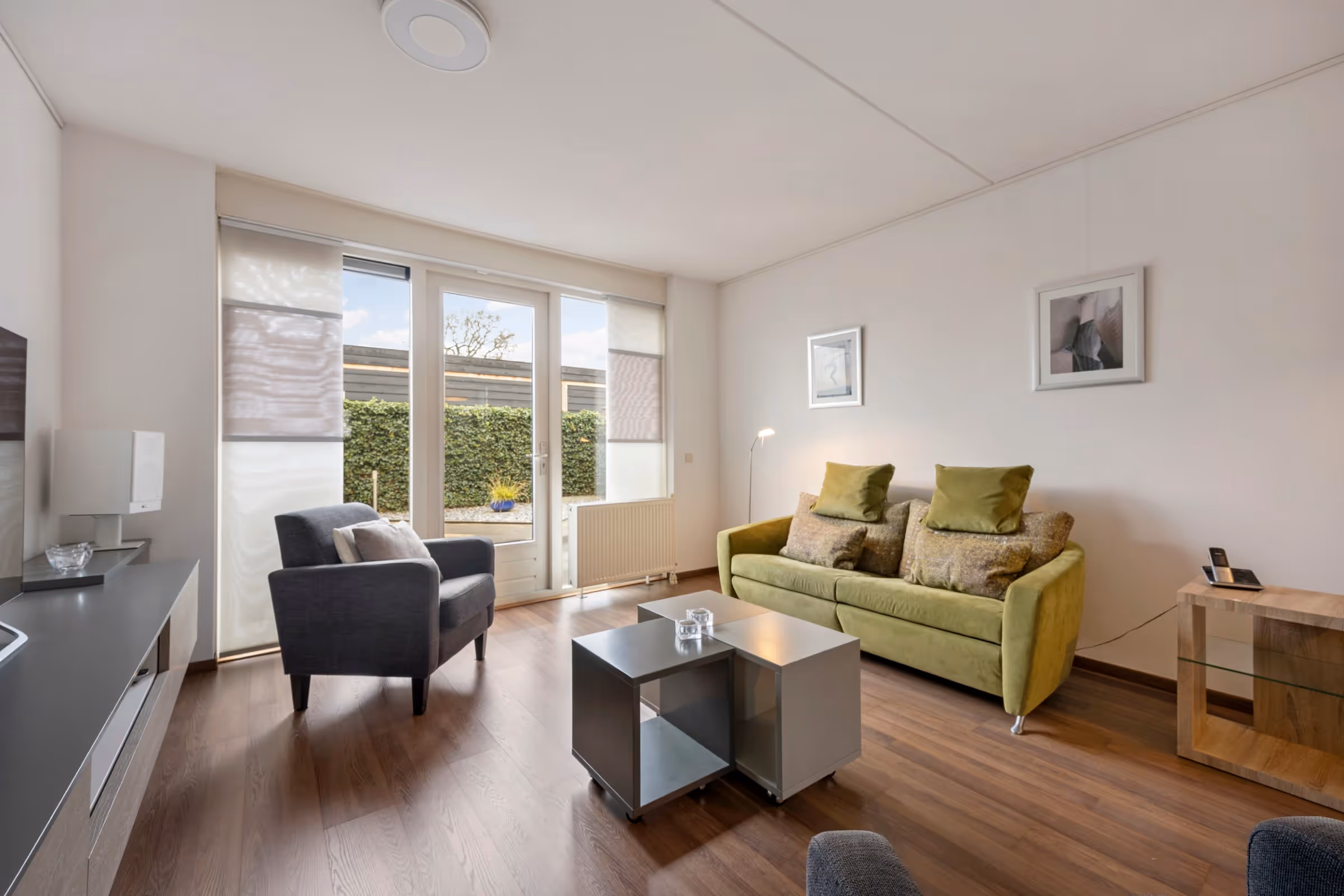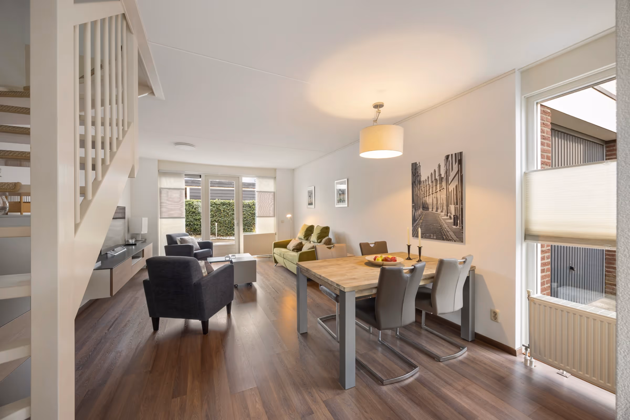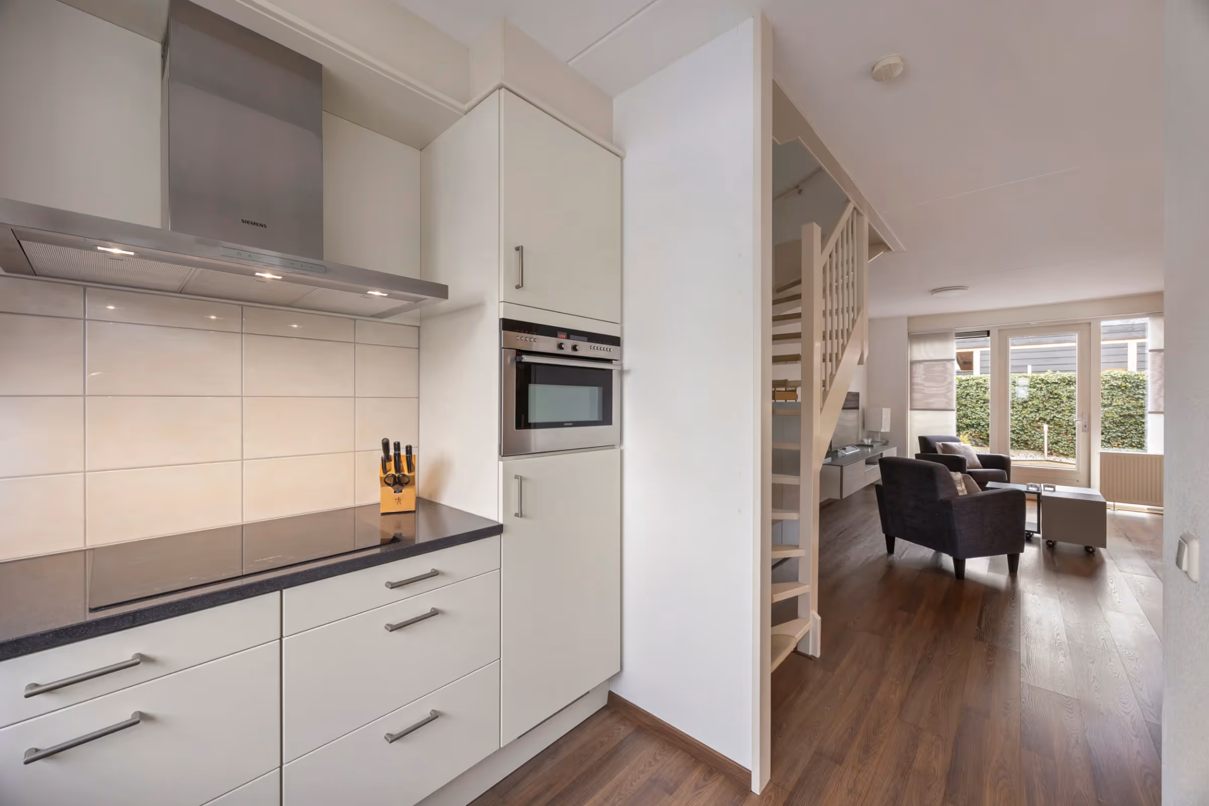 Via de entreehal, waar tevens het gastentoilet met fonteintje en de meterkast zijn gelegen, kom je in de woonkamer. Deze woonkamer ligt aan de achterzijde van de woning en heeft zicht op de tuin. De woonkamer beschikt over een mooie laminaatvloer en aan de voorkant van het huis ligt de keuken. Deze nette keuken, in hoekopstelling en in een witte kleurstelling, beschikt over de volgende inbouwapparatuur: 4-pits kookplaat met afzuigkap, oven, koelkast, zelfreinigende oven en vaatwasser.