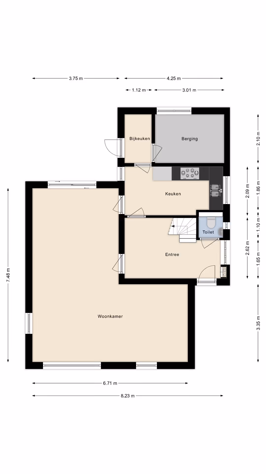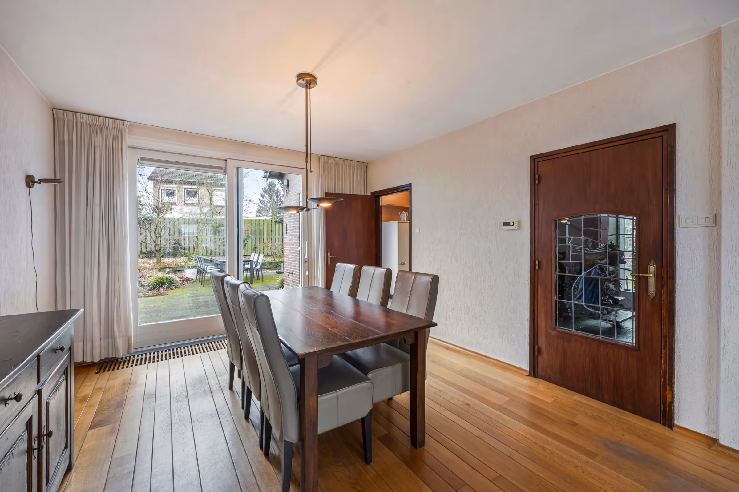 Entree in de hal met toilet met fonteintje, meterkast en toegang tot zowel de woonkamer, als de keuken. In de woonkamer heb je een mooie lichtinval door de grote raampartijen en veel leefruimte. De woonkamer heeft verder een schuifpui (ook met HR++ beglazing) en een echte parketvloer. Vanuit de woonkamer is ook de keuken toegankelijk. Hier bevindt zich een keukenblok in hoekopstelling en met de volgende inbouwapparatuur: een 5-pits gasfornuis, afzuigkap, oven, koelkast en vaatwasser. Voorst heeft de woning nog een bijkeuken en berging, die je bereikt vanuit de keuken en met nog veel extra opbergruimte en de aansluitpunten voor het witgoed.