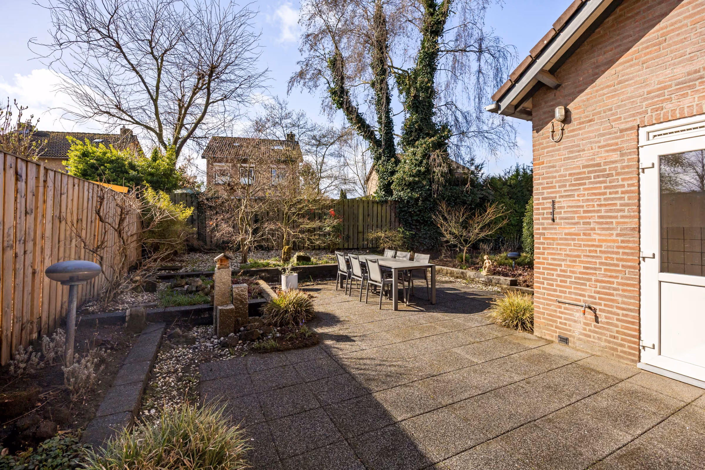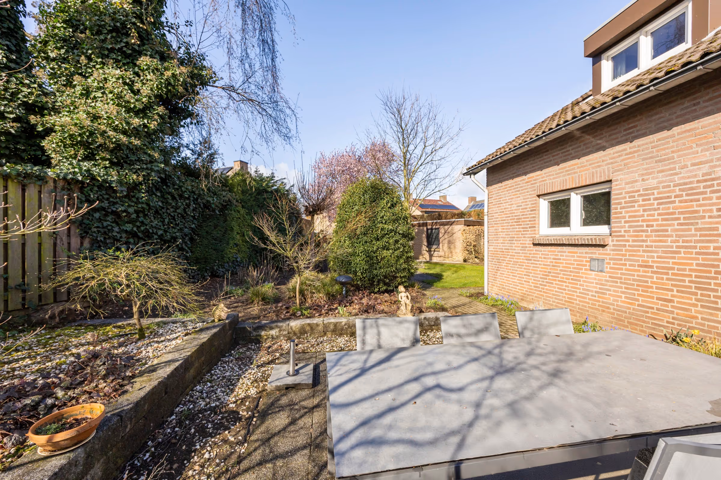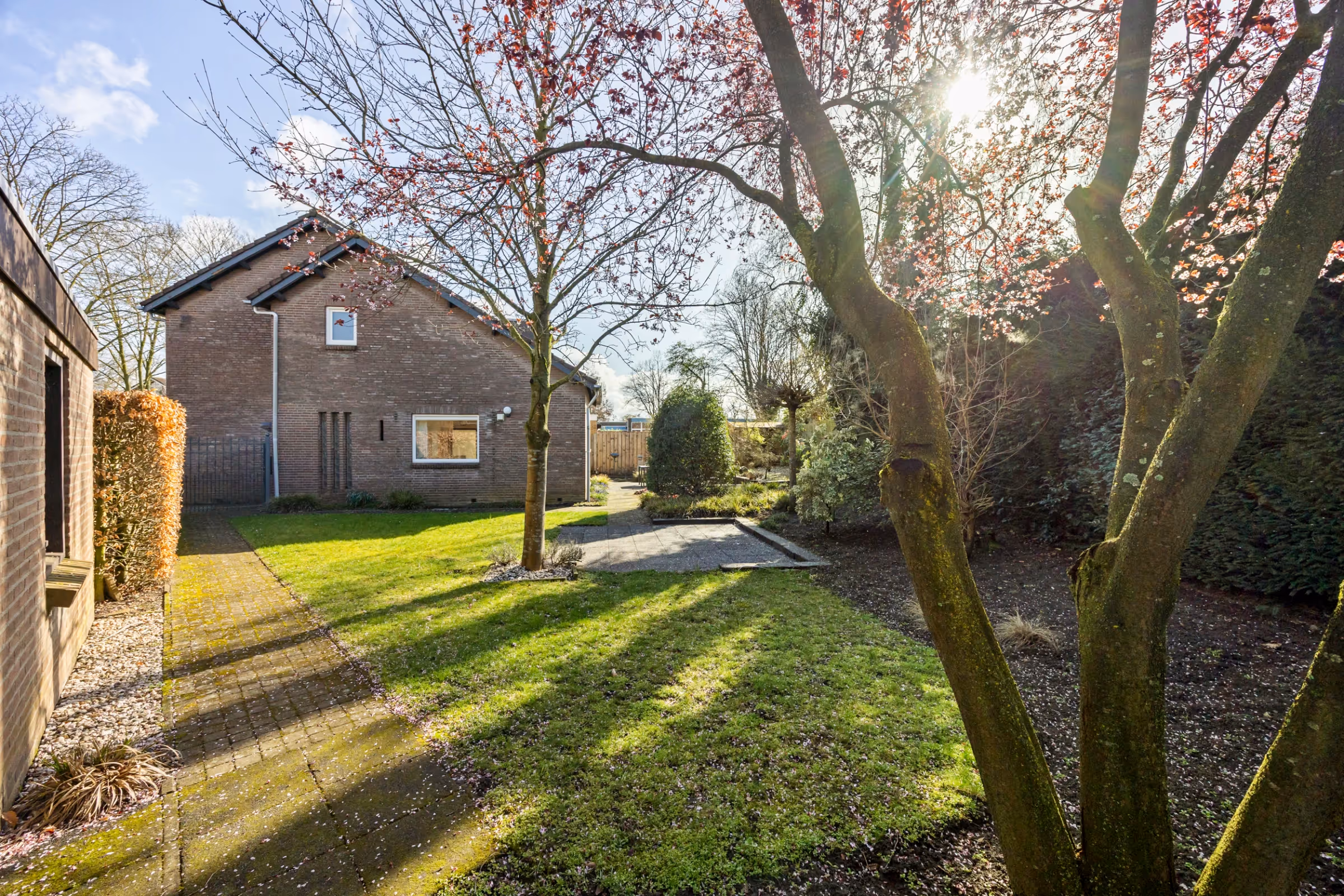 Dit nette woonhuis heeft ook nog eens een riante tuin, met een gunstige ligging en veel privacy. De tuin heeft een groot terras, een gazon en enkele bordessen met beplanting. Ook ligt in de tuin een vrijstaande garage en heeft de tuin een achterom. De oprit is groot genoeg om meerdere auto’s