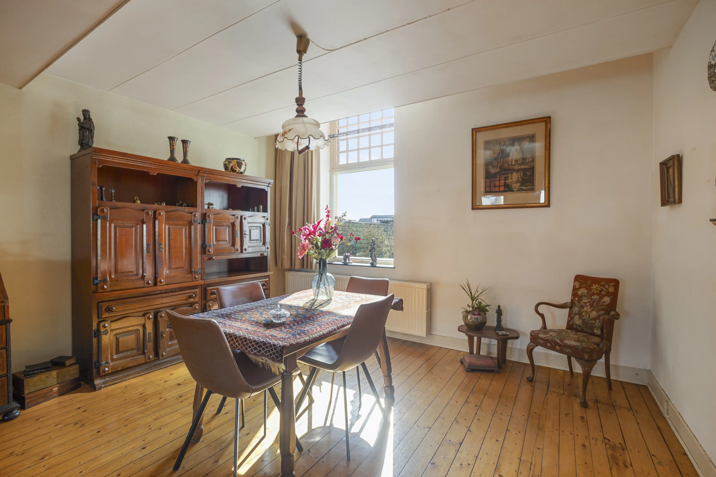 Via dezelfde fraaie trap is ook de zolderverdieping bereikbaar. Deze is royaal en heeft veel potentie, mede door de hoogte en mooie, houten balken. De ruimte is nu ingedeeld in een hobbyruimte en verder geheel open en naar wens te renoveren en in te delen. Maak jij hier een hoofdslaapkamer met vrijstaand ligbad of ga je voor extra slaapkamers voor de kinderen?