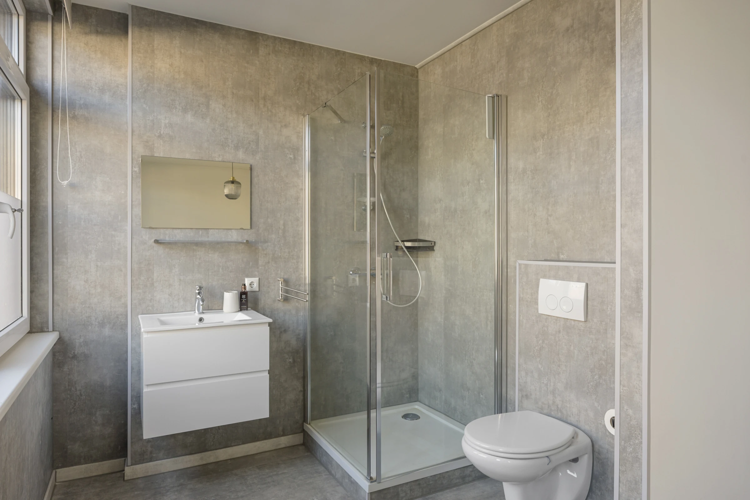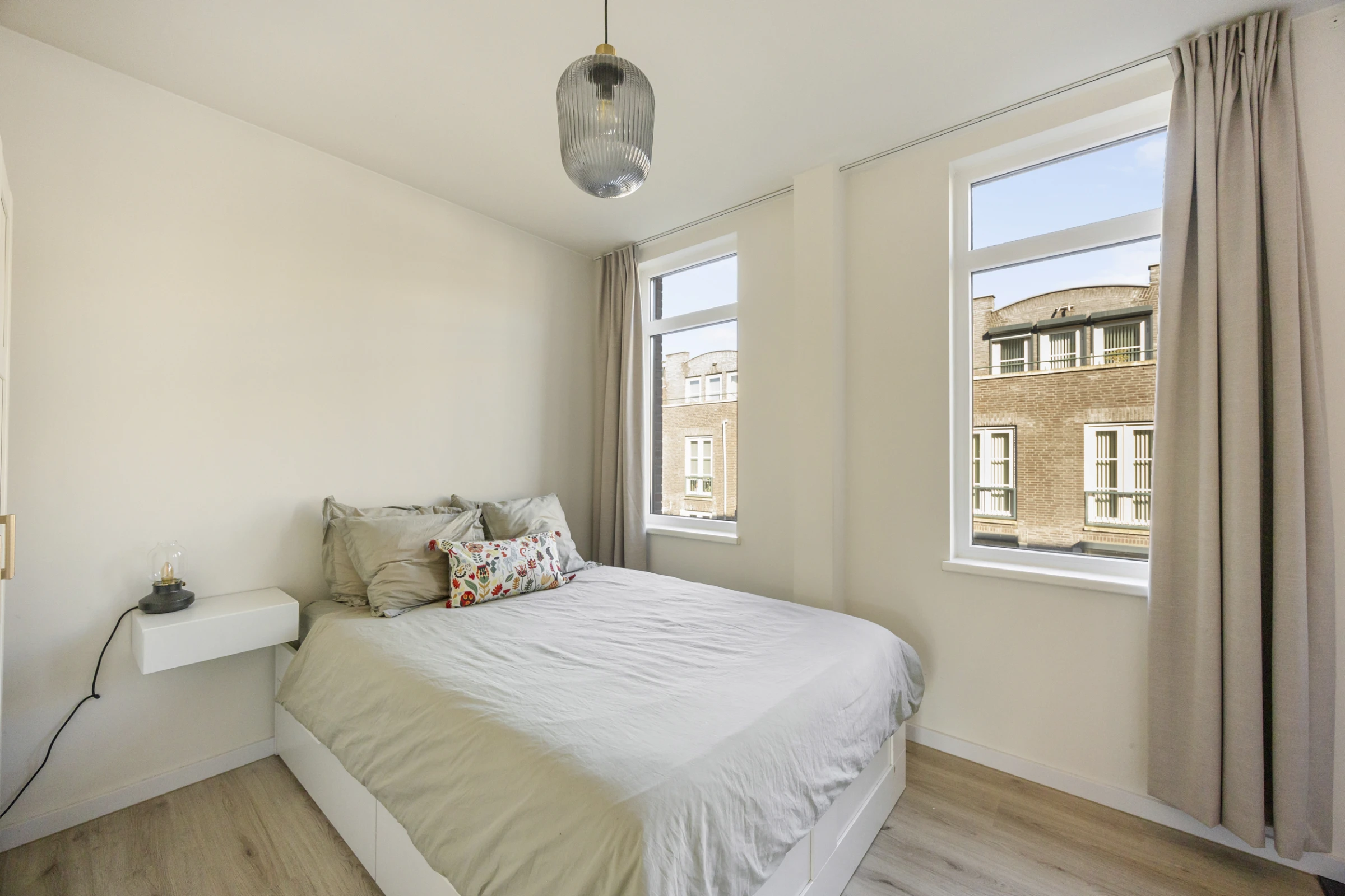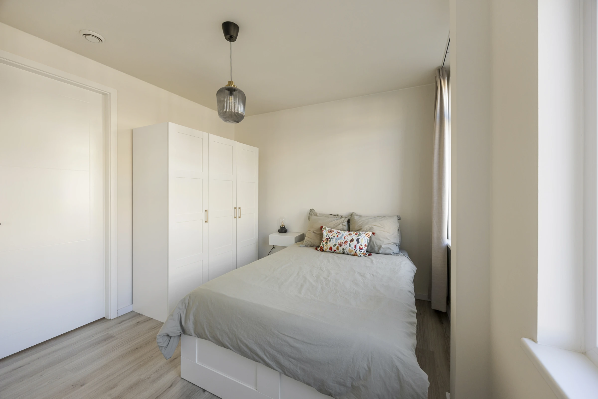 De slaapkamer is eveneens lekker licht en staat in open verbinding met de badkamer. De slaapkamer biedt voldoende ruimte voor een groot tweepersoonsbed en een kledingkast. De stijlvolle en suite badkamer is direct vanuit de slaapkamer bereikbaar en beschikt over een zwevend toilet, een wastafelmeubel en een douchecabine.