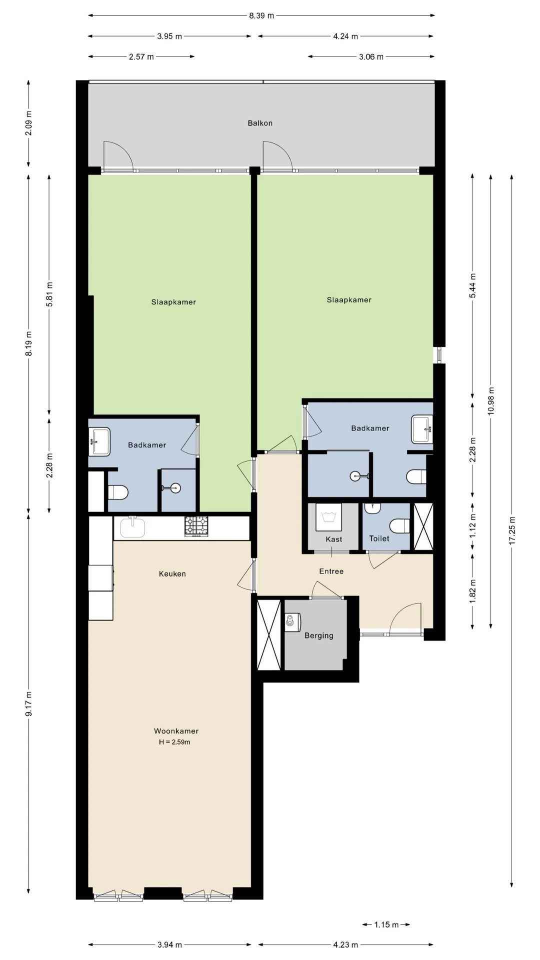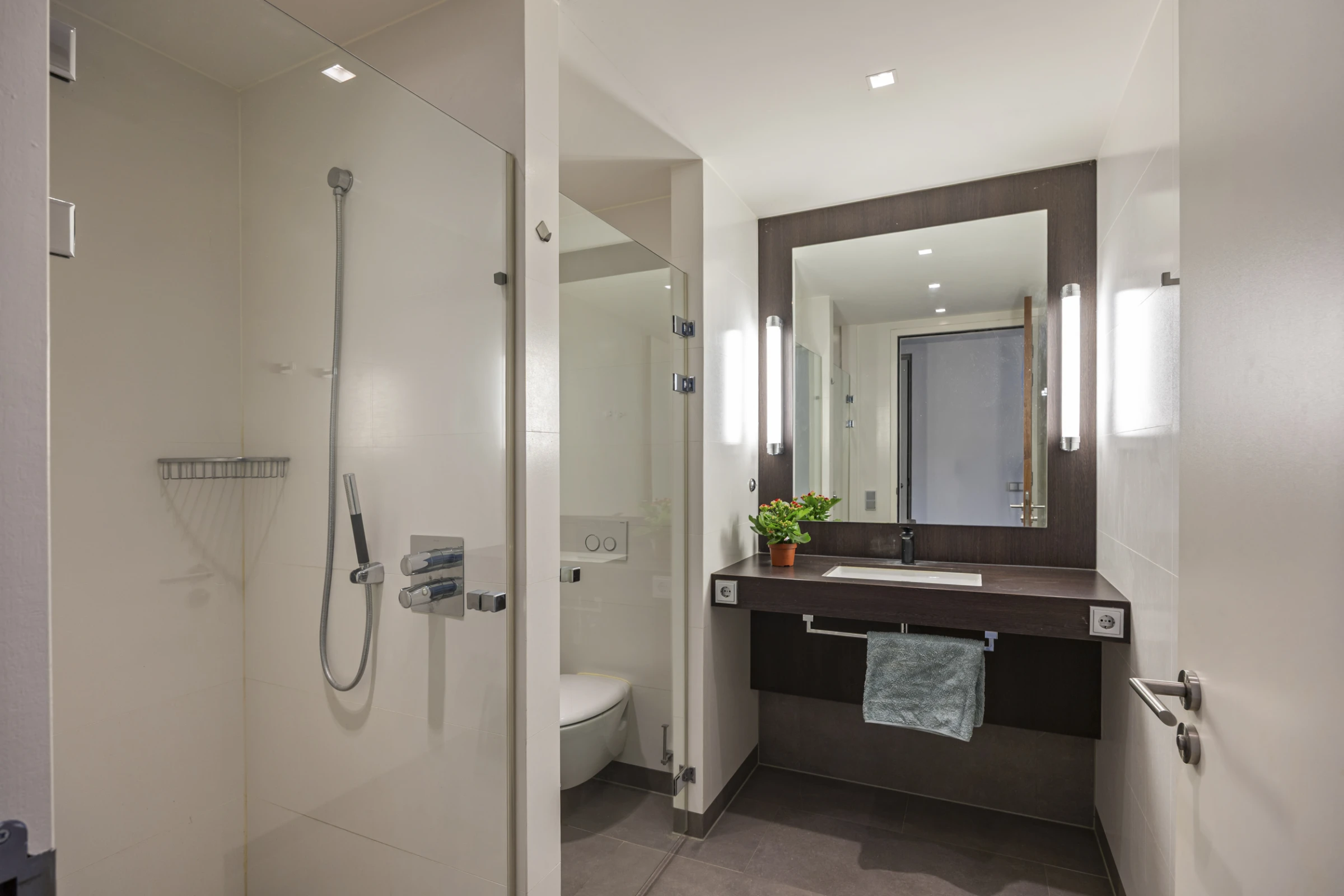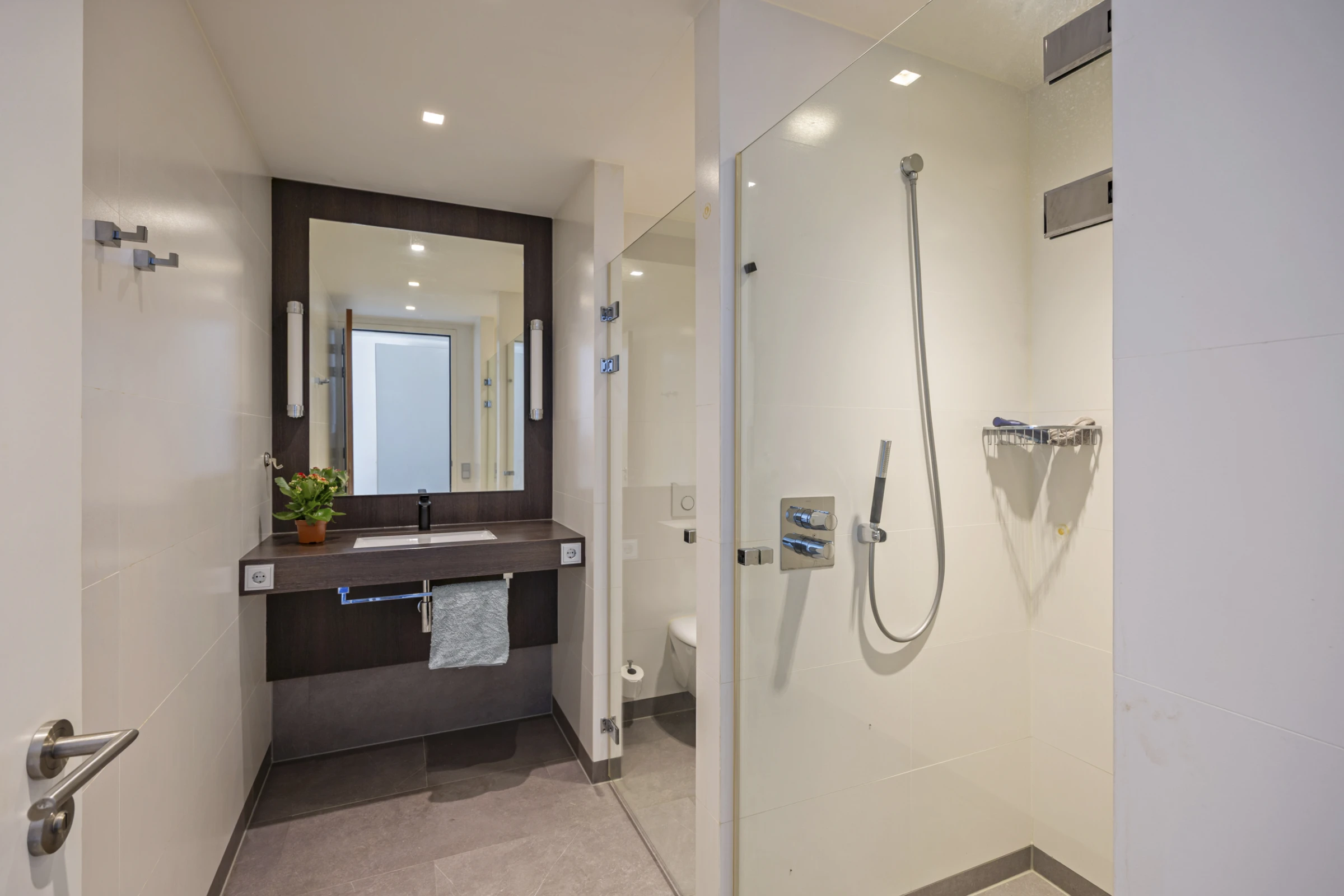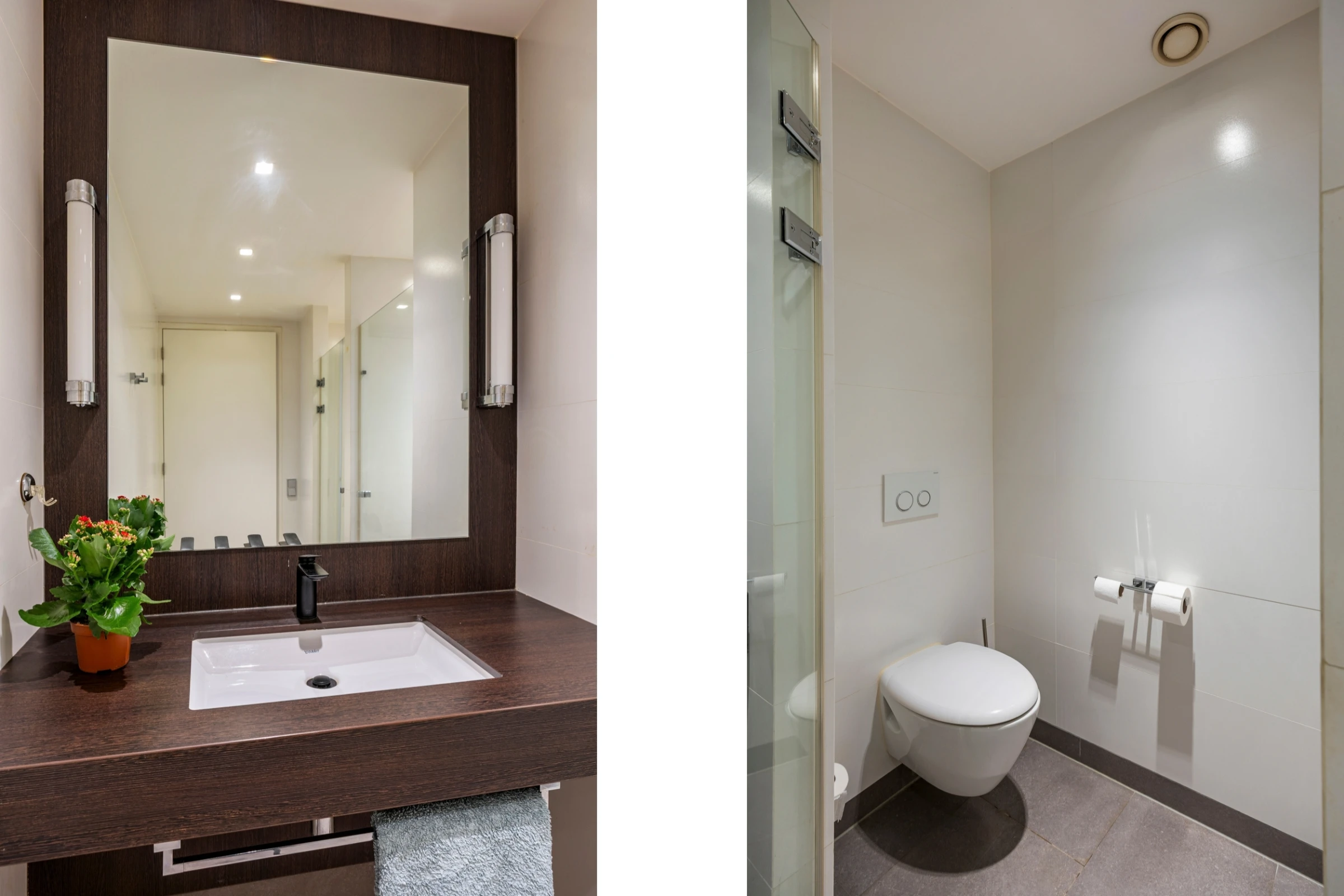 Vervolgens zijn via de hal de 2 badkamers en de 2 riante slaapkamers te bereiken. De 2 badkamers hebben beide een luxe niveau van afwerking, met o.a. een inloopdouche, wastafel en beide een eigen toilet. Van de beide slaapkamers is één momenteel in gebruik als zitkamer, c.q. extra woonkamer. Beide ruimtes hebben grote raampartijen tot vloerniveau met schuifpuien en een prachtige lichtinval door de ligging op het zuiden. Ook hebben zowel de hoofdslaapkamer, als de 2e slaapkamer (thans dus in gebruik als extra zitkamer) een vloeroppervlakte van maar liefst 23 m².