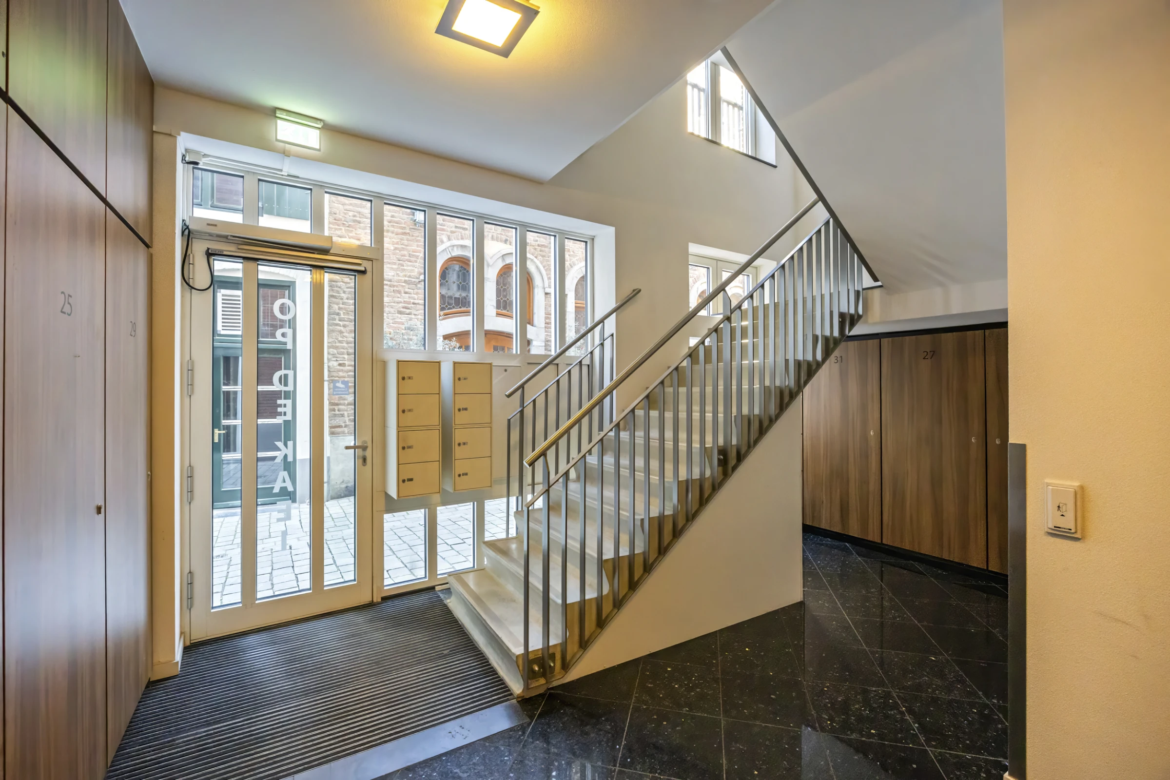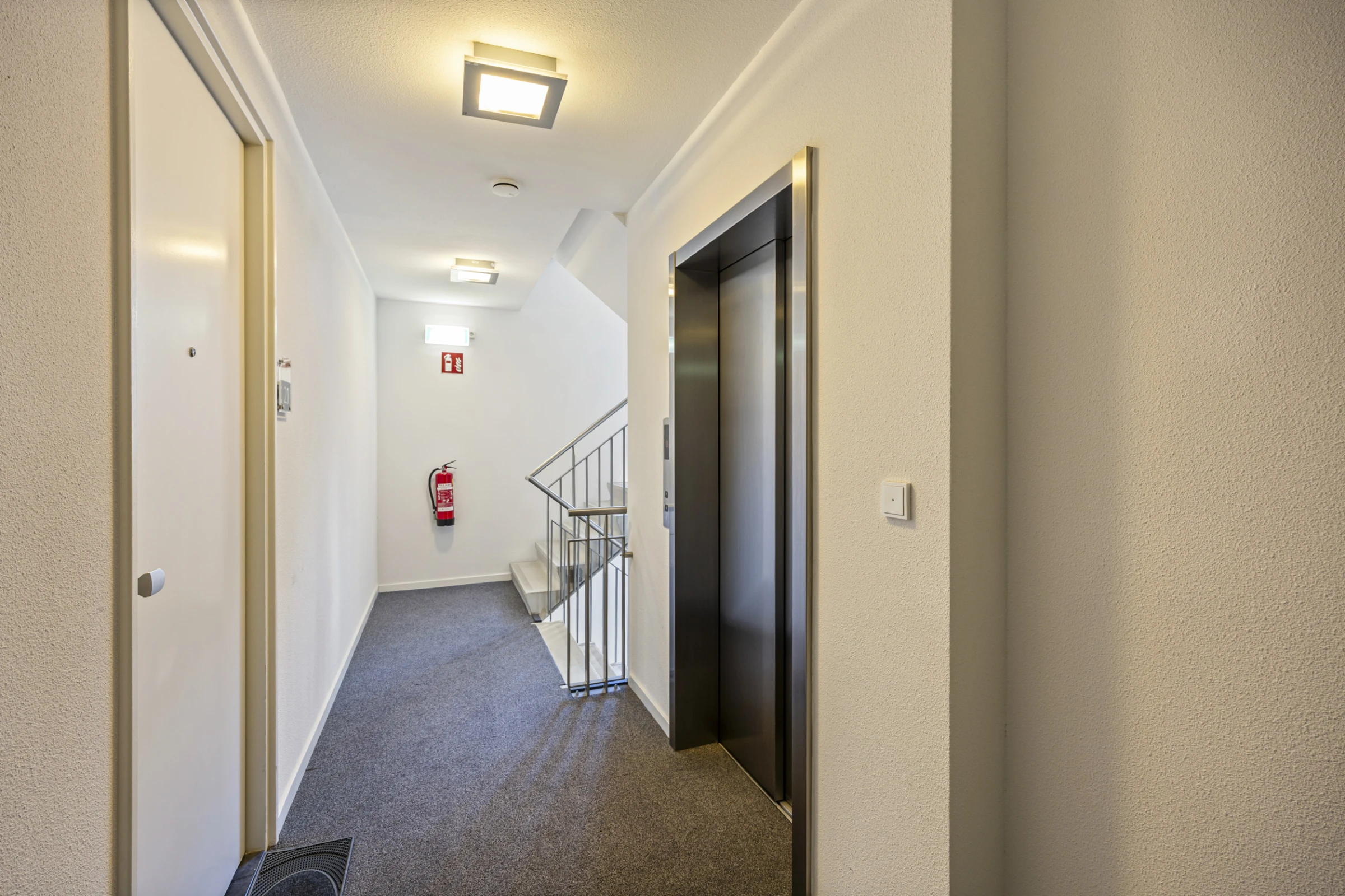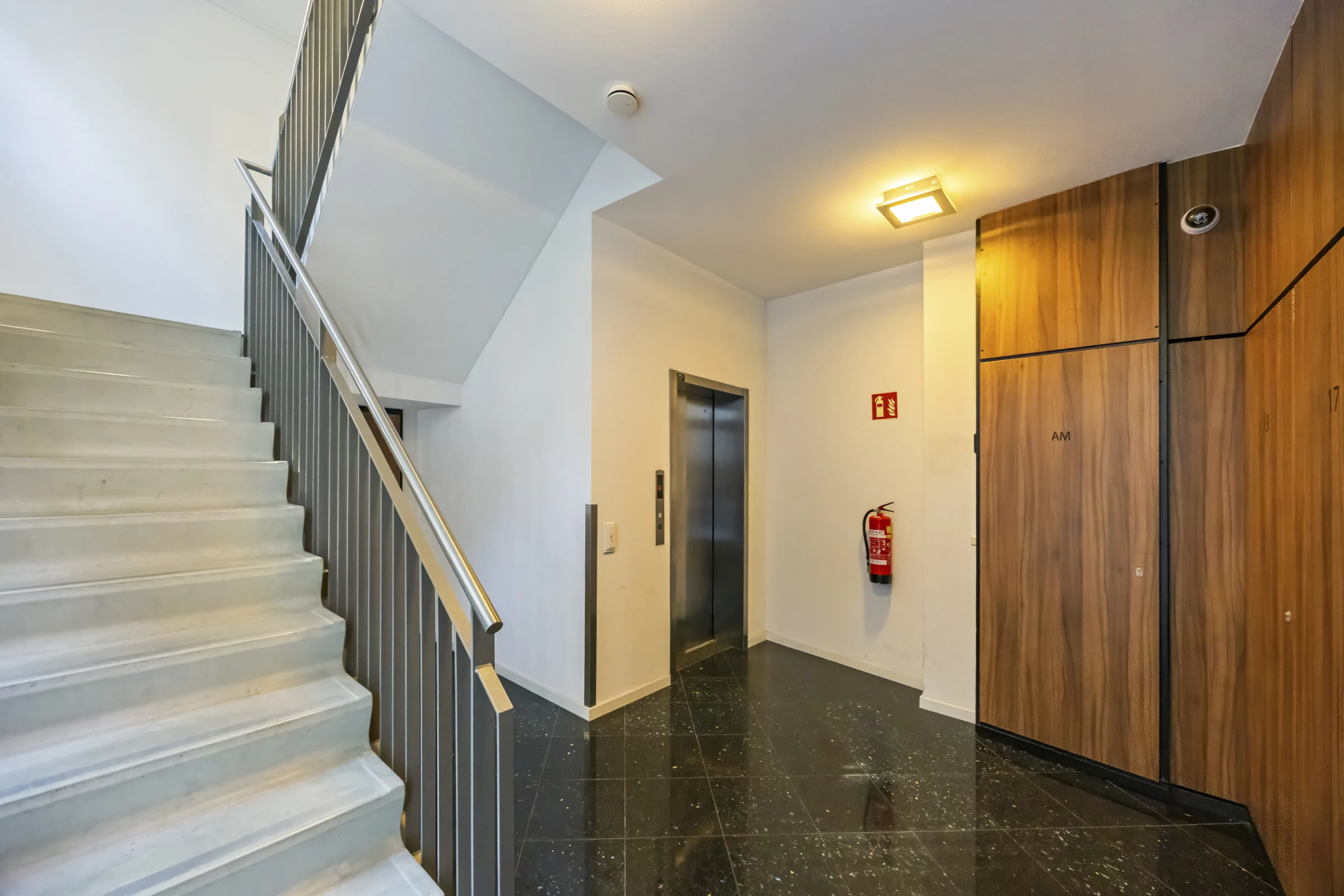 Centrale entreehal met brievenbussen, intercom en liftinstallatie. Verder ligt op de begane grond ook de centrale fietsenberging waar uitsluitend de bewoners in het complex gebruik van mogen maken.
