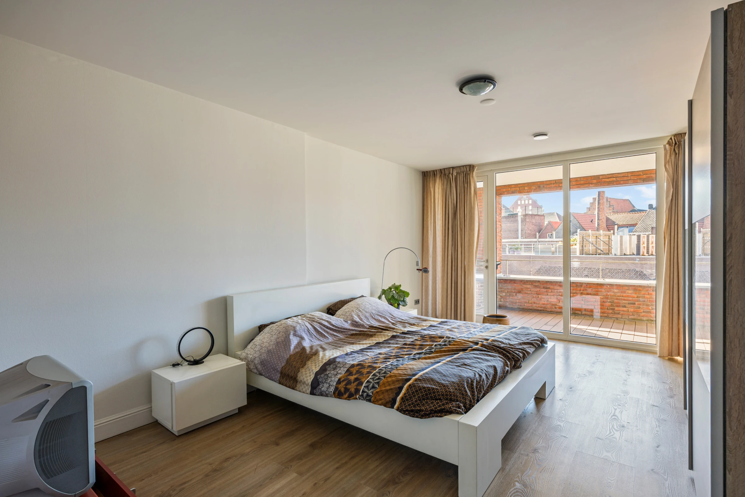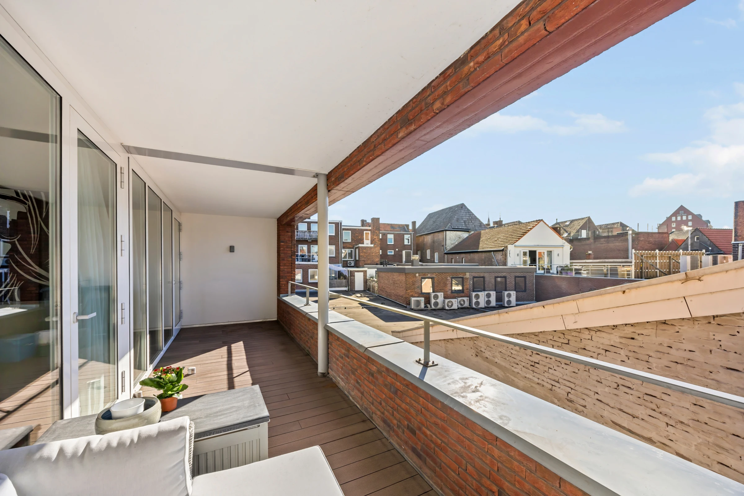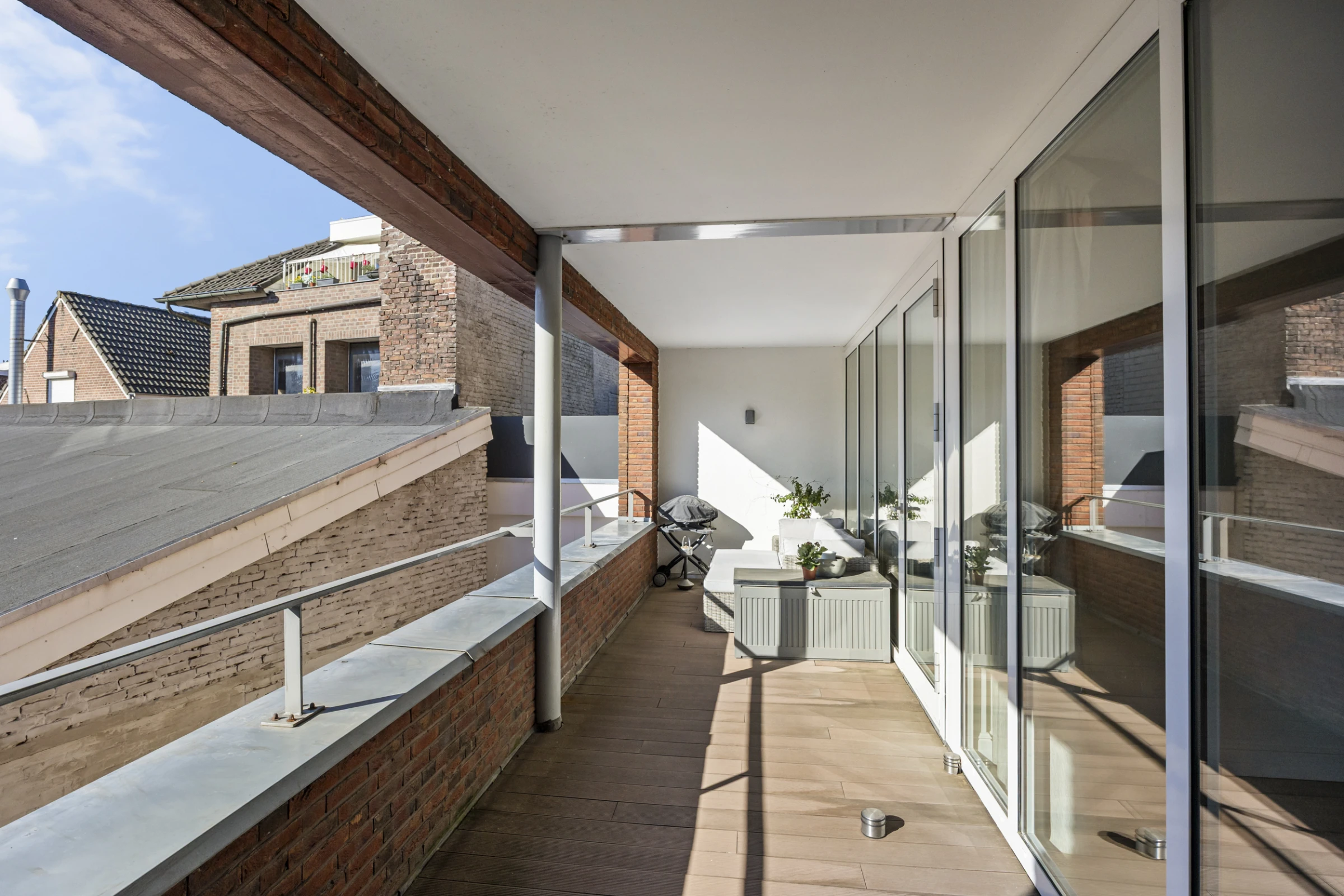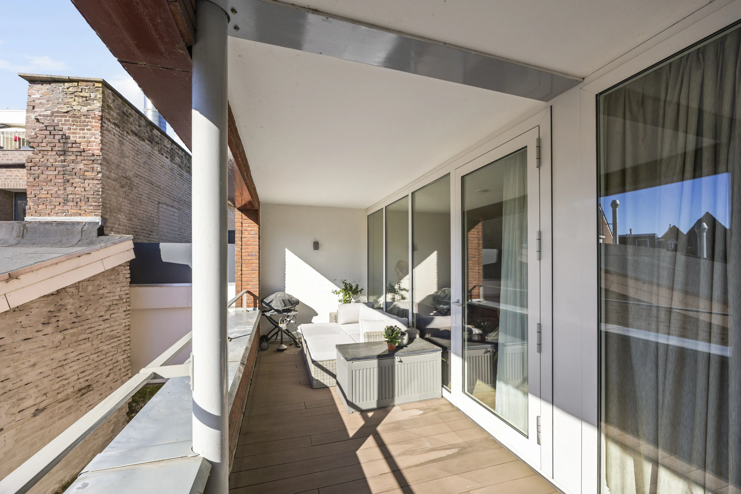 Vanuit deze beide kamers is de loggia toegankelijk. Deze prettige buitenruimte heeft een mooi uitzicht over de daken en dakterrassen van de binnenstad en is gelegen op het zuiden. De loggia meet een ruime 17 m² en biedt daardoor prima plaats aan een grote eettafel en daarbij nog een ruime loungehoek.