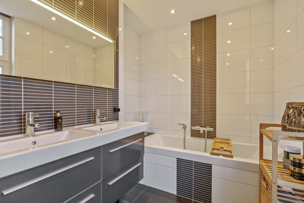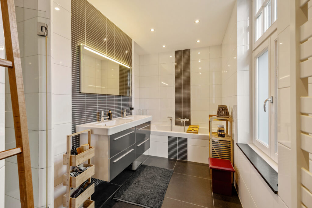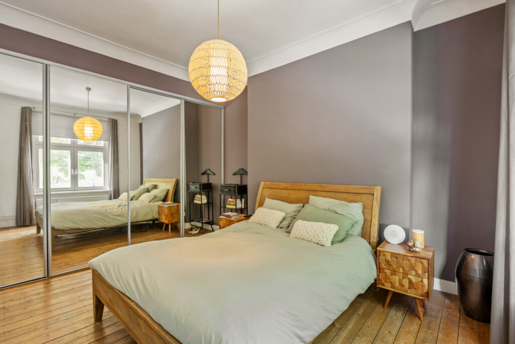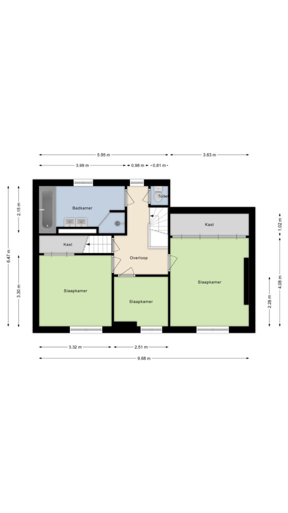 Via de overloop zijn twee ruime slaapkamers, een één-persoons slaapkamer, de moderne badkamer en een apart toilet te bereiken. Twee slaapkamers beschikken over praktische inbouwkasten en alle kamers hebben houten kozijnen met HR+ beglazing en houten vloeren. De badkamer is modern uitgevoerd en voorzien van een ligbad, inloopdouche en een wastafelmeubel met dubbele wastafel.
