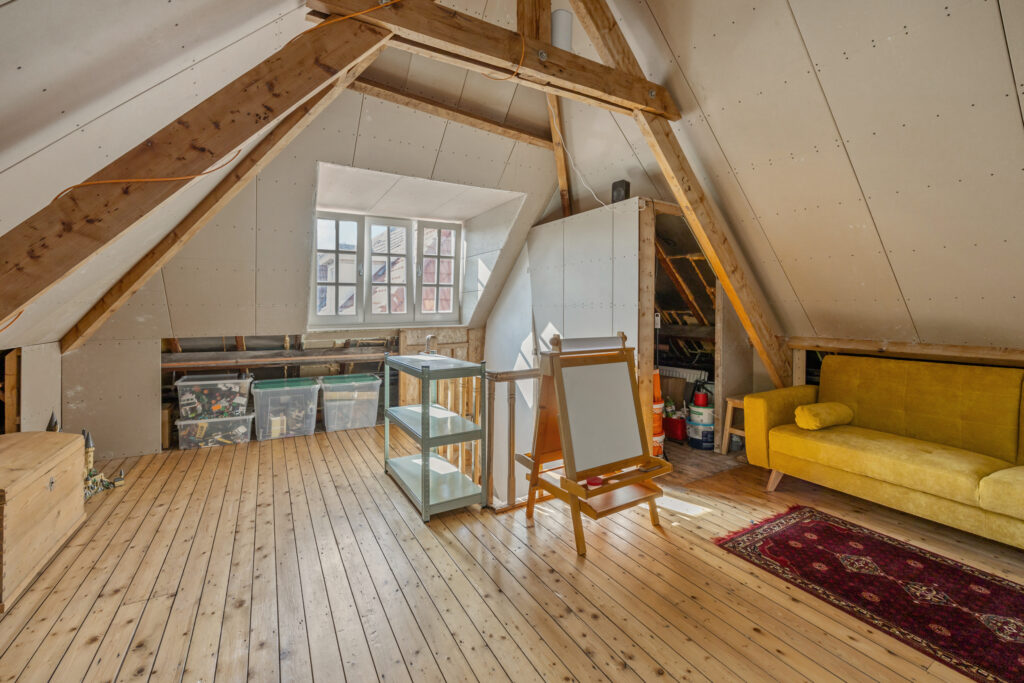 Via een vaste trap bereik je de royale zolderverdieping. Deze bestaat uit een mooie, open ruimte met houten dakbalken in het zicht. Verder is het dak geïsoleerd en voorzien van twee dakkapellen, ook weer met kozijnen met een fraaie kruisstijl. In deze ruimte is tenslotte nog een extra (slaap)kamer aanwezig, een vliering en een aparte berging, met daarin de CV combiketel (Nefit, 2018, eigendom). Door de mooie, open indeling is deze verdieping ideaal als thuiswerkplek, speelruimte voor de kinderen of hobbykamer te gebruiken.