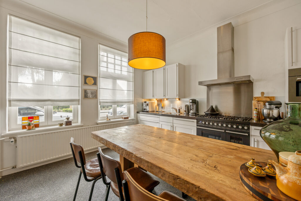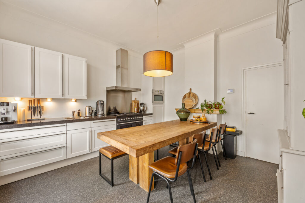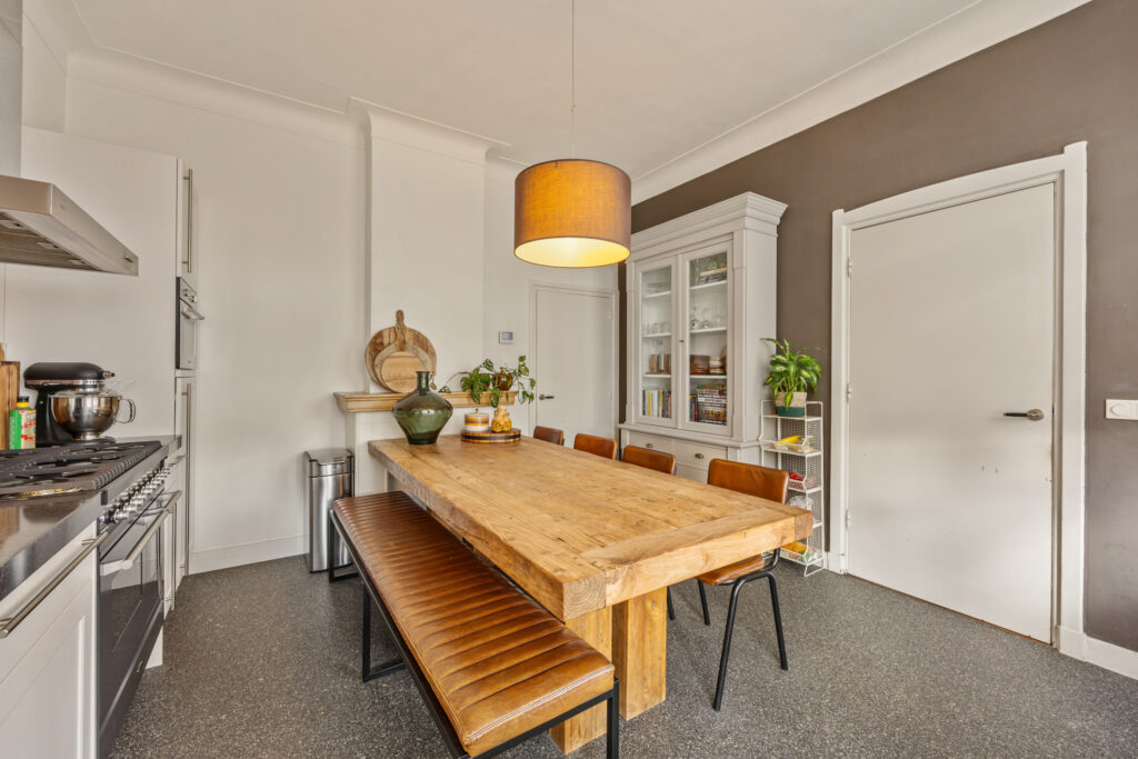 Bij de entree van dit herenhuis springt de stijlvolle terrazzo vloer meteen in het oog. In de hal bevinden zich de meterkast en het gastentoilet. De woonkamer heeft een authentieke indeling, een prachtige houten vloer en dubbele tuindeuren naar de tuin aan de achterzijde. De keuken is apart gelegen en voorzien van een nette opstand met natuurstenen blad en de volgende inbouwapparatuur: 6-pits gasfornuis met twee ovens, RVS afzuigkap, combi-magnetron, koelkast en vaatwasser. Vanuit de keuken is de bijkeuken bereikbaar, met aansluitpunten voor het witgoed en eveneens toegang tot de tuin.