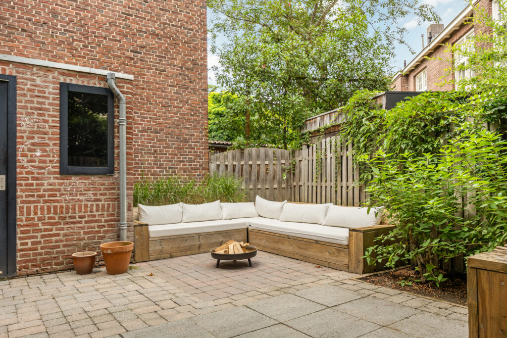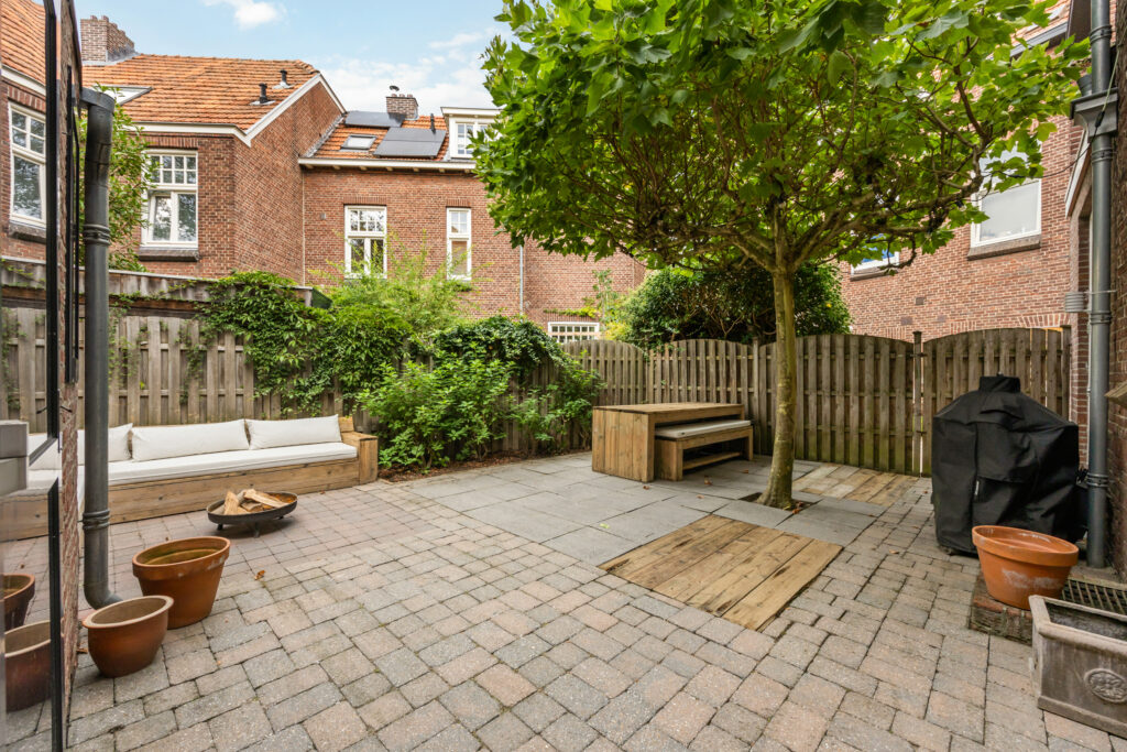 De stadstuin aan de achterzijde is onderhoudsvriendelijk aangelegd, met sierbestrating, een fraaie boom en voldoende plek voor een grote eettafel en loungehoek. De tuin is geheel omsloten en beschikt over een stenen berging.