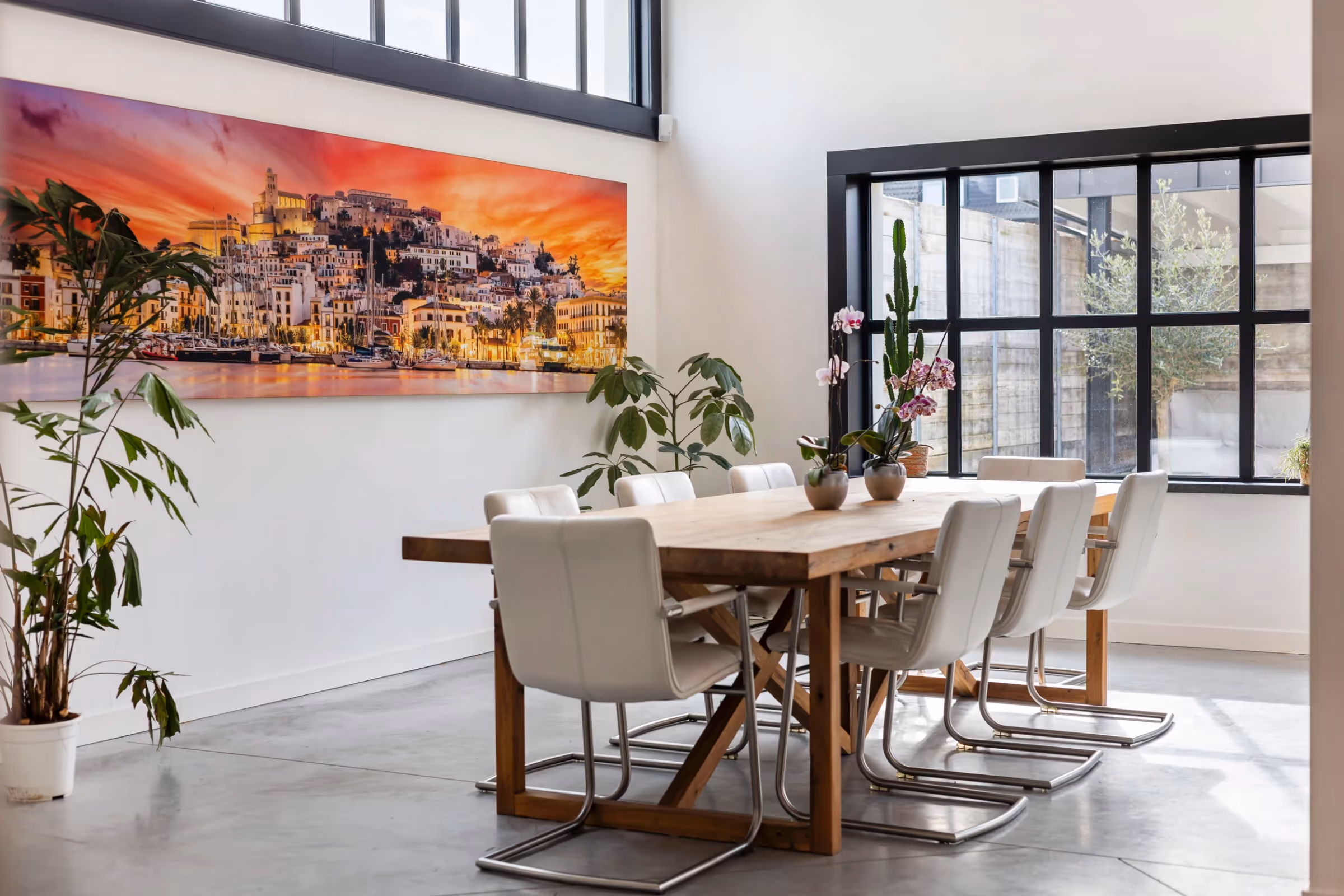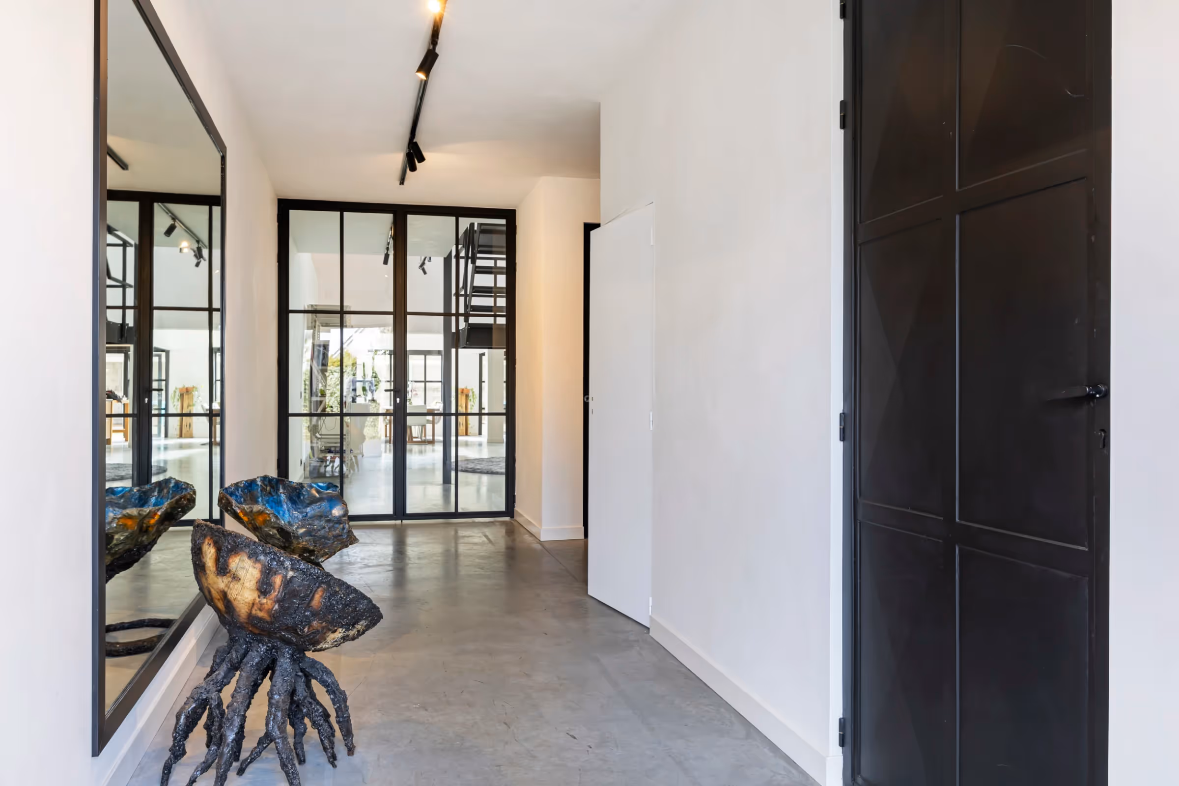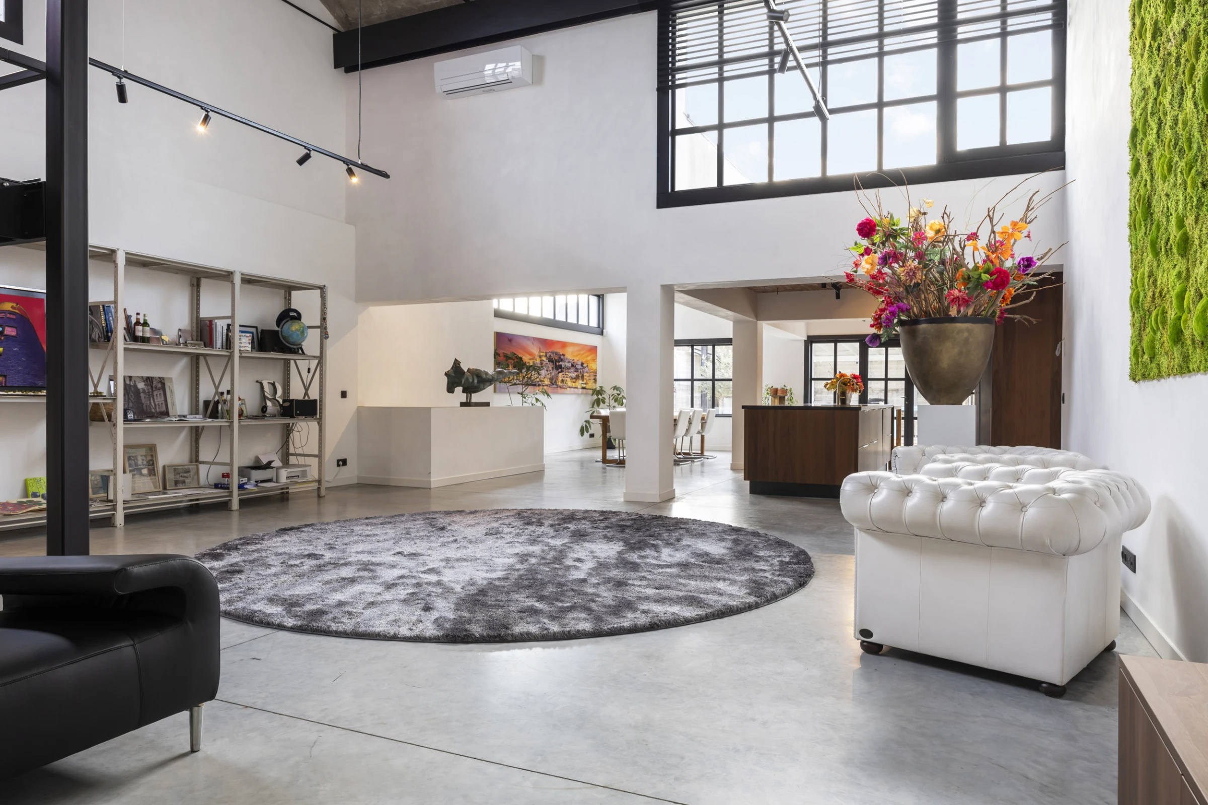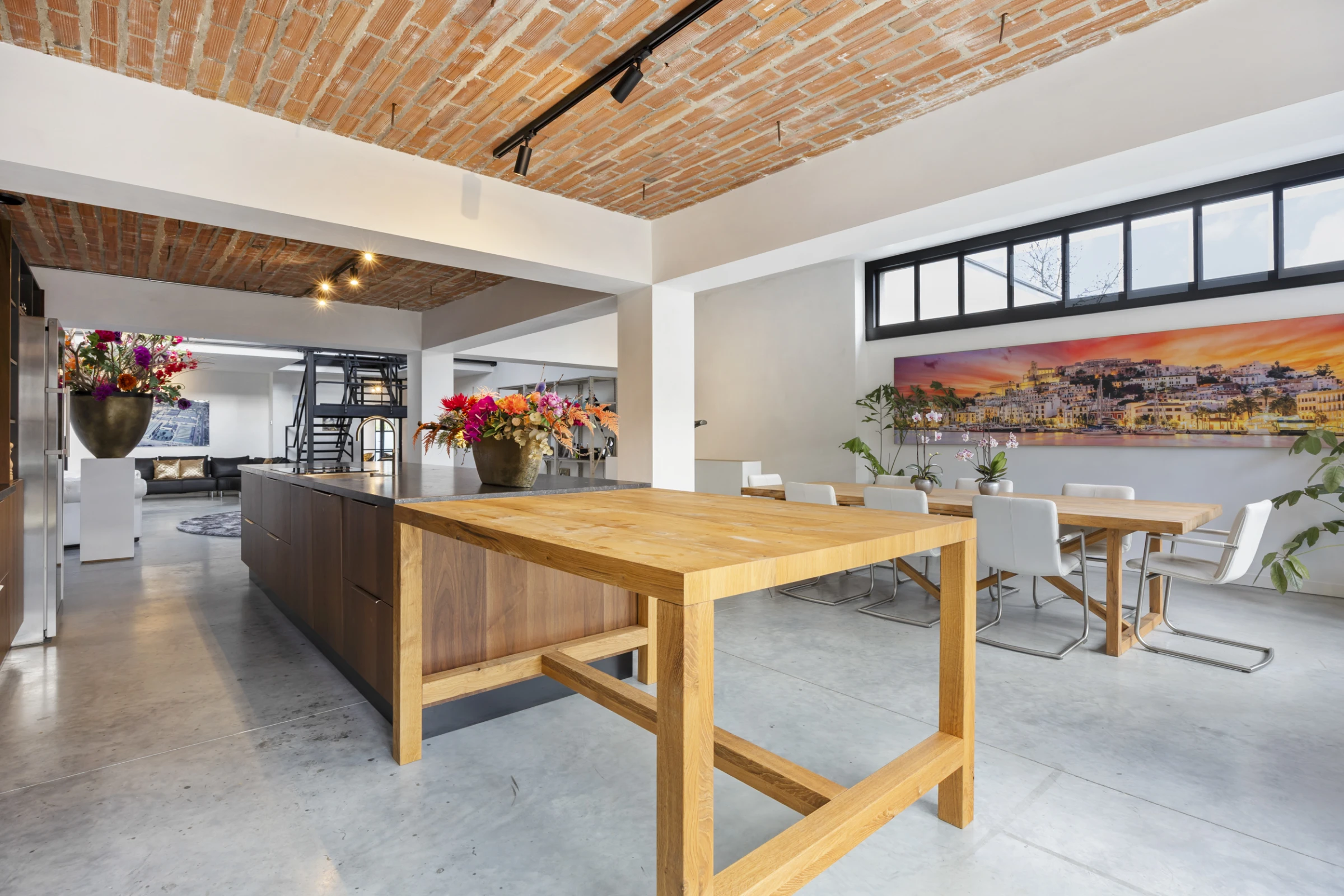 Bij binnenkomst valt direct de rauwe, industriële sfeer op. De combinatie van een fraaie betonnen vloer, de strak gestucte wanden en de stijlvolle, zwart stalen raampartijen doen je denken aan een woning in Manhattan.